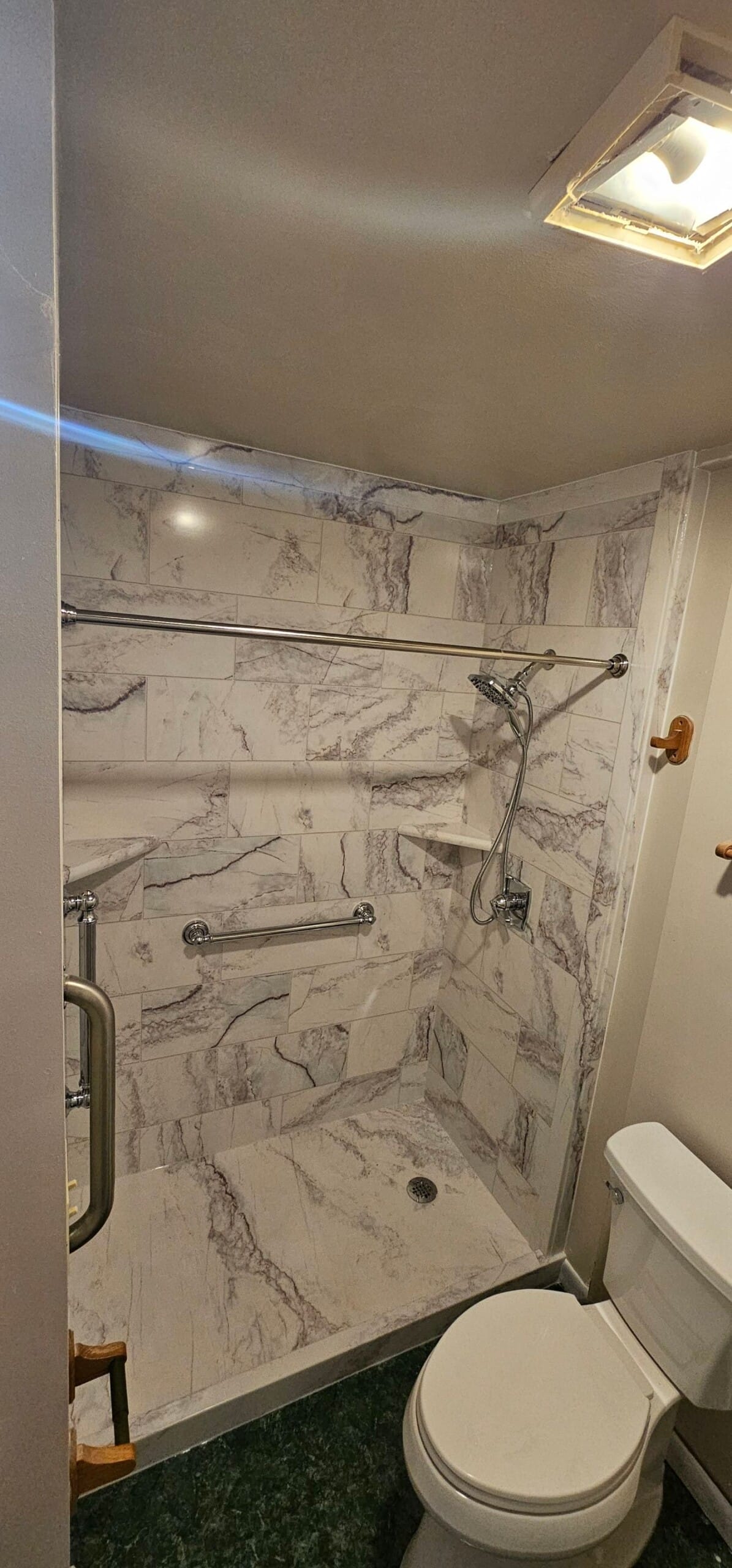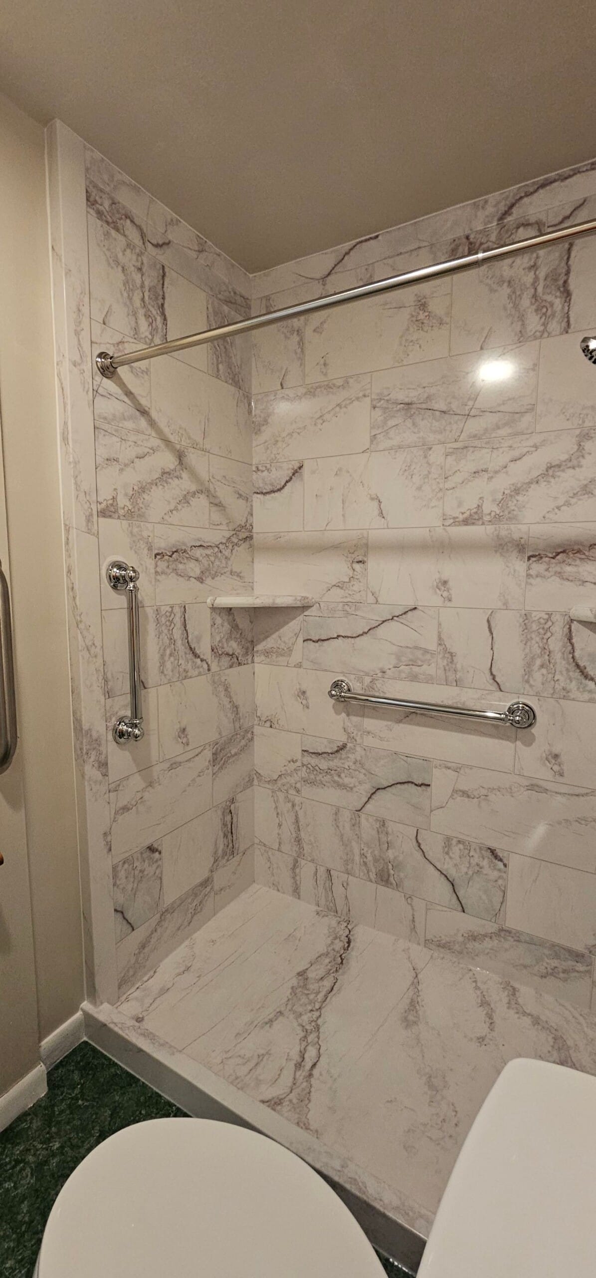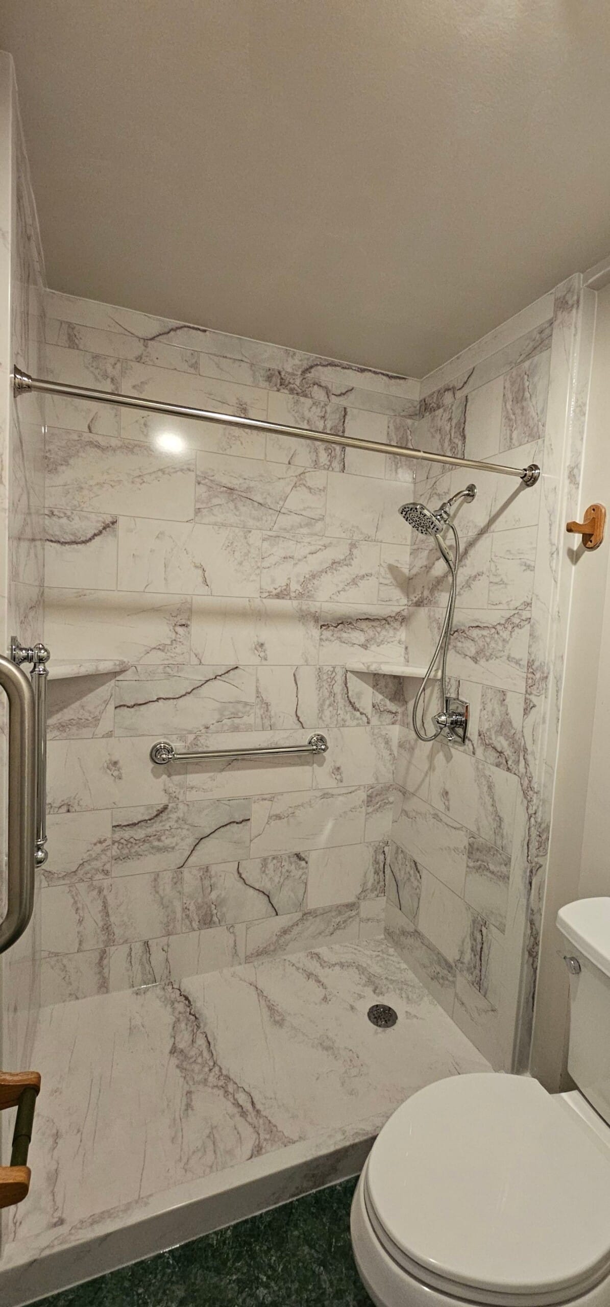 The Representative from Five Star Bath Solutions presented a walk-in shower solution designed for simplicity, safety, and low maintenance. Final selections reflected a light, neutral stone-pattern wall system consistent with the updated visuals, creating a brighter and more open appearance. Chrome fixtures were installed, including a fixed shower head with a handheld component for flexibility. The design incorporated integrated corner shelving for everyday storage and multiple grab bars positioned for stability. A clear glass sliding door enclosure was added to provide a finished look while maintaining openness within the space. The grout-free composite wall system was selected to eliminate ongoing maintenance concerns associated with traditional tile.