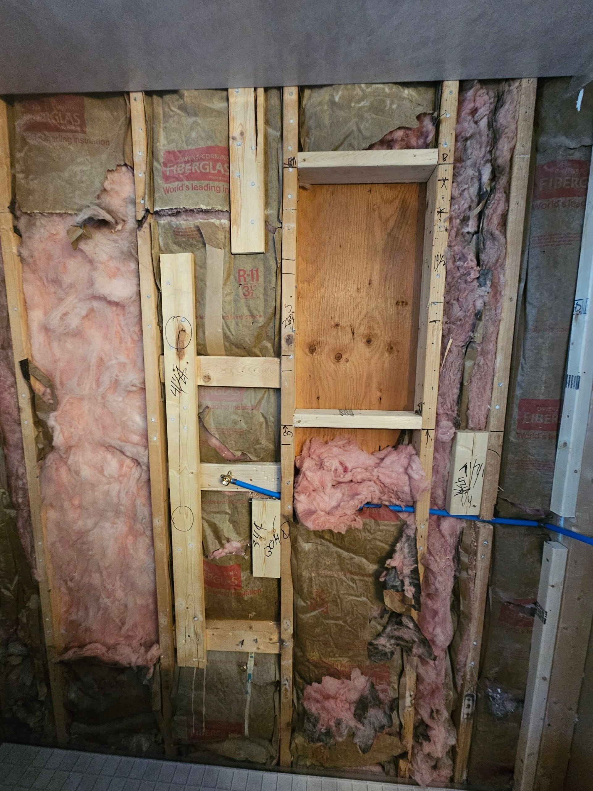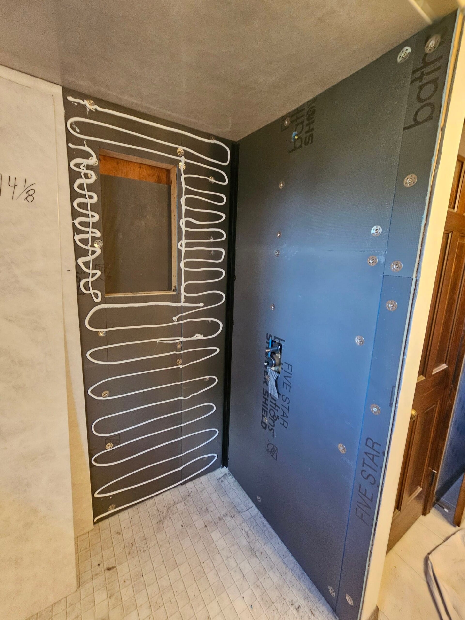 Materials included waterproof composite wall panels sealed at all seams with antimicrobial silicone, and a Dry Lock foam-core backer system for structural support and moisture resistance. The new shower pan matched the walls and included a low threshold for accessibility. Glass door installation was not selected for this phase, although the customer preferred frameless clear glass. Delta commercial-grade fixtures were used for both the main head and wand. A recessed wall niche offered internal storage, and the integrated bench provided seated comfort with structural tiling.