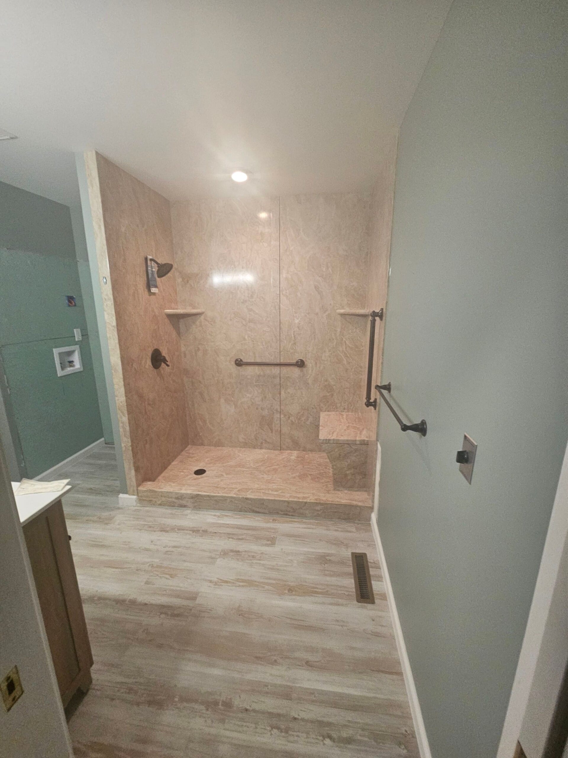 The original master bath contained a tiled deck-mounted jetted tub and a framed shower enclosure with outdated finishes. These were removed entirely and replaced with a single walk-in shower system featuring high-gloss, stone-pattern composite panels in a warm neutral tone. Matching panels were installed across all three walls and extended to the ceiling for full moisture protection. The custom-built base included a wide threshold and textured surface. A corner bench was added for seated use, and two corner shelves were installed symmetrically for storage. A brushed bronze grab bar was secured to the back wall for stability. Fixtures were upgraded to a matching bronze Delta head and handle set.