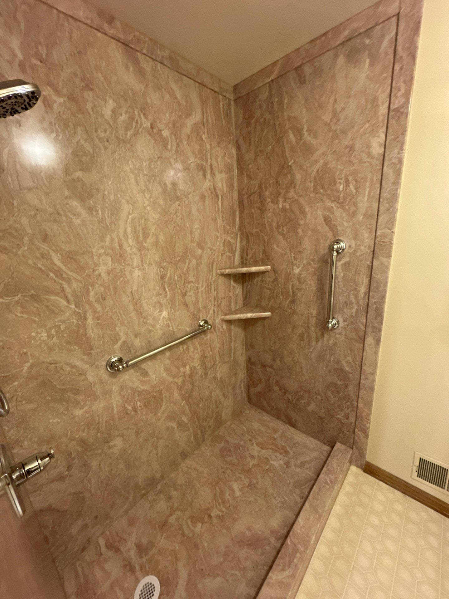 The Representative from Five Star Bath Solutions presented a walk-in shower solution using a grout-free composite wall system designed for durability and ease of maintenance. Final design selections reflected warm beige, natural stone-inspired wall panels consistent with the visual transformation, paired with brushed nickel fixtures for a clean and cohesive look. The shower included a fixed shower head combined with a handheld unit for flexibility, along with integrated corner shelving for storage. Safety and usability were enhanced with strategically placed grab bars and a built-in seating area, aligning with the customer’s request for comfort and long-term functionality. The company’s focus on bathroom-only remodeling and use of proprietary composite materials reinforced confidence in both performance and longevity.