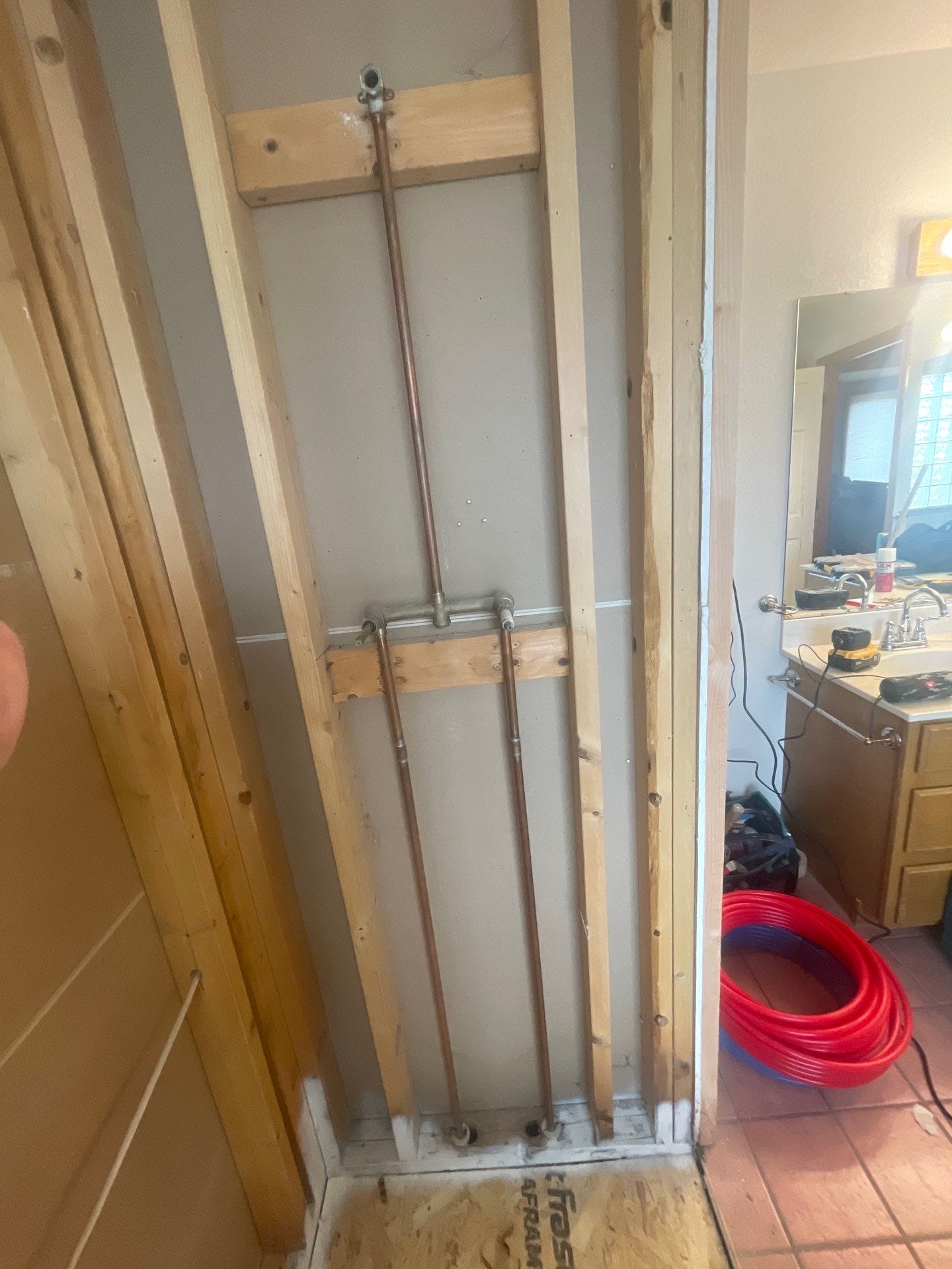 Installation included full removal of the previous framed shower enclosure, shower base, and aging wall materials to properly prepare the area for the new system. After demolition, the shower area was inspected and prepared with a waterproof backer system designed to protect the structure from long term moisture exposure. A new low threshold shower base was installed followed by custom cut composite wall panels and integrated corner shelving. The chrome shower fixture system and glass enclosure were then installed and aligned before final cleanup and completion of the project.