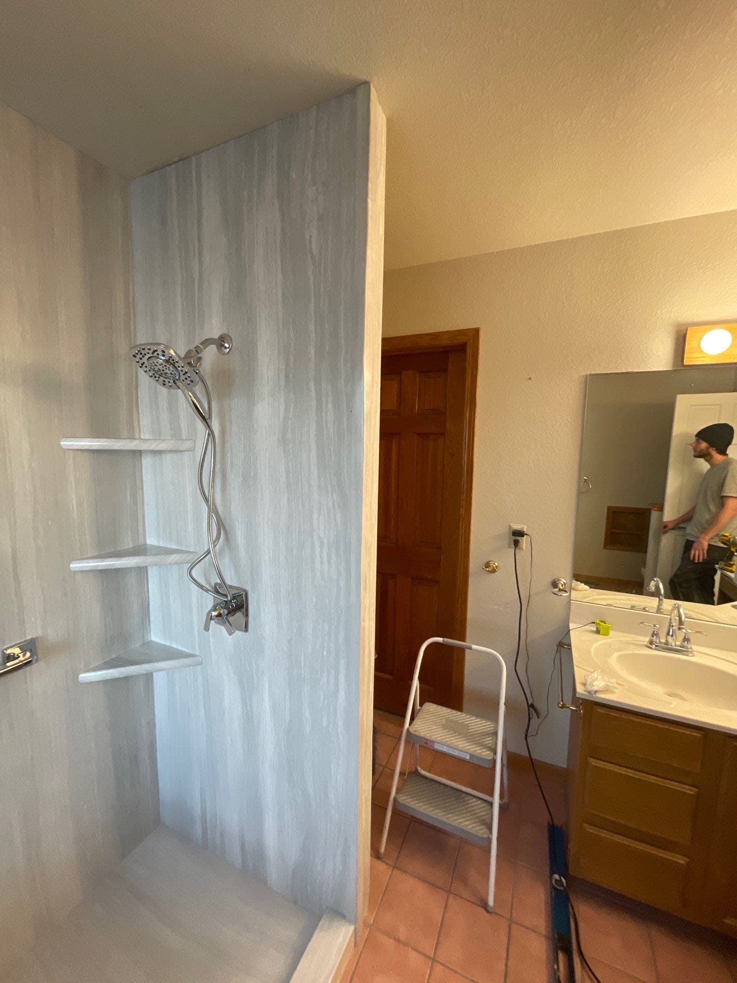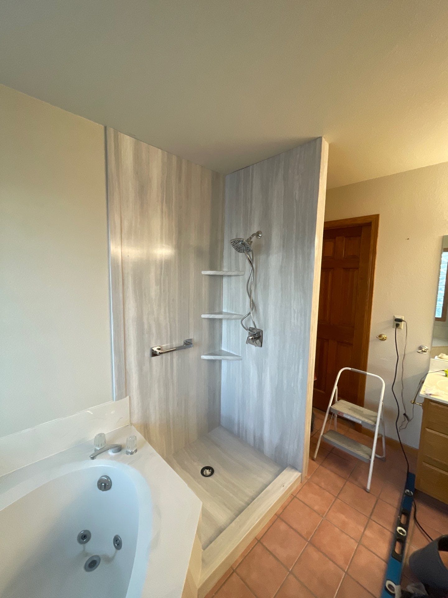 The Five Star Bath Solutions representative presented a grout free composite wall system designed to provide durability, moisture resistance, and simplified maintenance compared to traditional tile installations. The selected wall panels feature a light gray vertical stone pattern that delivers a modern appearance while maintaining a neutral tone that complements the surrounding bathroom finishes. Chrome shower fixtures were installed including a handheld shower system, and integrated corner shelving was incorporated for convenient storage. A frameless glass shower enclosure with chrome hardware was introduced to create a more open and modern appearance while allowing natural light to move through the space.