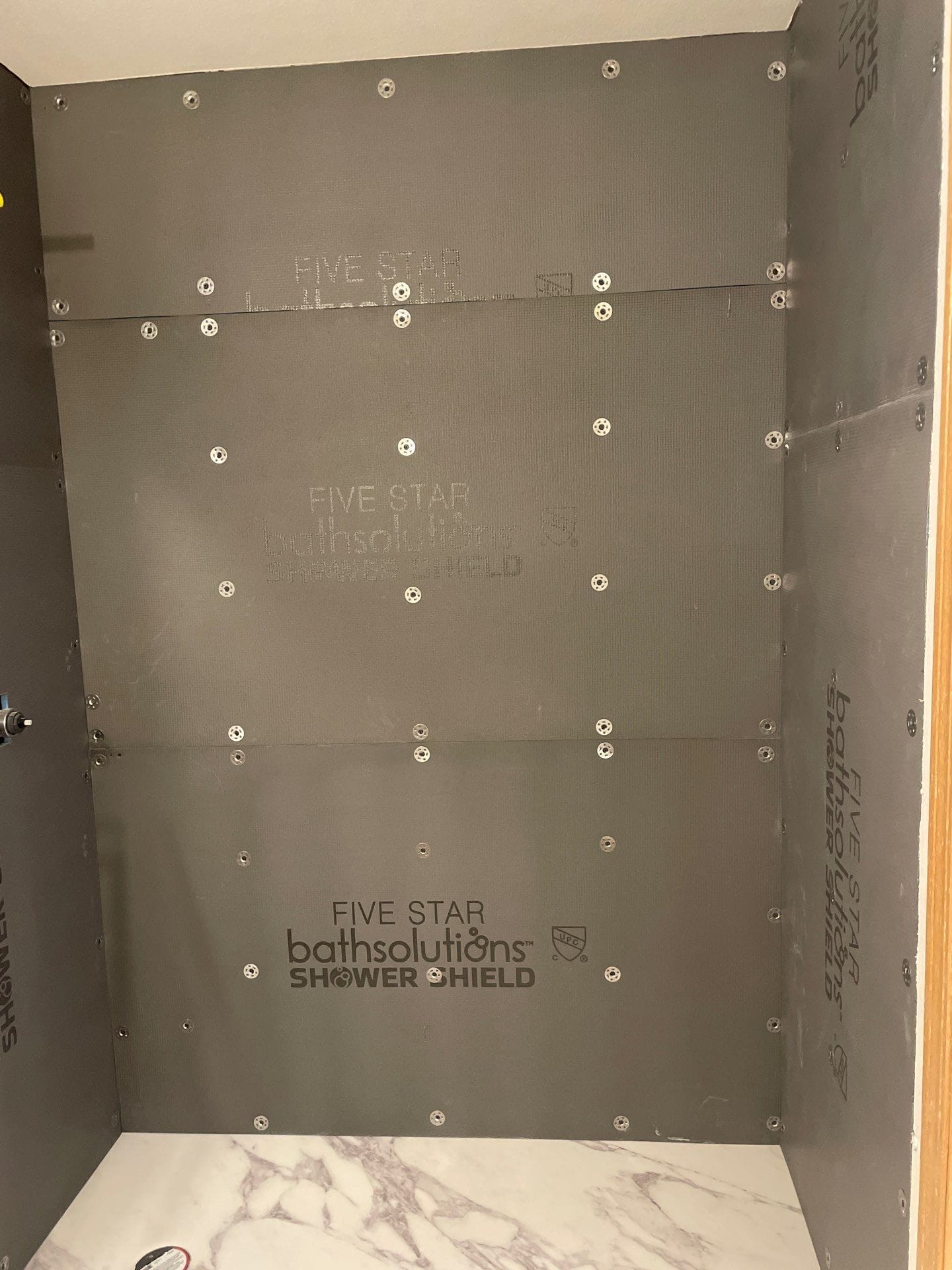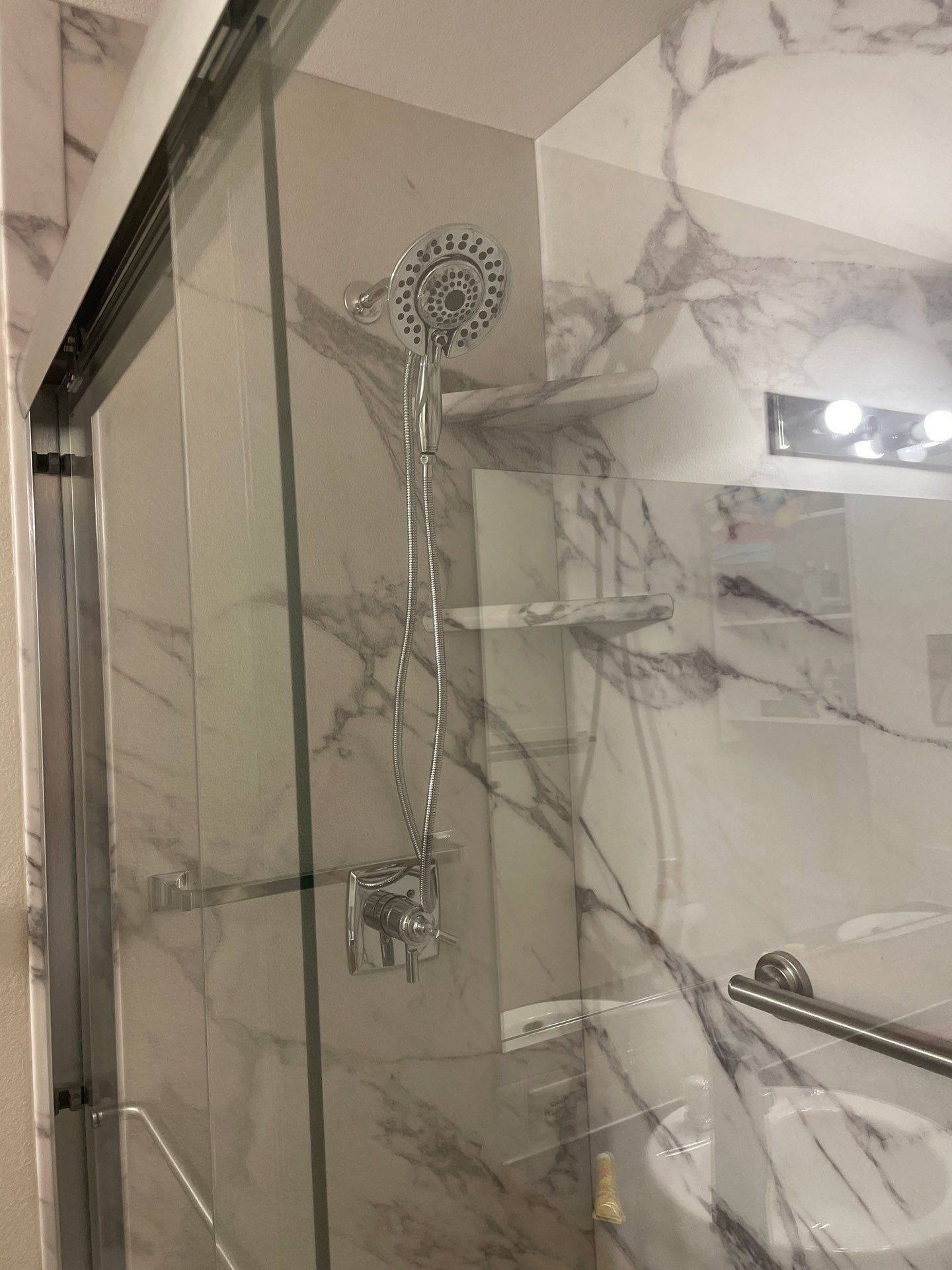 Though a formal installation overview was not outlined in the discussion, the remodel’s visual results confirm the implementation of a full tub-to-shower conversion. The updated space features a marble-style wall system, sliding glass doors, a modern handheld shower wand, and built-in shelving. The layout remains within the original alcove footprint but now features upgraded composite panels and dual grab bars, emphasizing both safety and visual appeal. The choice of materials visibly addresses concerns about water resistance and long-term performance.