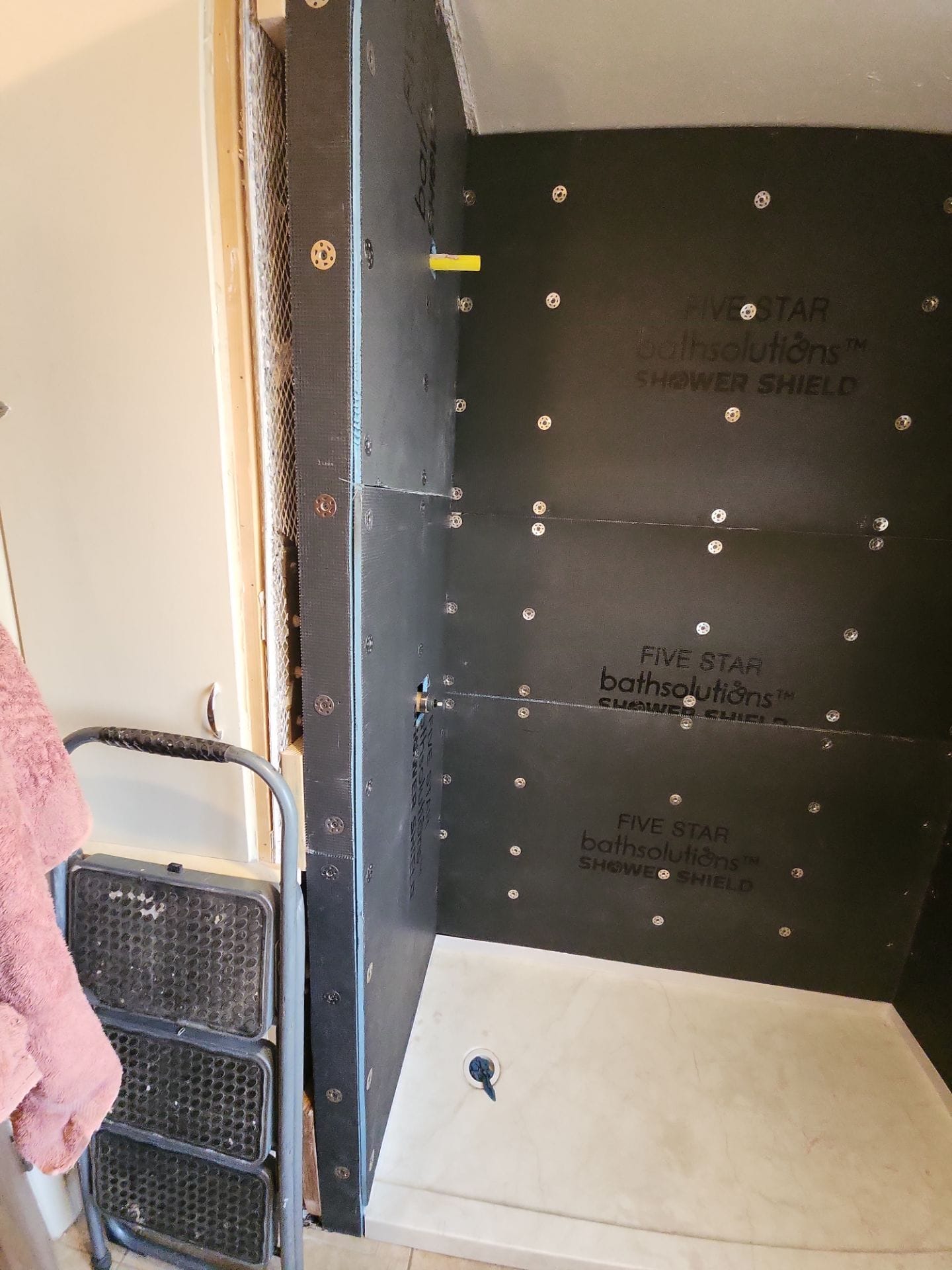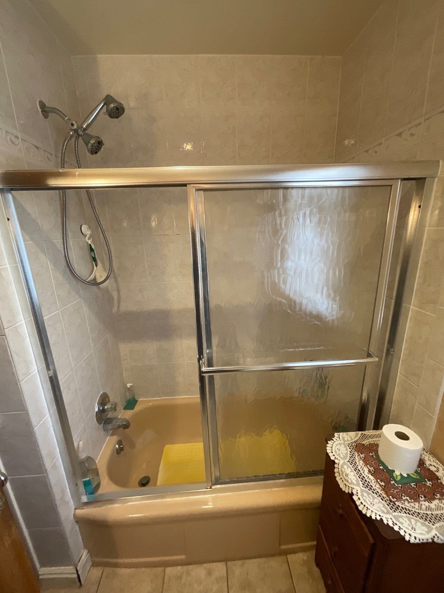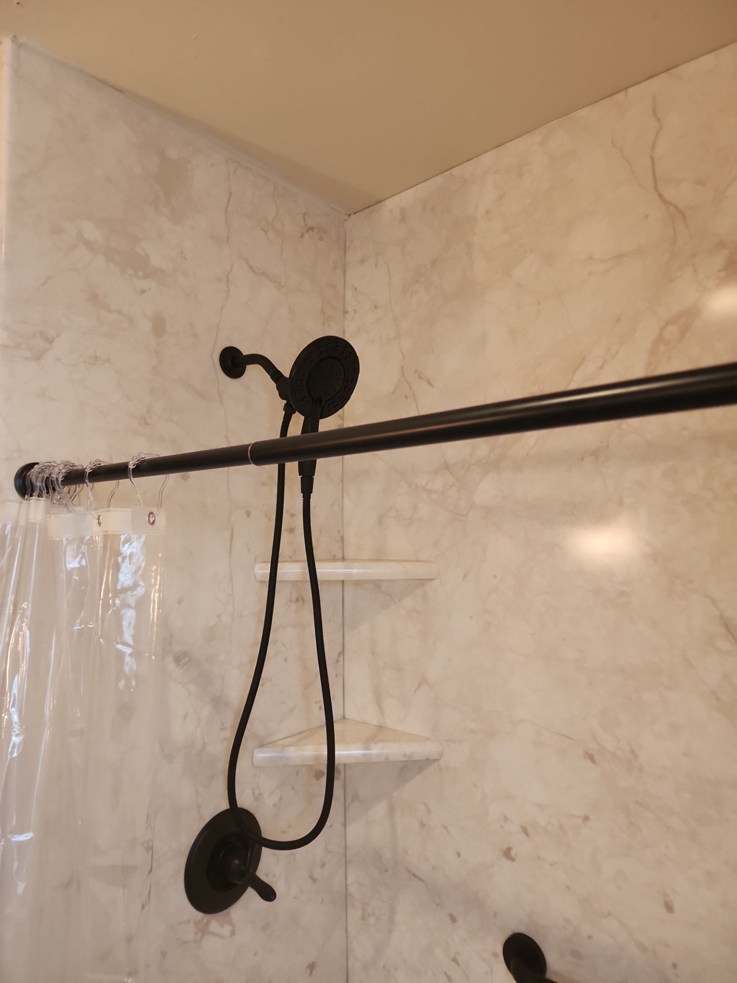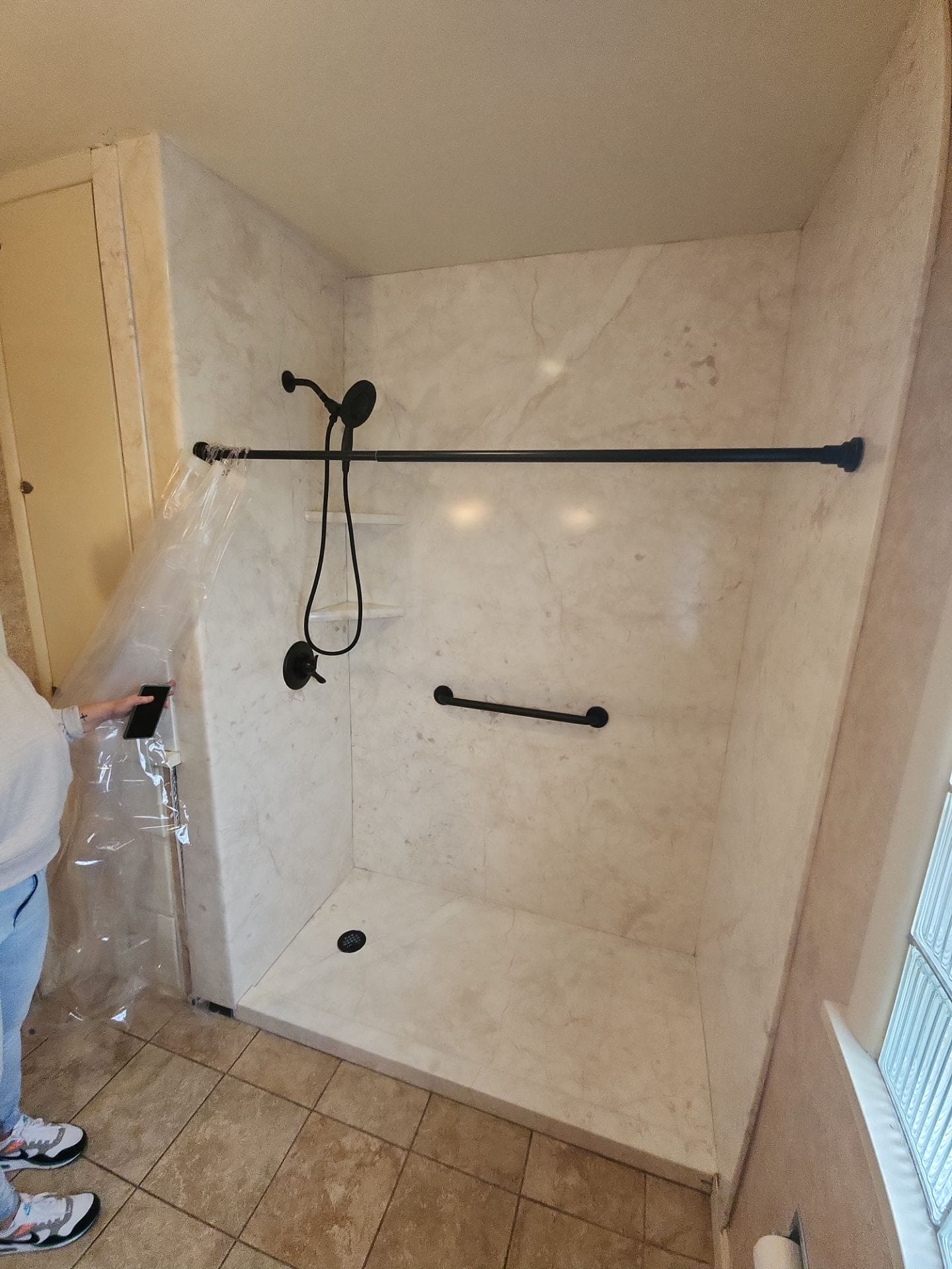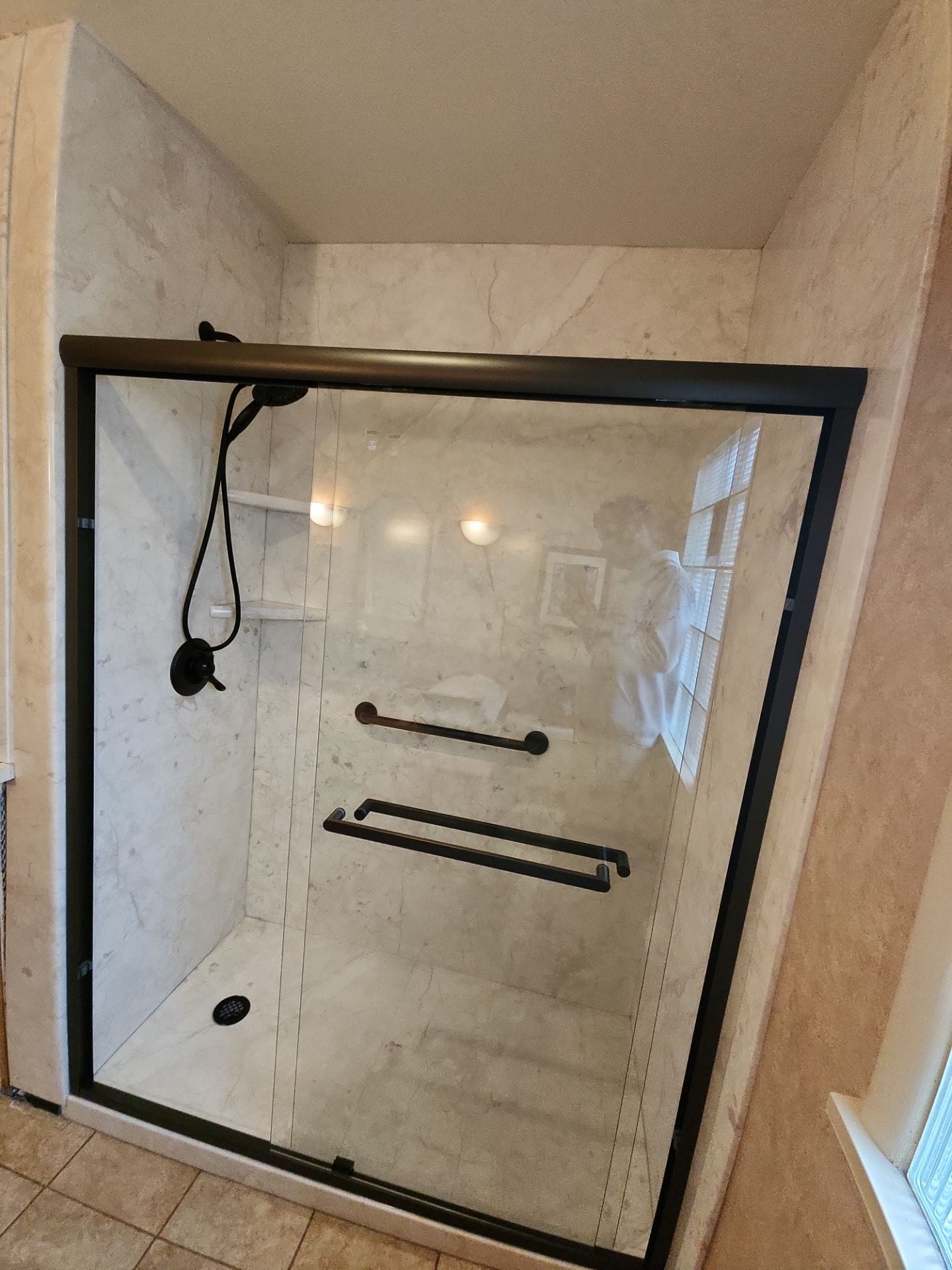 Although the discussion transcript did not include a formal overview of the installation process, the completed remodel visually confirms a full tub-to-shower transformation. The updated design includes a marble-style composite wall system, dark-framed sliding glass doors, and a handheld shower wand positioned with functional intent. Grab bars were securely installed, including one horizontal bar along the back wall and a secondary bar on the door, reinforcing safety. Built-in shelving was added for storage, and all materials appear selected to minimize water retention and wear, directly aligning with the customer’s desire for a cleaner, more reliable shower environment.
