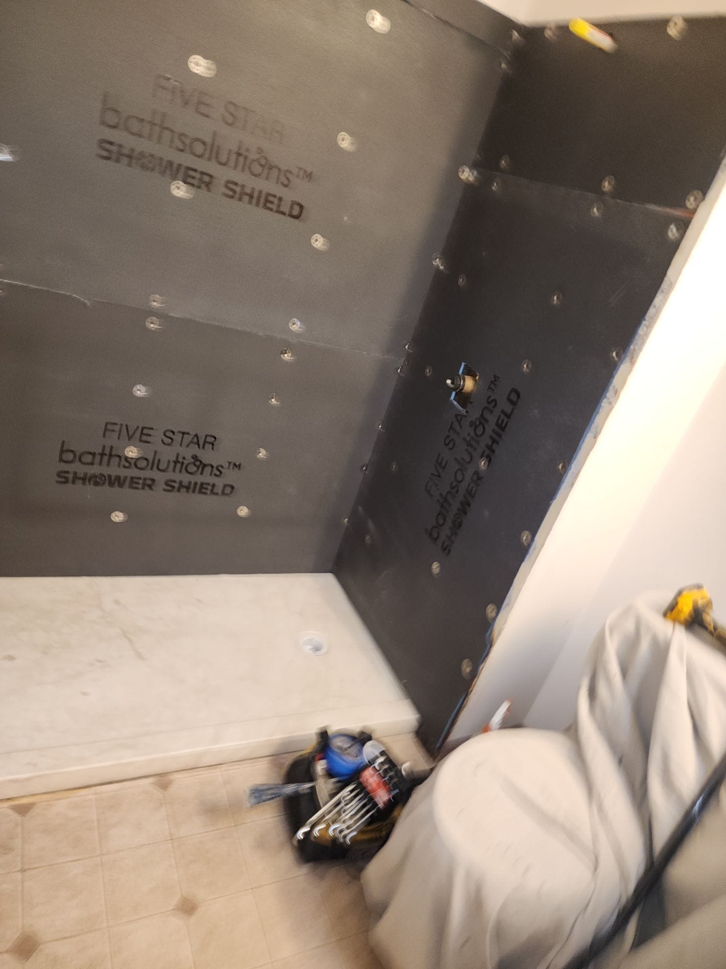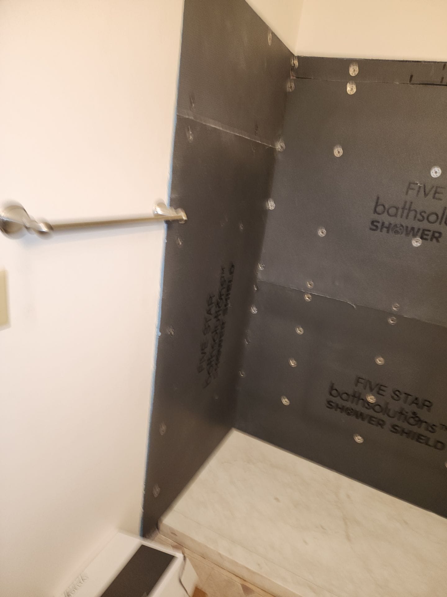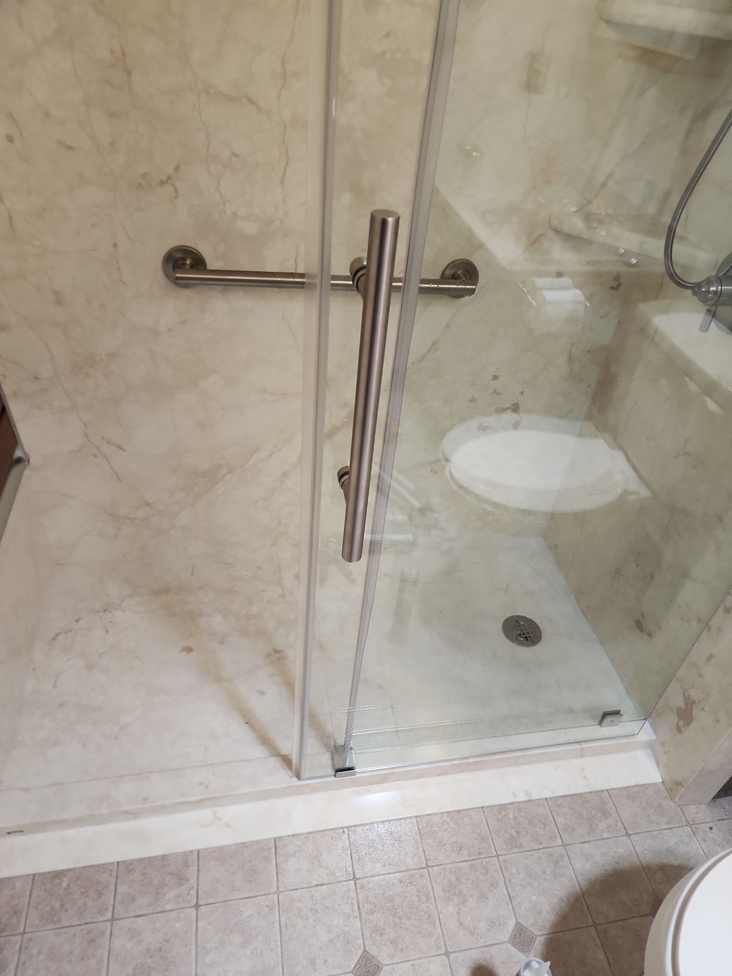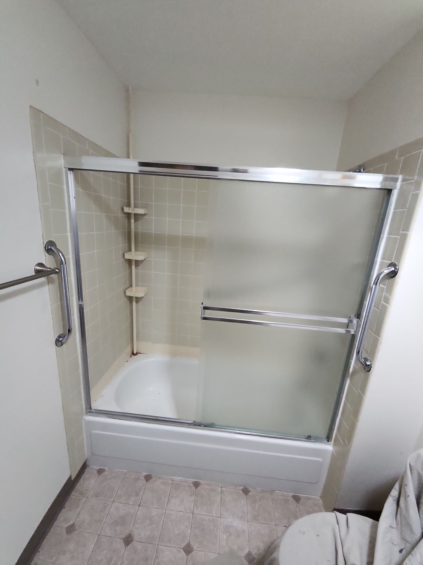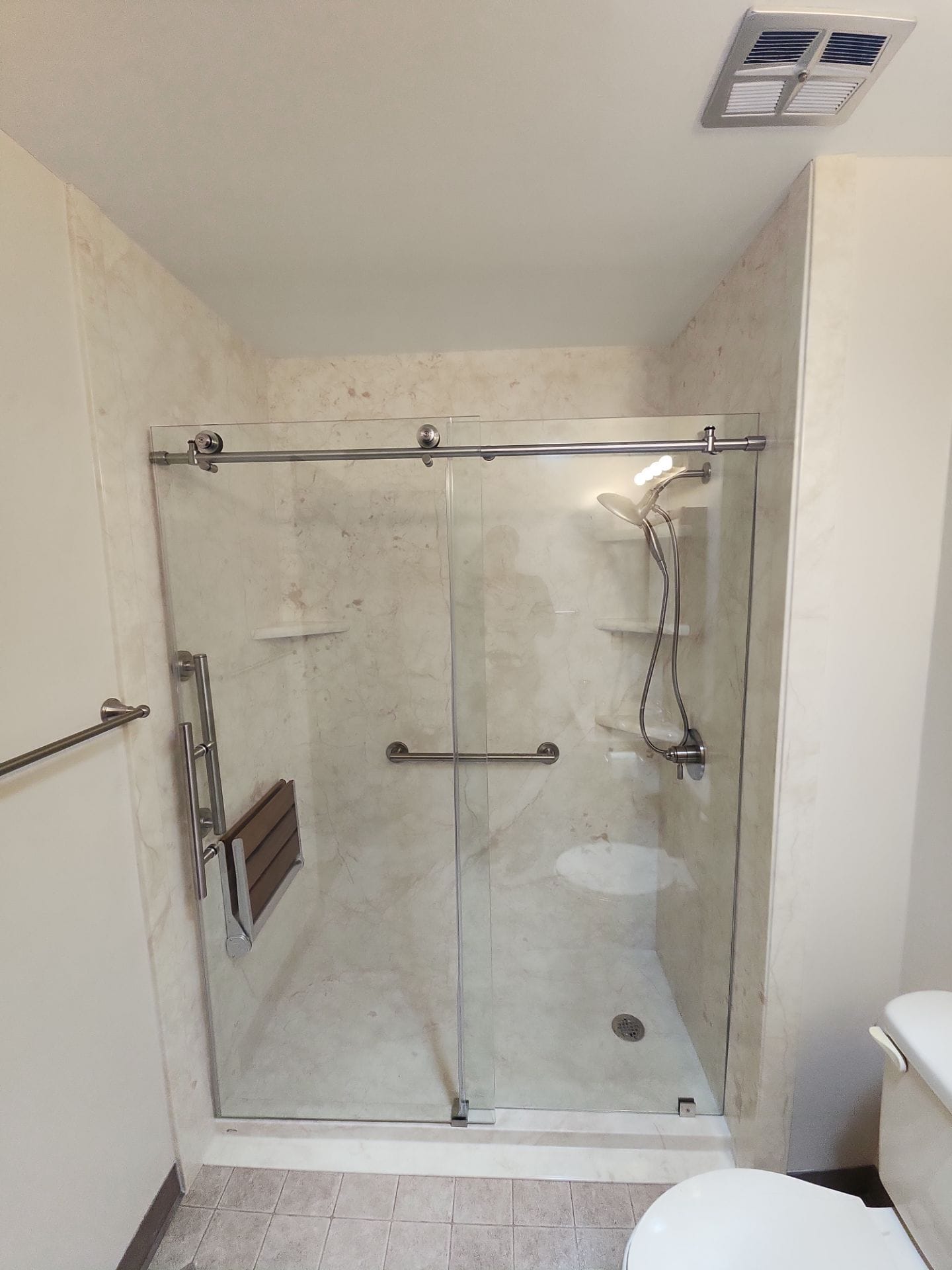 Installation was completed in approximately two days after a production manager finalized measurements and confirmed placement of safety features. The updated shower base features a three-inch step with a textured surface for slip resistance. All work was handled by licensed, W2-employed installers.