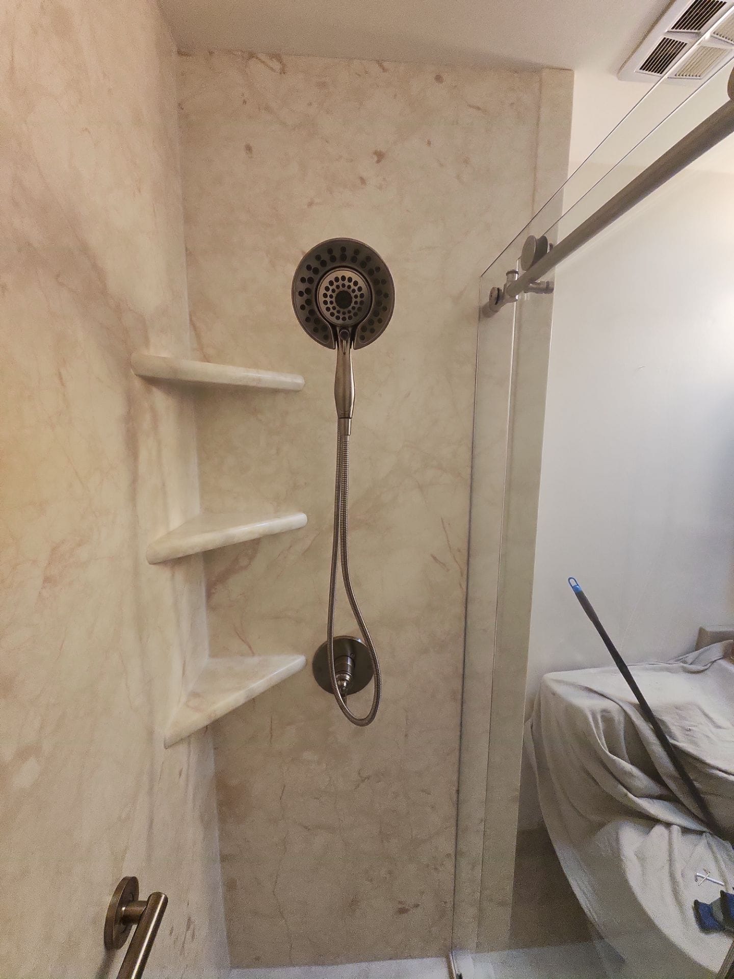 Ted McCann of Five Star Bath Solutions oversaw the consultation and guided the redesign to meet safety goals. Seamless Smart Composite panels were selected, offering mold resistance and an easy-clean surface. Installation included full removal of the tub and tiled walls, replacement of plumbing, and use of Five Star’s proprietary inorganic backer board. The customer’s configuration incorporated recessed storage, clear glass doors, and a wall-mounted handheld shower from Delta’s commercial line.