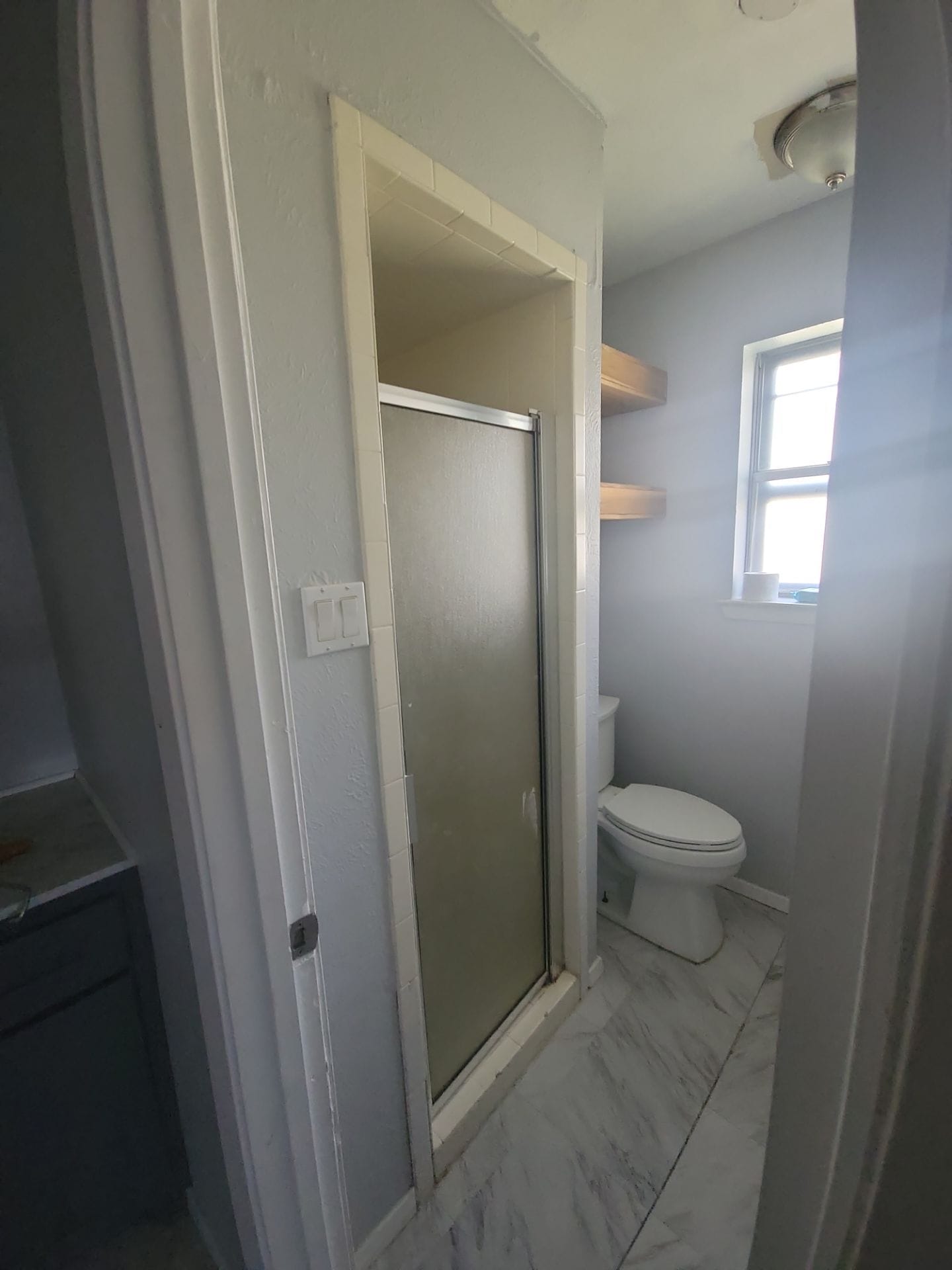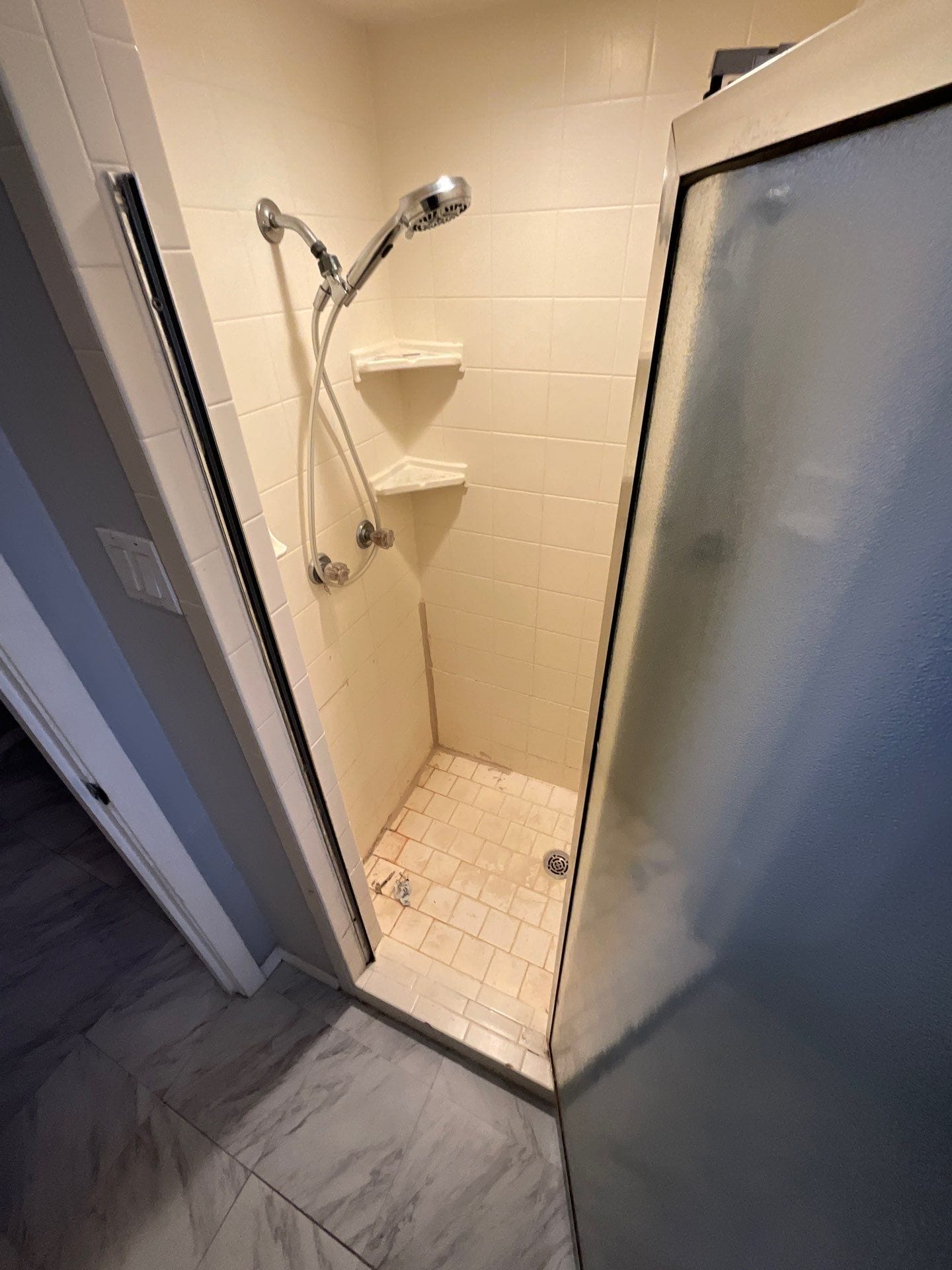 * Walk-in stand-up shower remodel with frameless glass enclosure