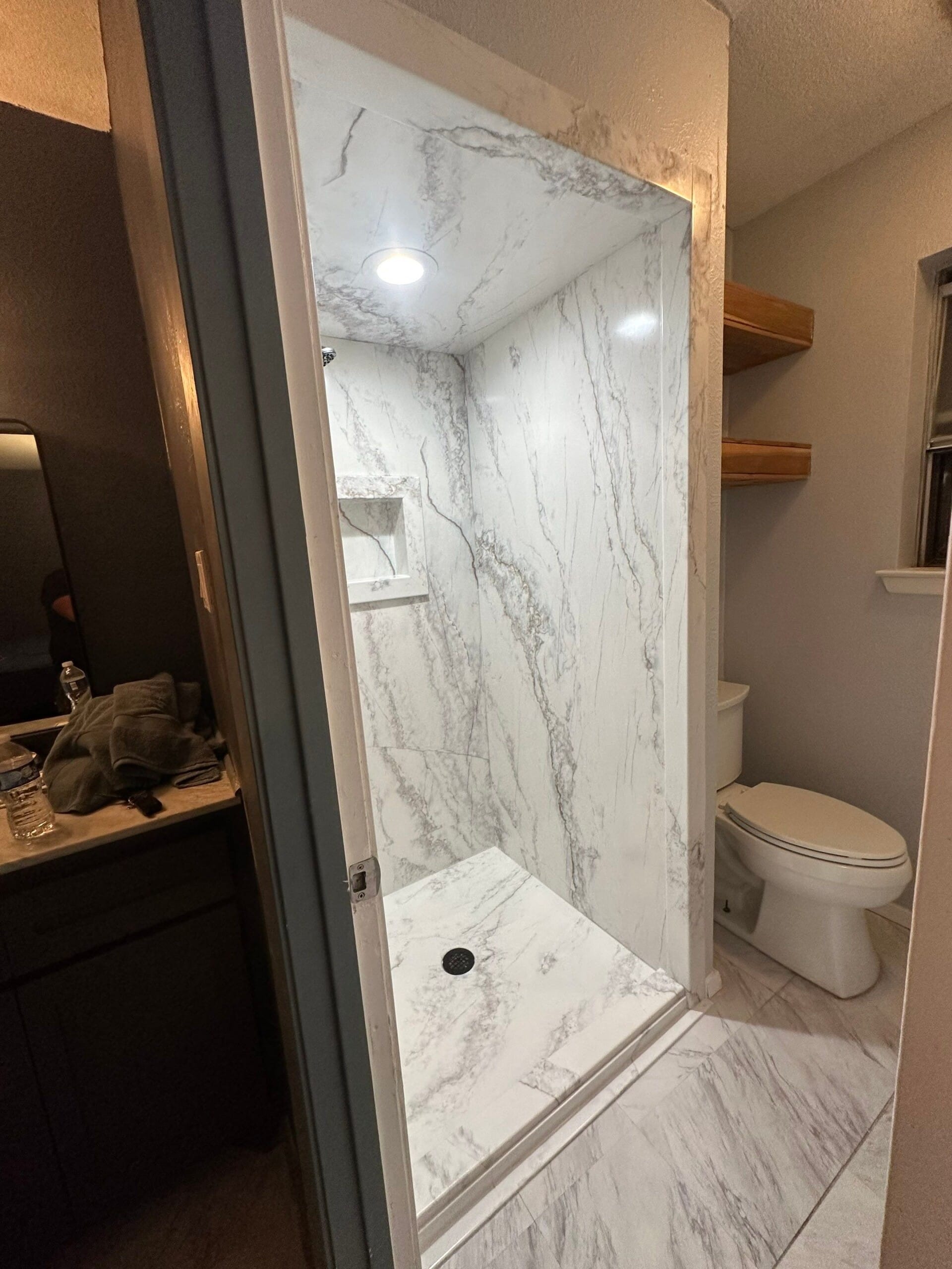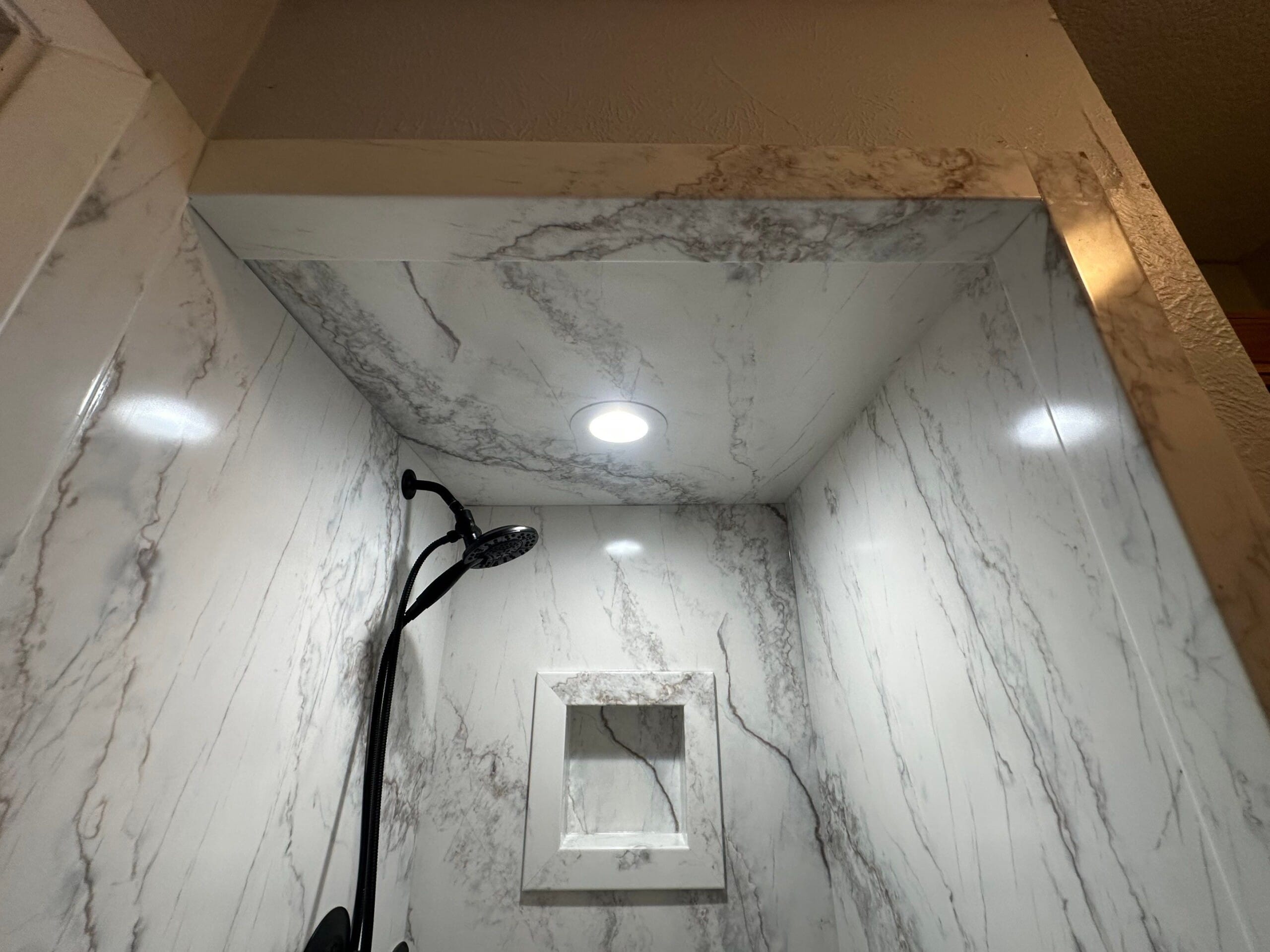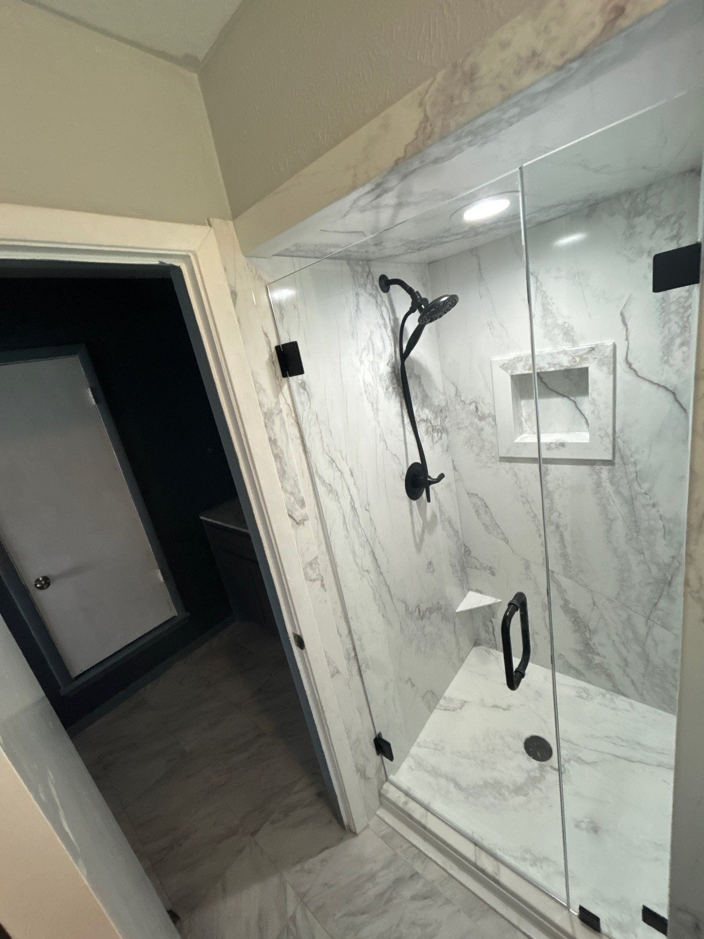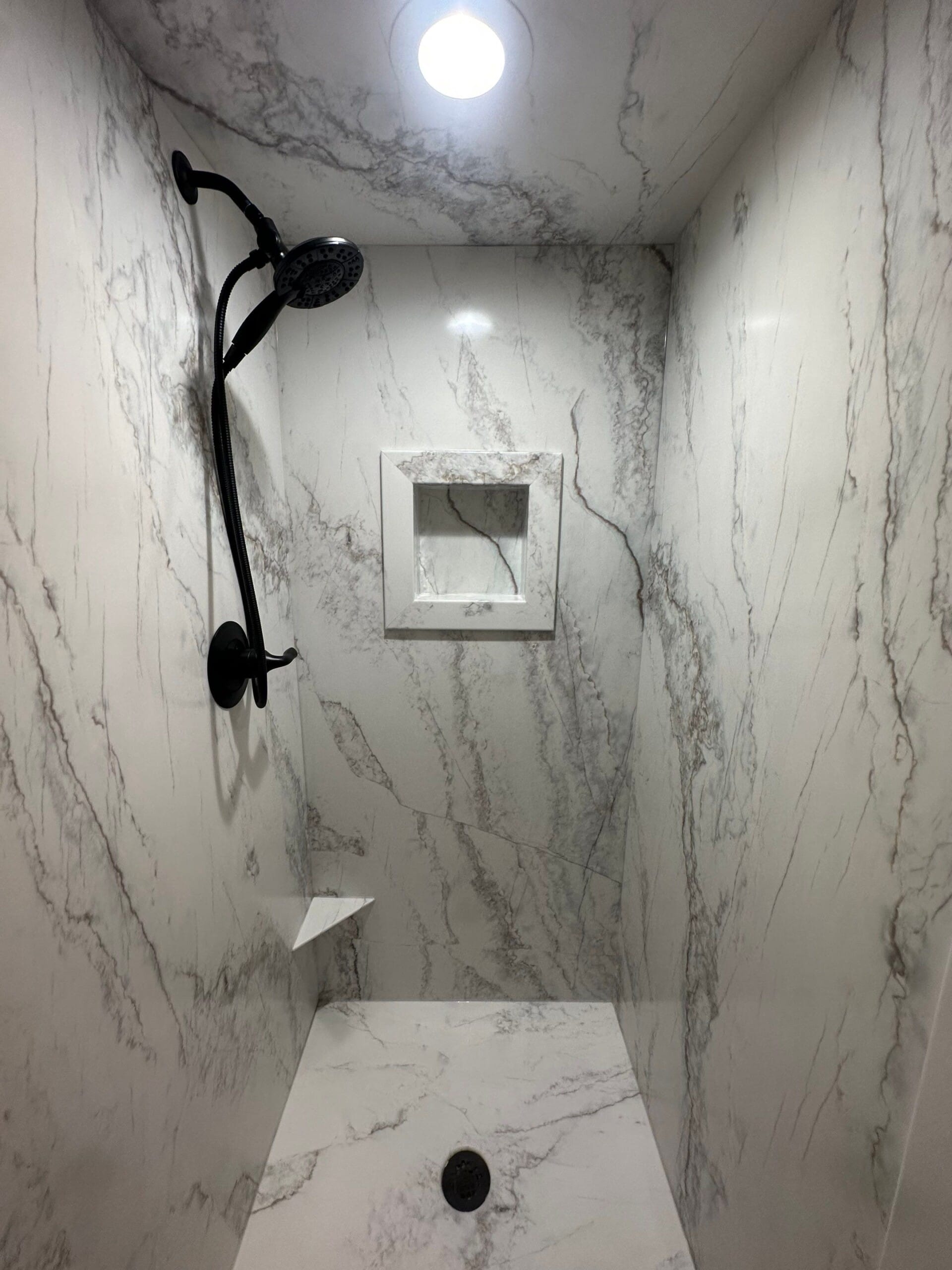 The remodel includes a high-contrast setup with a matte black handheld shower system, integrated corner shelf, and recessed niche for storage. Calacatta-style grout-free composite walls were selected for their durability and ease of cleaning, paired with a matching low-threshold base. A custom frameless glass door was installed to enhance visibility while keeping water contained. The original brushed nickel hardware was replaced with black hardware for a bolder finish. No grab bar or shave step was included in the final install, differing from the original configuration proposal.