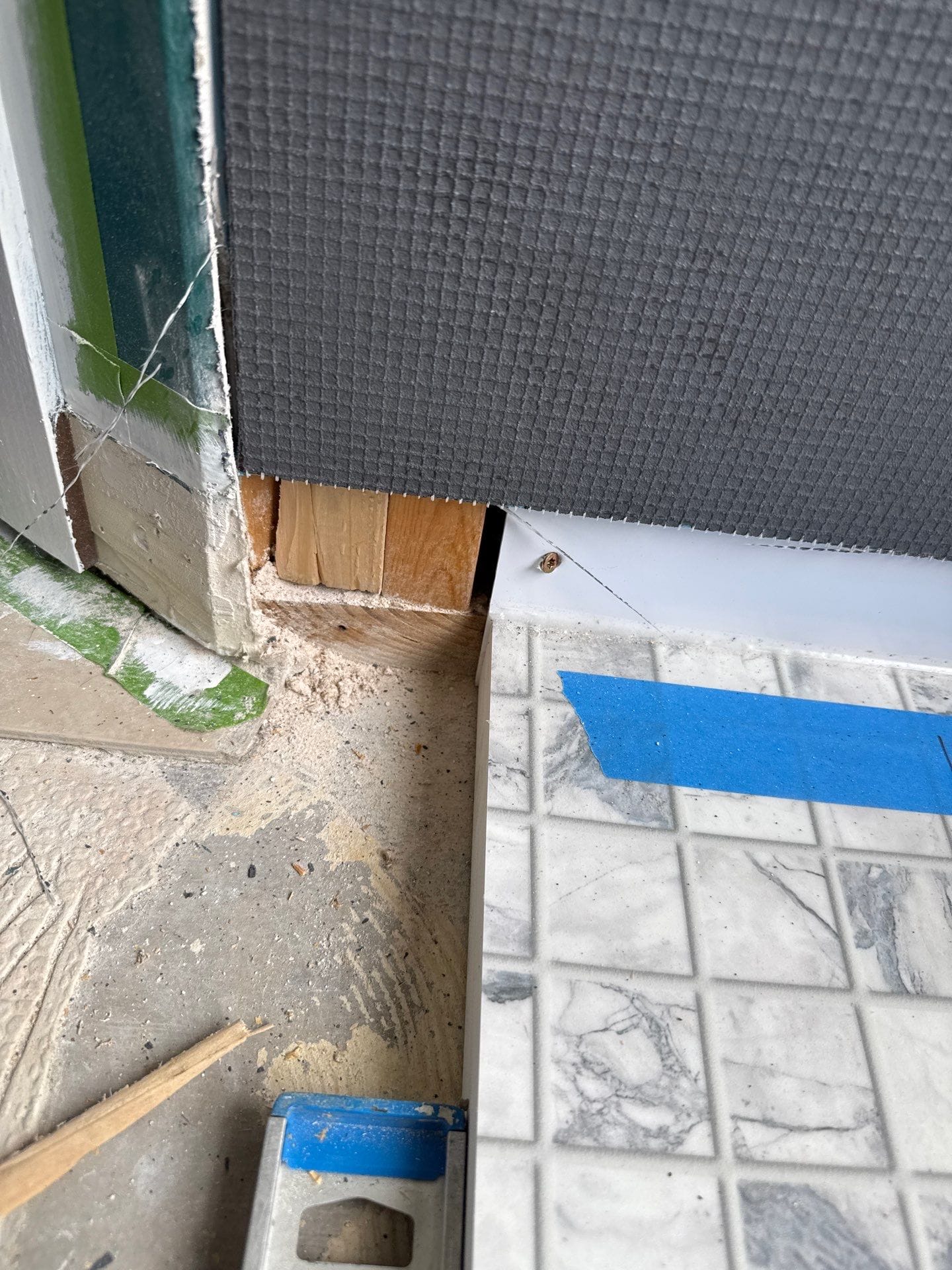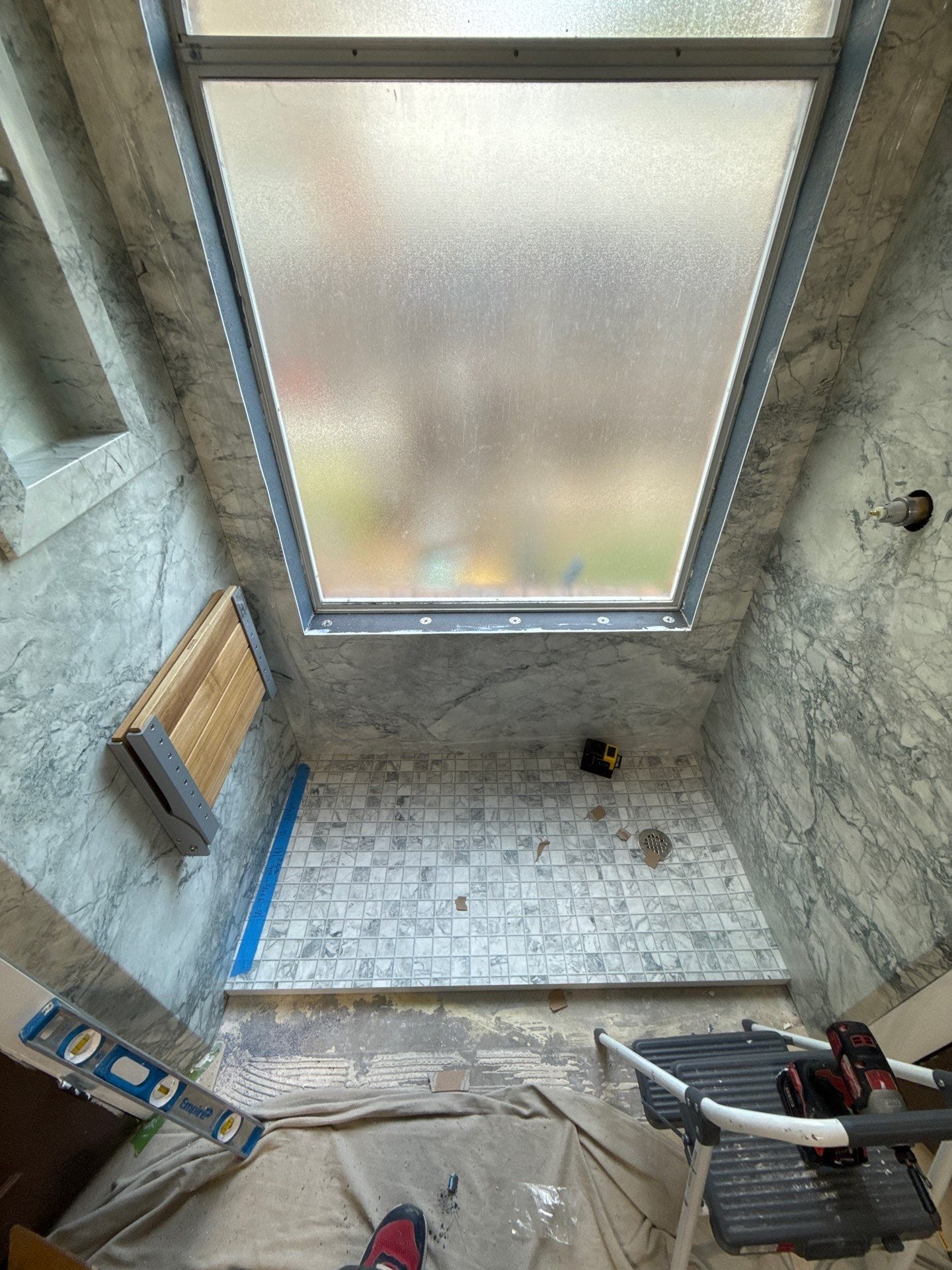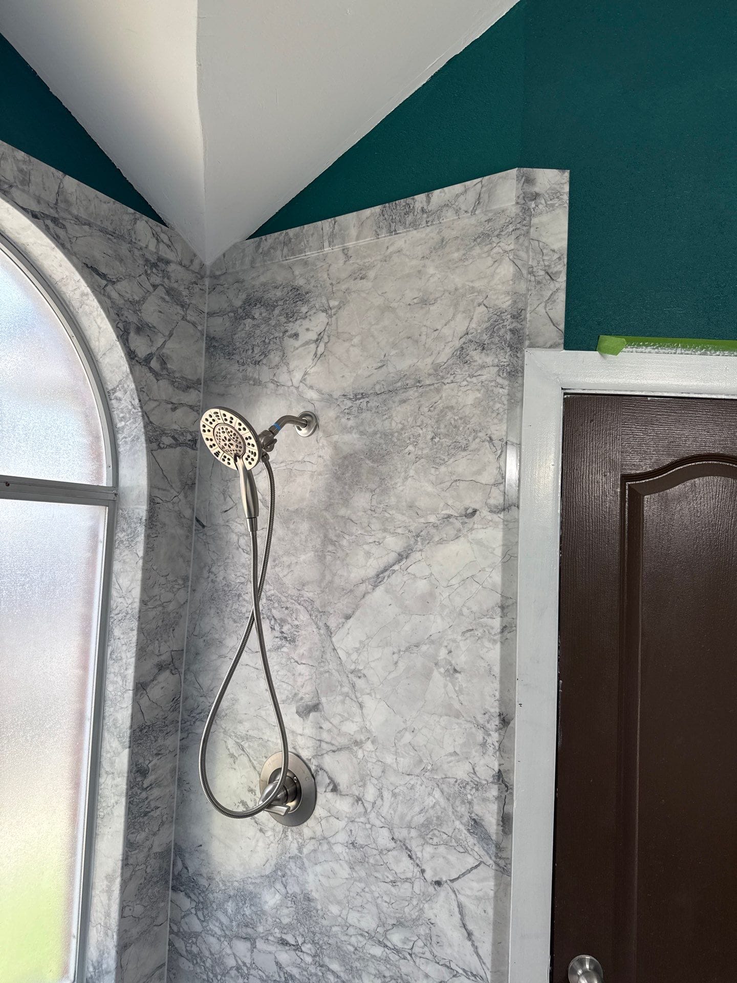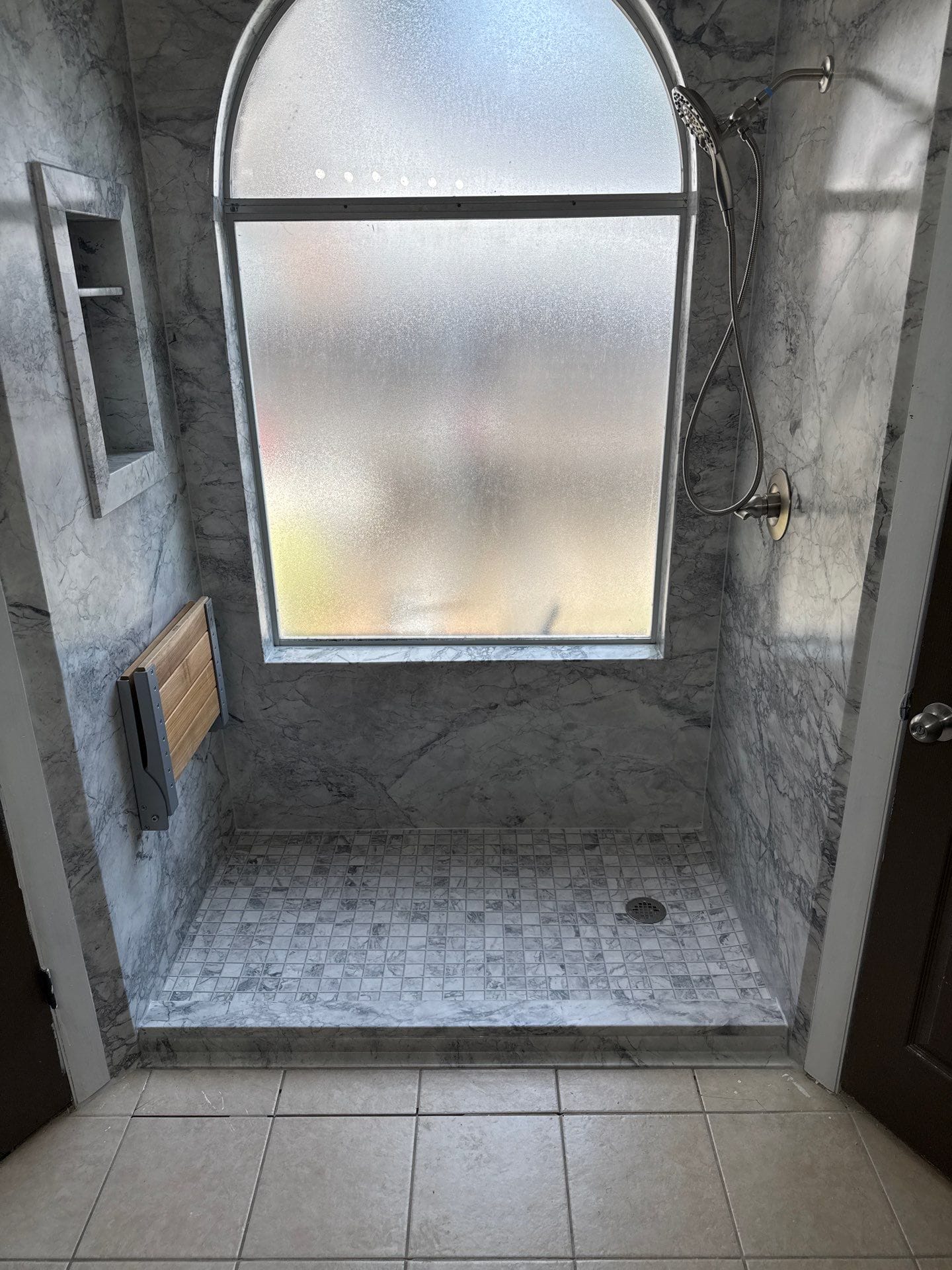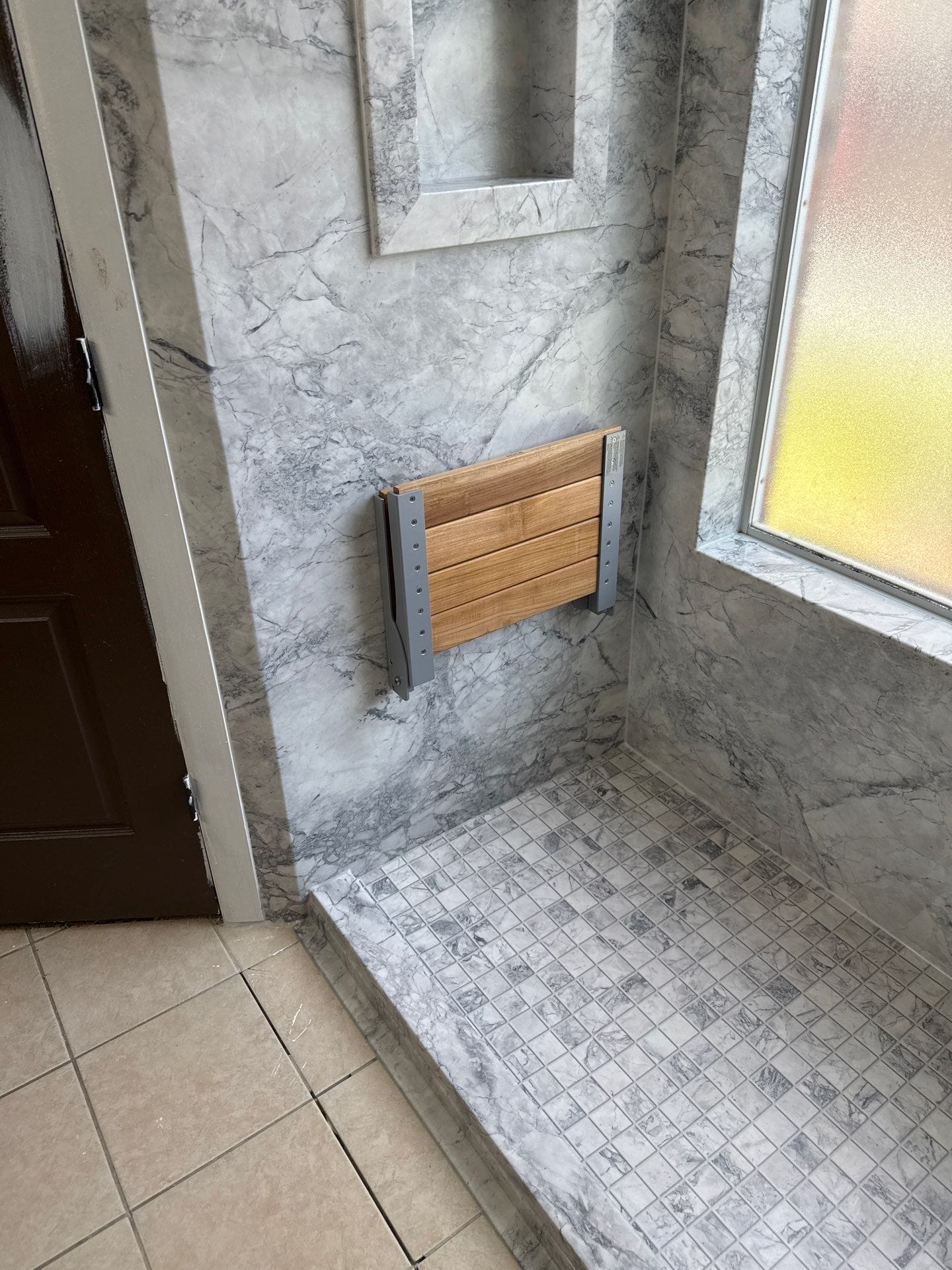 Installation, explained by Mike, completed in one to two days. Crew removed the tub and prepped the area down to the studs. No additional damage was found during demo. New plumbing and Delta fixtures were installed. Composite wall panels, tiled shower pan, recessed niche, teak bench, handheld shower, and frameless door were completed to specification. Site was cleaned thoroughly.