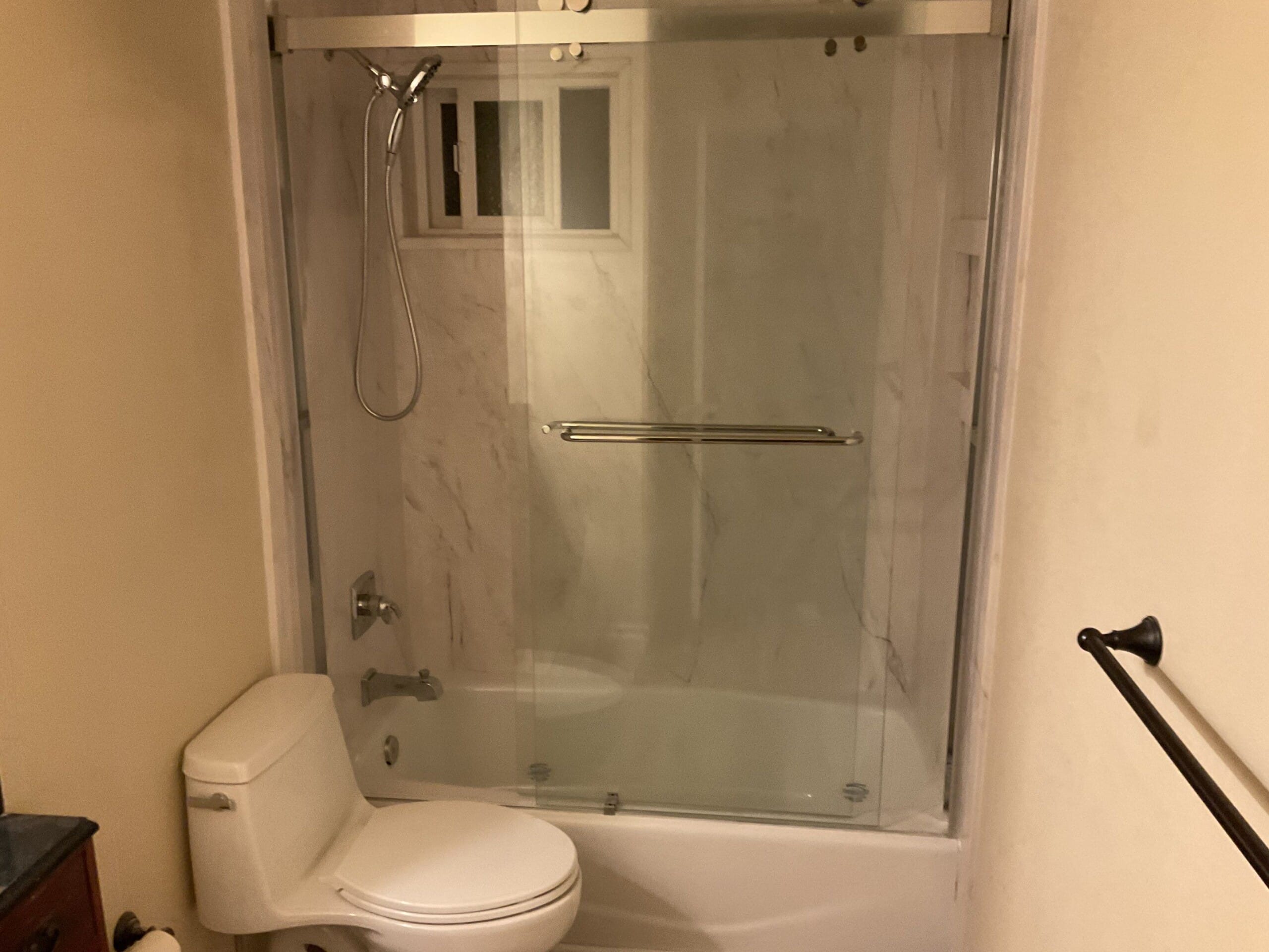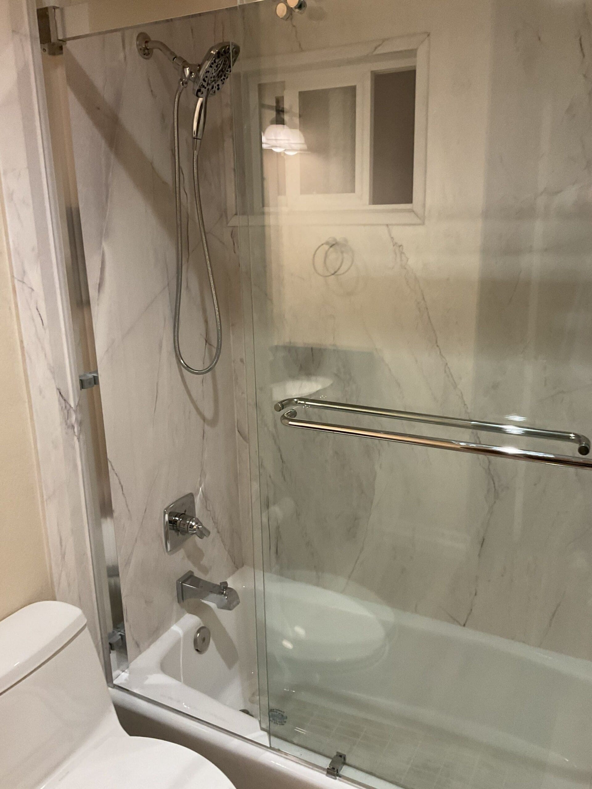 Five Star Bath Solutions recommended their grout-free composite wall system, which eliminates the need for ongoing tile or grout maintenance. The completed installation confirms this approach, featuring full-height white marble-look composite panels with subtle veining that replicate the look of real stone. A sleek sliding glass door system with stainless trim and matching integrated towel bar aligns with the customer’s clean, modern preferences. The existing tub was retained but given a new surround, while the handheld Delta fixture and hardware were updated to chrome for a consistent finish.