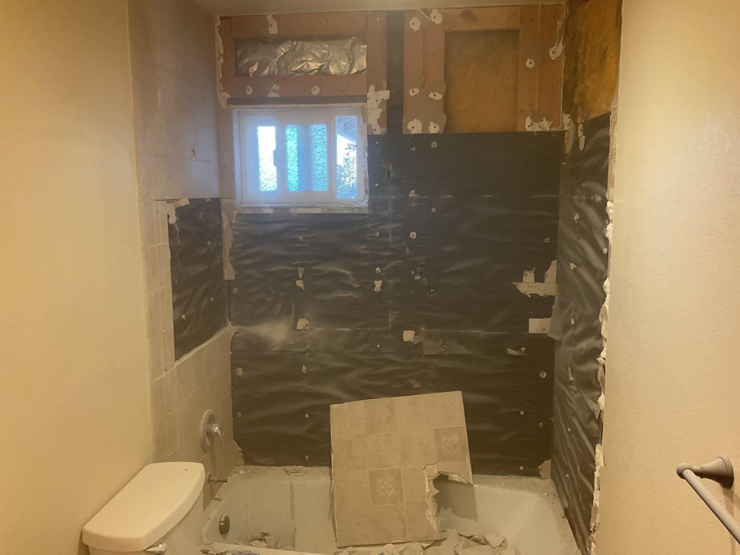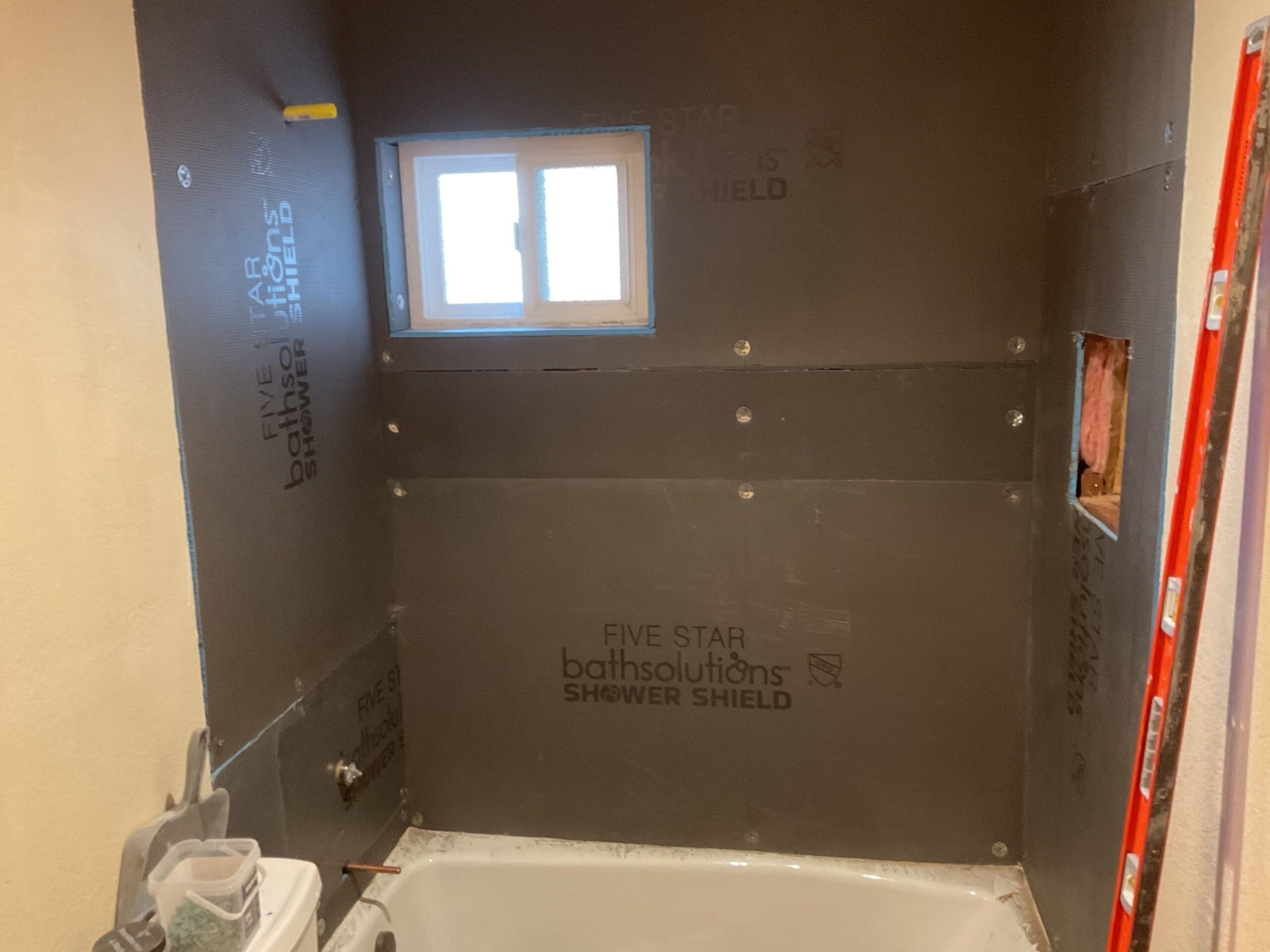 Installation included full demolition of the prior tiled surround and back wall area, which was replaced with new composite slabs set over a waterproof ShowerShield backer. The new materials also extend behind the tub apron for a cohesive visual effect. Waterproof luxury vinyl plank flooring was installed in place of the original tile, enhancing both aesthetics and functionality. Plumbing remained in its original position, streamlining installation and ensuring no disruption to the underlying system. Project completion occurred over four days, well within the estimated timeline.