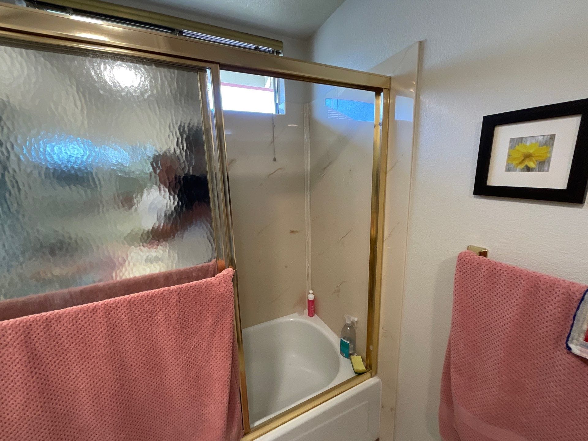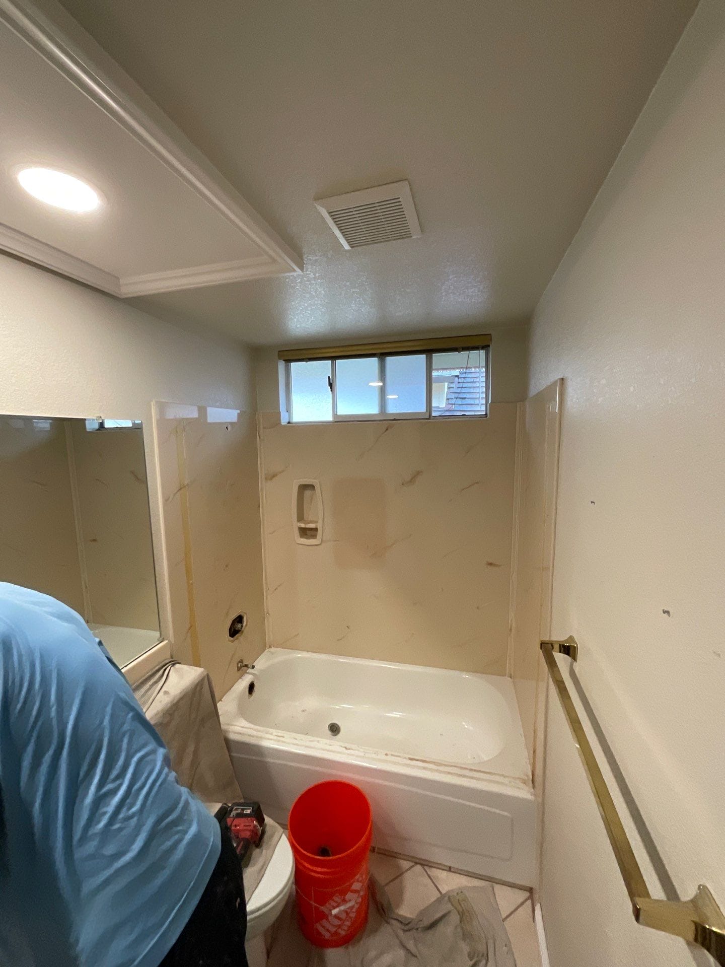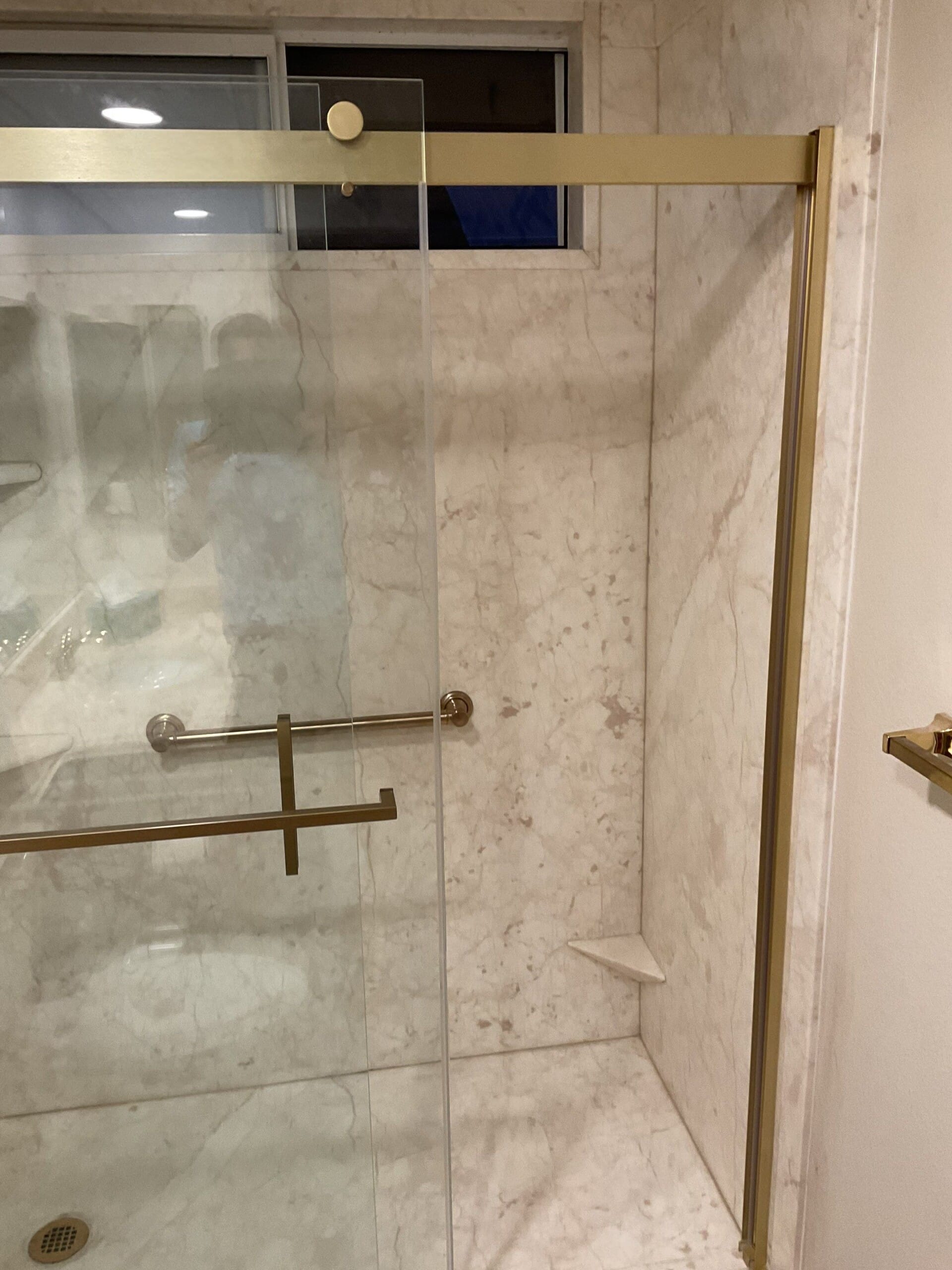 The upstairs bathroom remodel was completed within the expected two-day timeframe. Installation included demolition of the cracked tub and wall surrounds, updated waterproofing, and the placement of solid-slab composite panels. The crew retained the original layout but replaced all fixtures, including a new bypass-style sliding glass door system in brushed gold, which adds an upgraded touch while retaining familiarity. Additional updates included integrated corner shelving and seamless flooring transitions. Throughout the project, all plumbing adaptations were made to suit the new system with no interruptions or external bin usage.