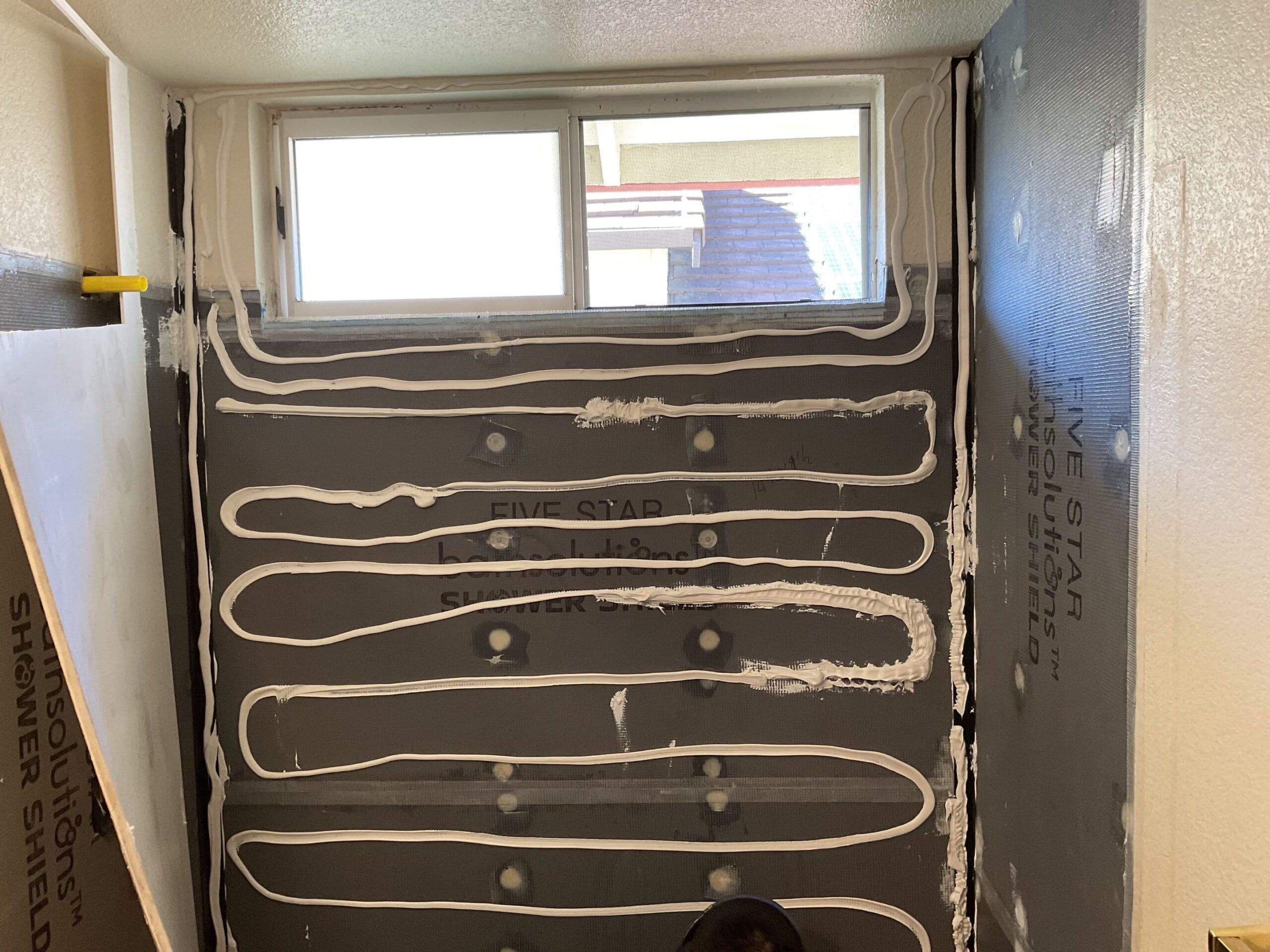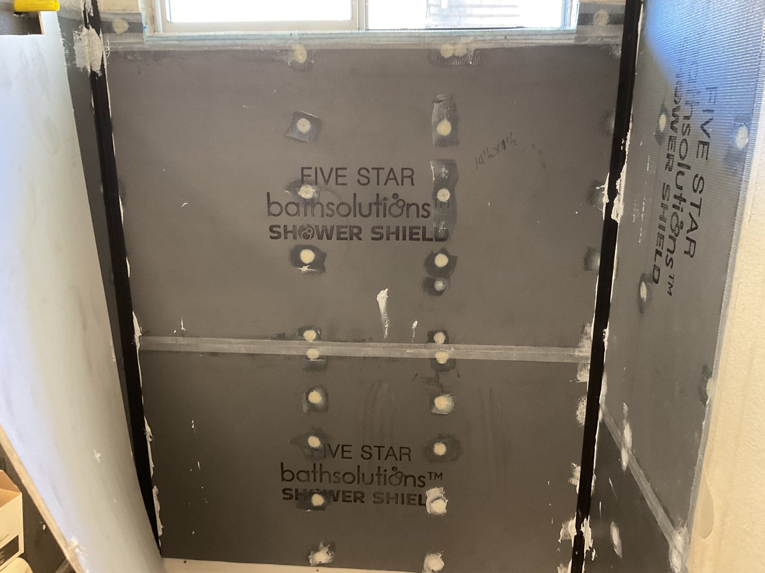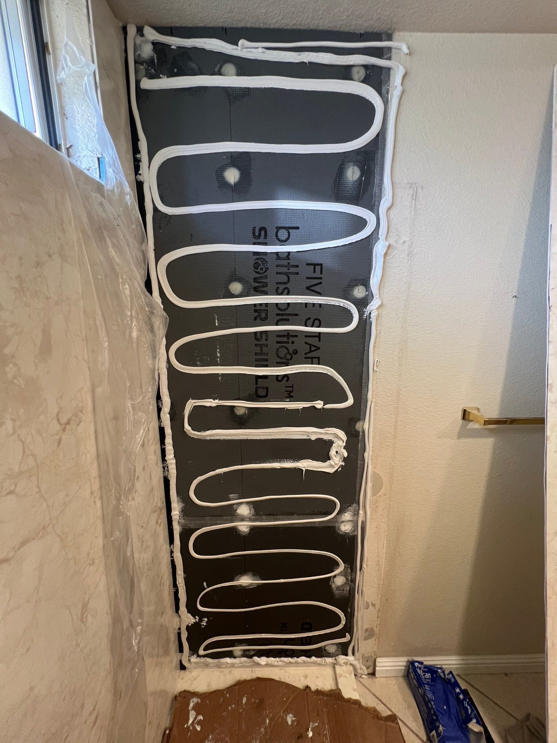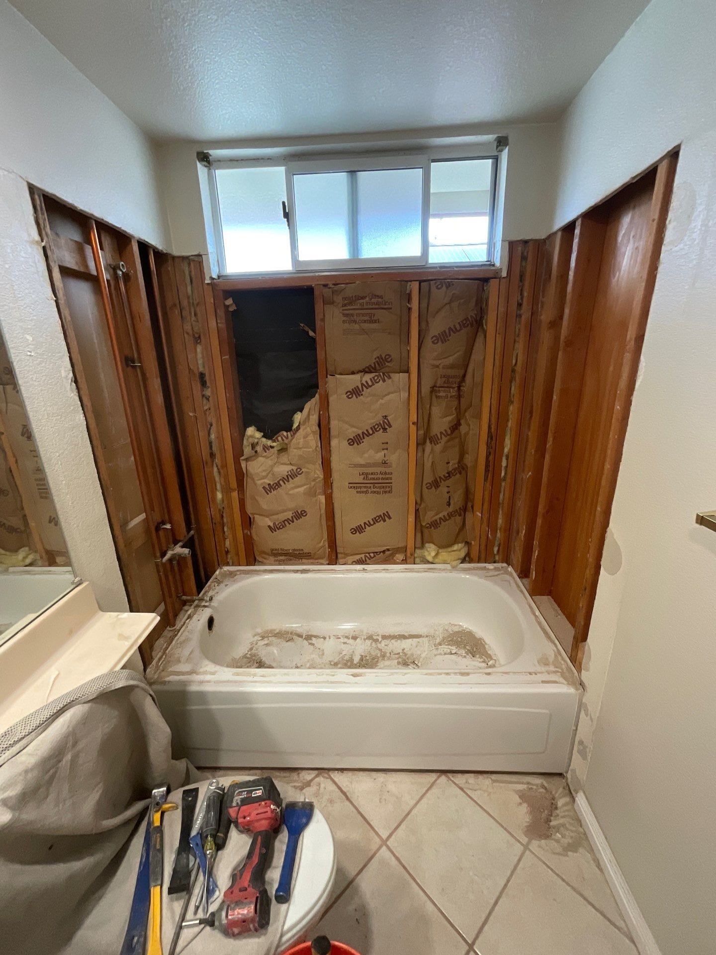 The upstairs bathroom remodel was completed within the expected two-day timeframe. Installation included demolition of the cracked tub and wall surrounds, updated waterproofing, and the placement of solid-slab composite panels. The crew retained the original layout but replaced all fixtures, including a new bypass-style sliding glass door system in brushed gold, which adds an upgraded touch while retaining familiarity. Additional updates included integrated corner shelving and seamless flooring transitions. Throughout the project, all plumbing adaptations were made to suit the new system with no interruptions or external bin usage.