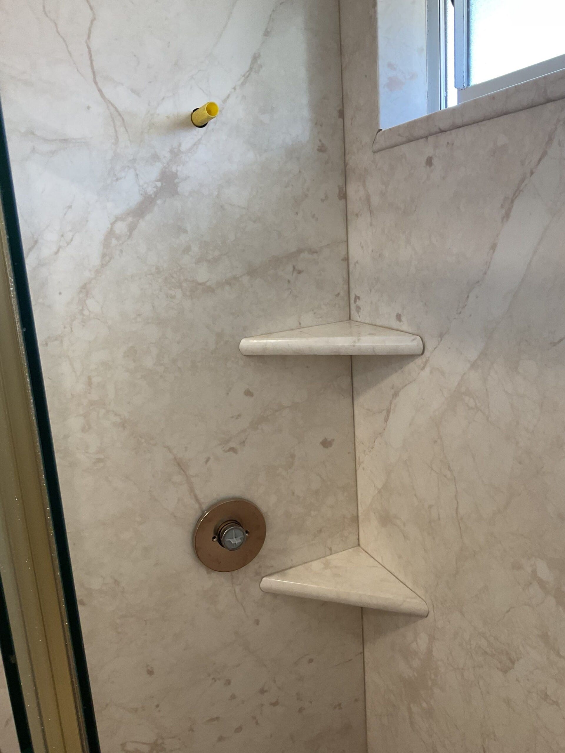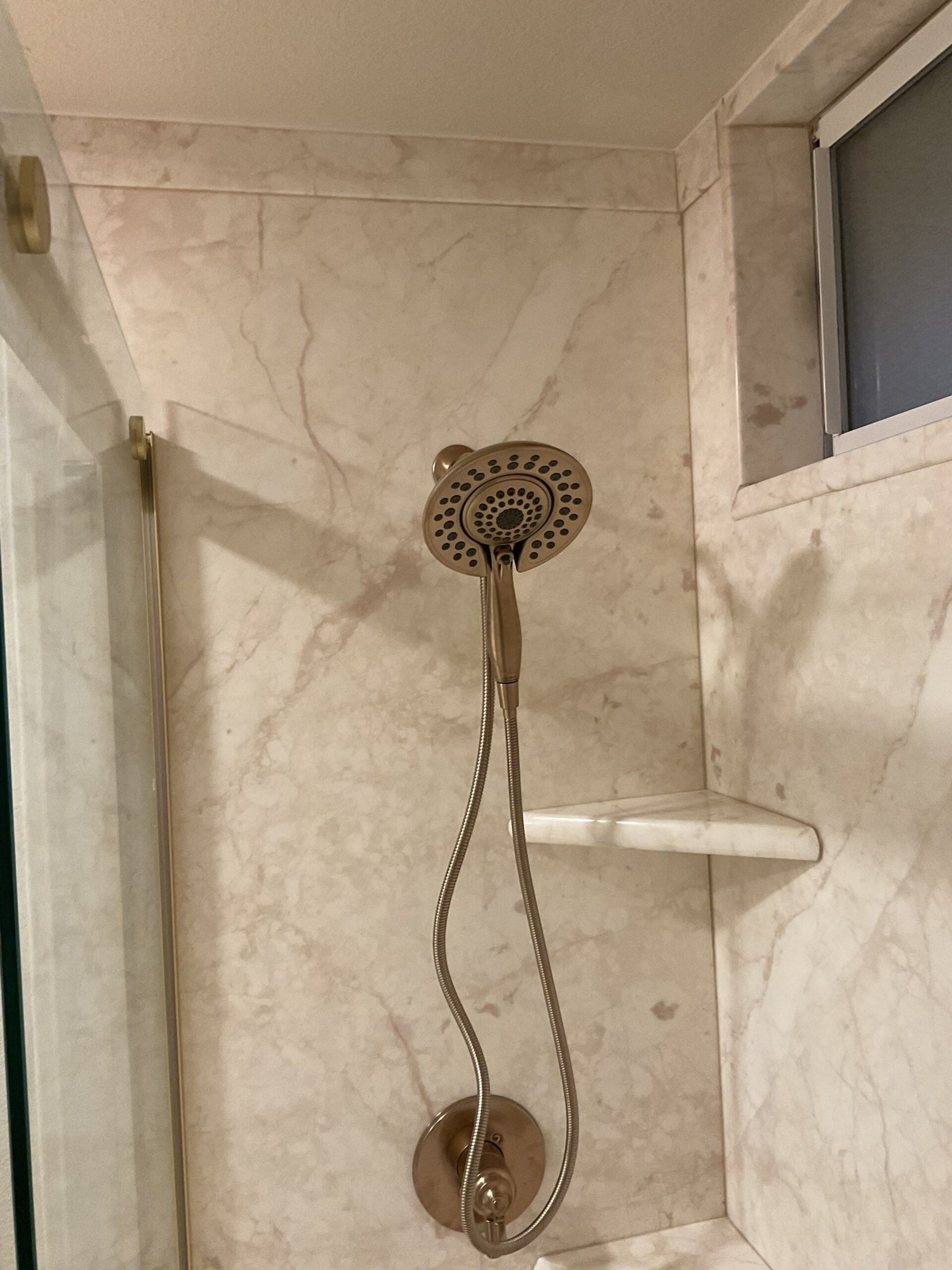 Five Star Bath Solutions proposed a modern, grout-free composite shower system with a real stone aesthetic to match the customer’s desire for simplicity and easy upkeep. The visual result confirmed this direction: the remodel features wall-to-wall light marble-look panels, paired with brushed gold fixtures including a sleek integrated handheld showerhead and clean-lined safety grab bar. The composite construction ensures mold resistance, eliminates the need for caulking, and provides slip-resistant texturing. The matte wall finish and minimalistic hardware cater to the customer’s aesthetic priorities and long-term ease of maintenance.