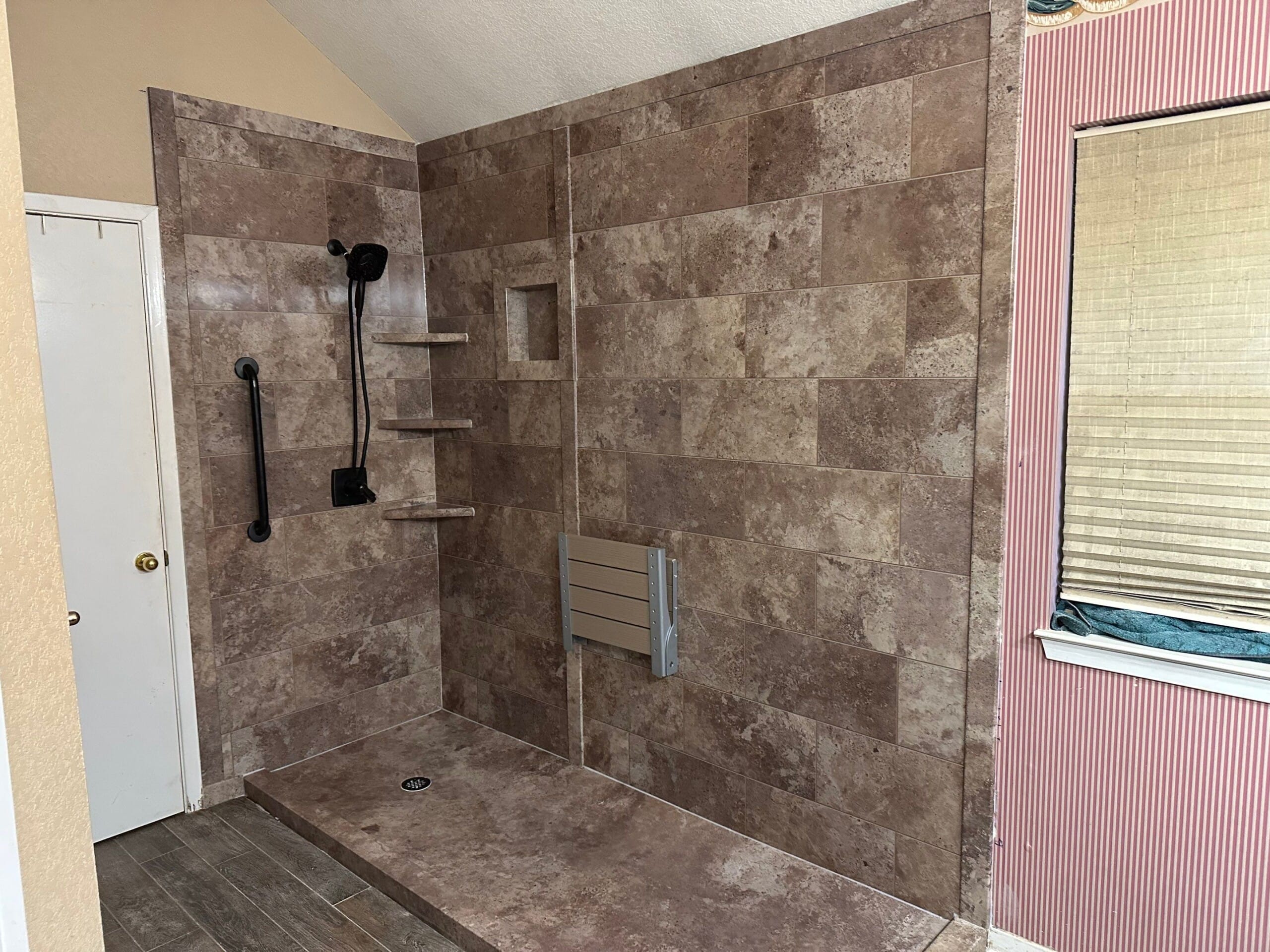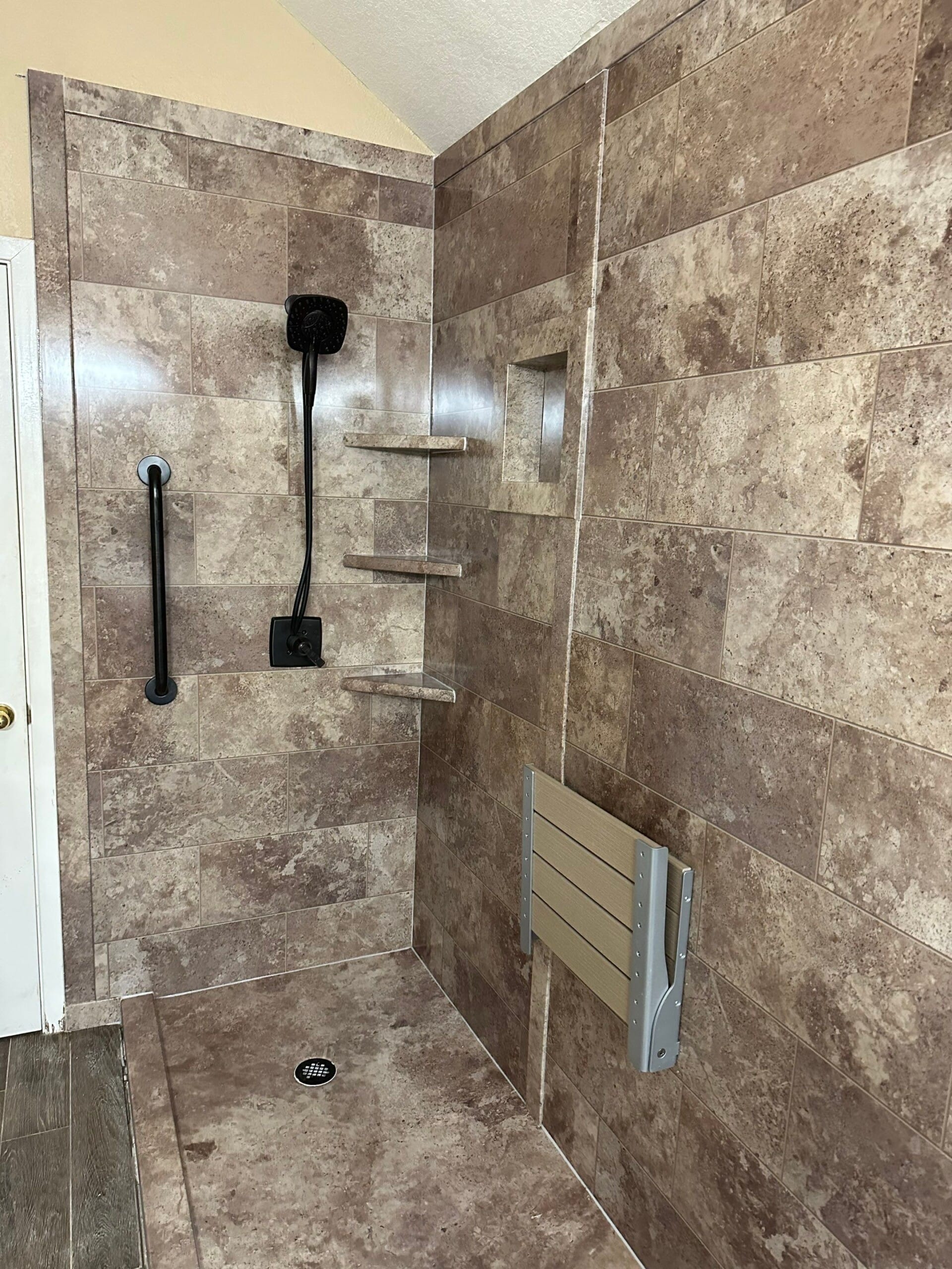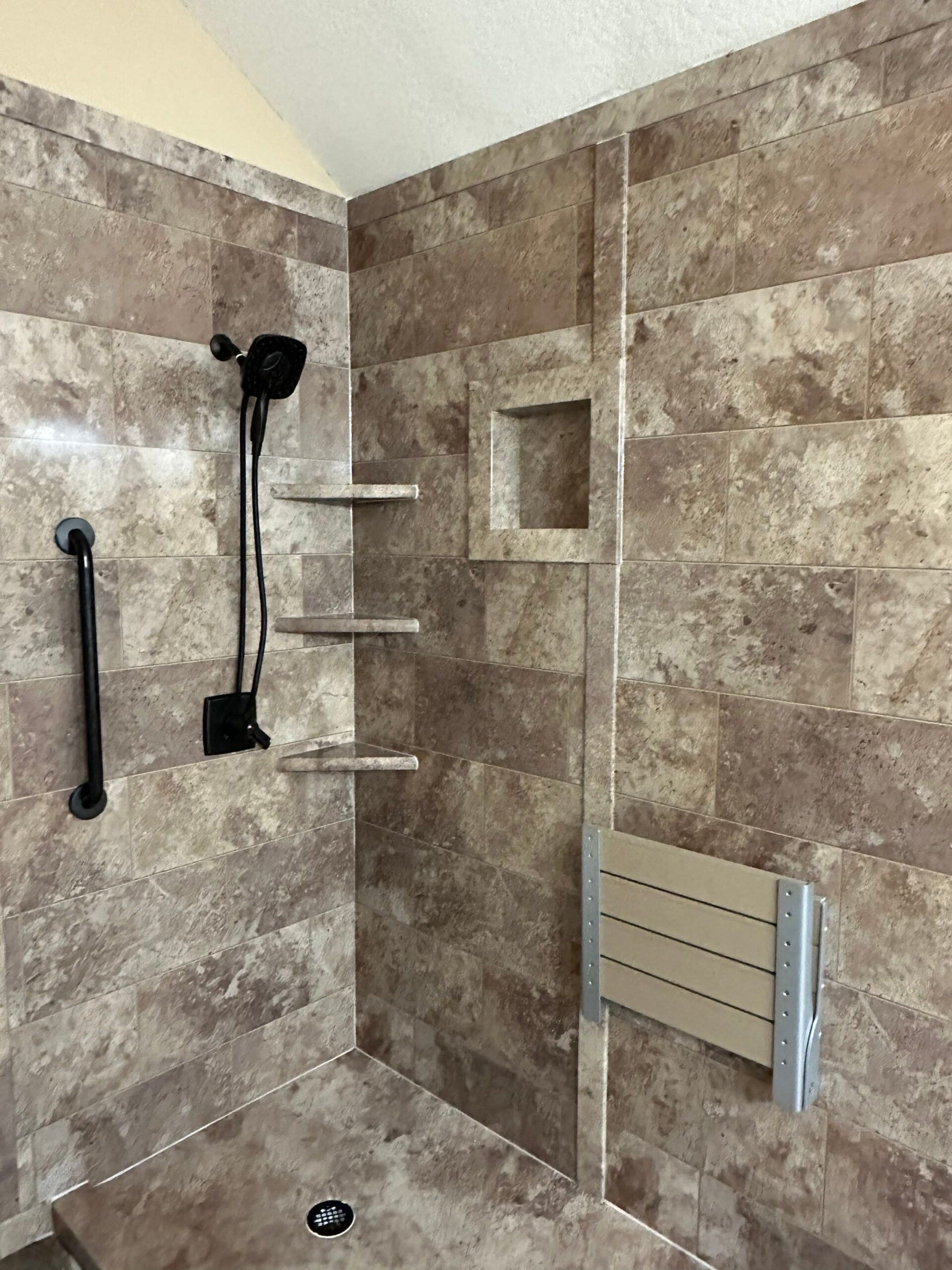 The installation process involved complete removal of both the tub and existing shower down to the studs to address any underlying moisture or structural concerns. The space was reconfigured into one continuous walk-in shower area with a low-threshold base and slip-resistant surface. Plumbing lines, valve, and drain were updated, and additional structural support was installed for grab bars and seating. The new wall system, fixtures, storage features, and a frameless-style sliding glass enclosure were installed, creating a more open and accessible layout. Work was completed with full site protection and efficient cleanup throughout the project.