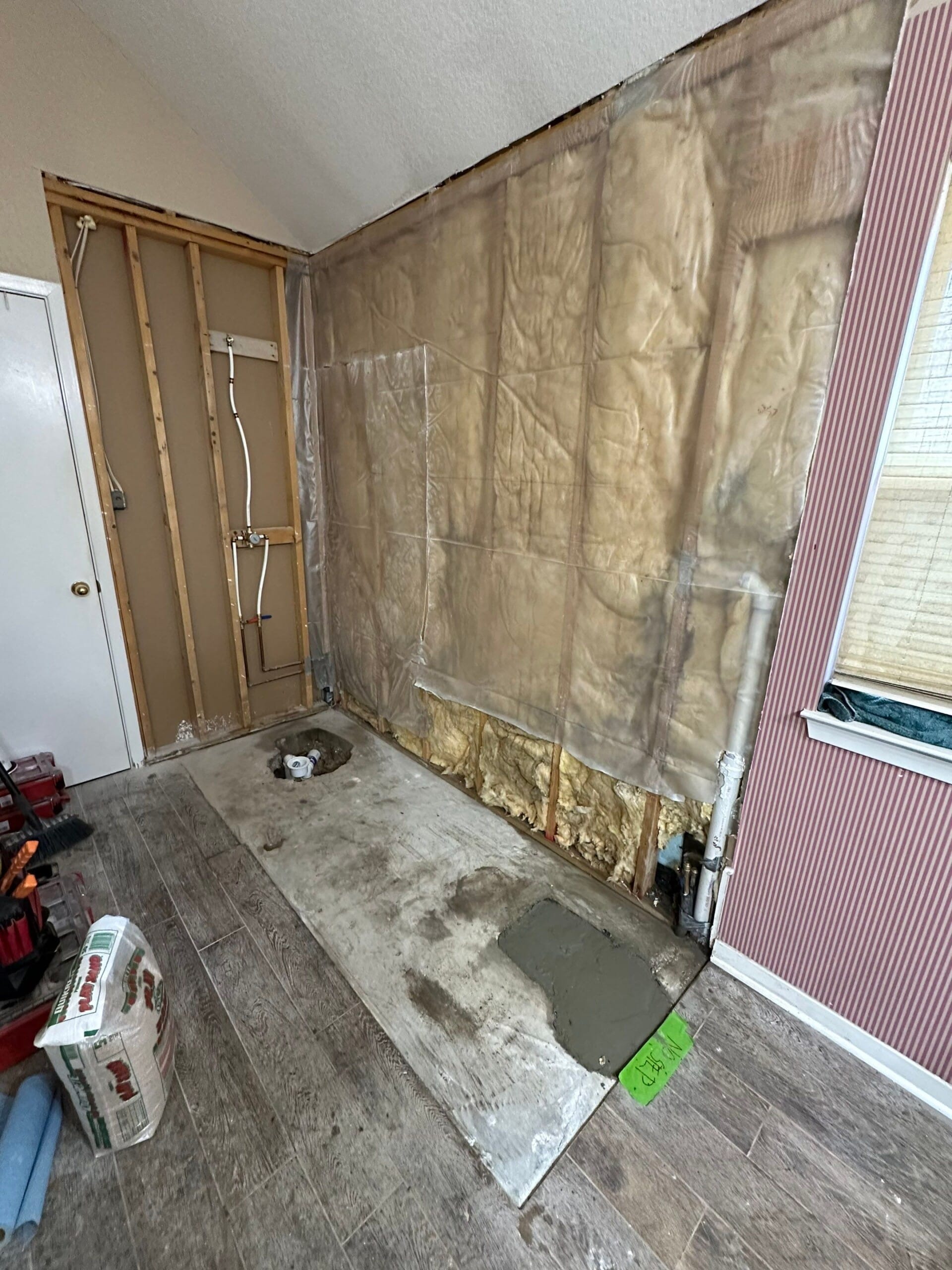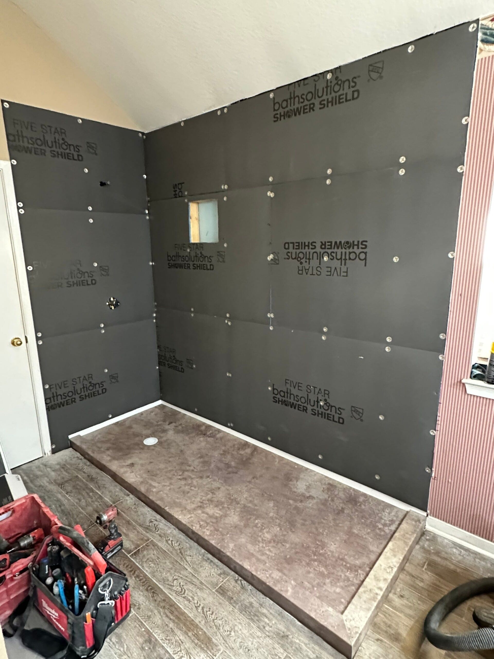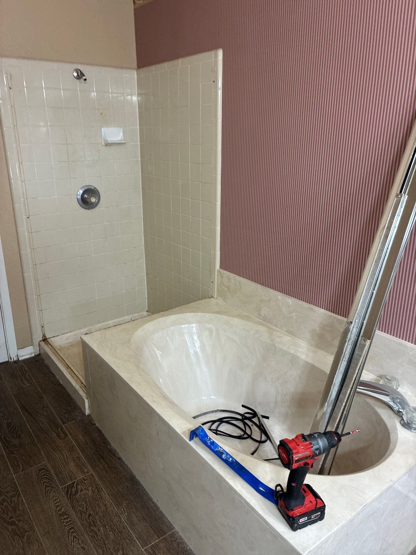 The installation process involved complete removal of both the tub and existing shower down to the studs to address any underlying moisture or structural concerns. The space was reconfigured into one continuous walk-in shower area with a low-threshold base and slip-resistant surface. Plumbing lines, valve, and drain were updated, and additional structural support was installed for grab bars and seating. The new wall system, fixtures, storage features, and a frameless-style sliding glass enclosure were installed, creating a more open and accessible layout. Work was completed with full site protection and efficient cleanup throughout the project.