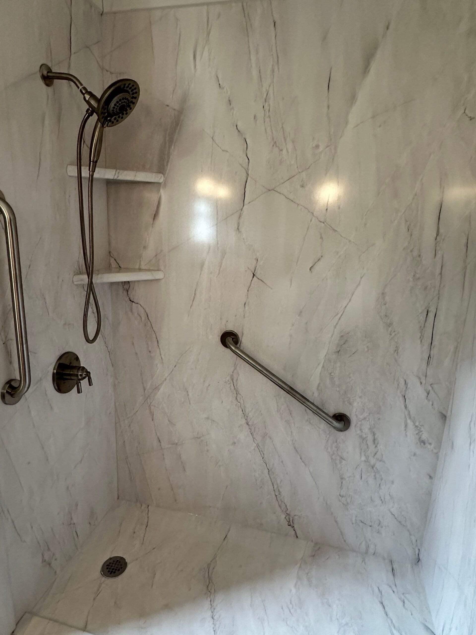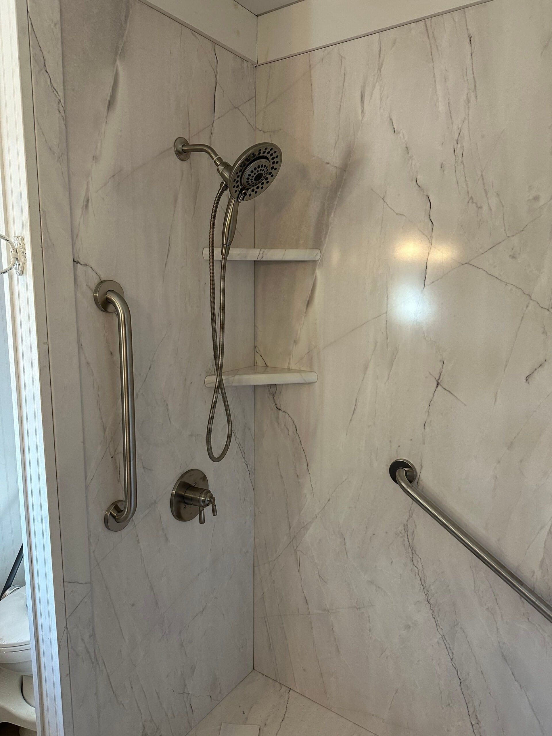 The Representative explained that the entire existing unit would be removed down to the studs to properly address all underlying moisture issues visible in the original space. The system installed reflects a groutless marble-patterned wall design consistent with the customer’s request, paired with a coordinated shower base featuring a subtle tile-look floor for visual contrast. The Smart Choice system includes a multi-layer PVC wall structure with an antimicrobial surface and a fully waterproof backer, ensuring durability and resistance to mold or mildew. The finished space shows brushed nickel fixtures, a dual-function shower head with handheld capability, and integrated corner shelving molded directly into the system for ease of cleaning and long-term maintenance. The company reinforced credibility through specialized bathroom-only experience, consistent high ratings, and trained in-house installers.