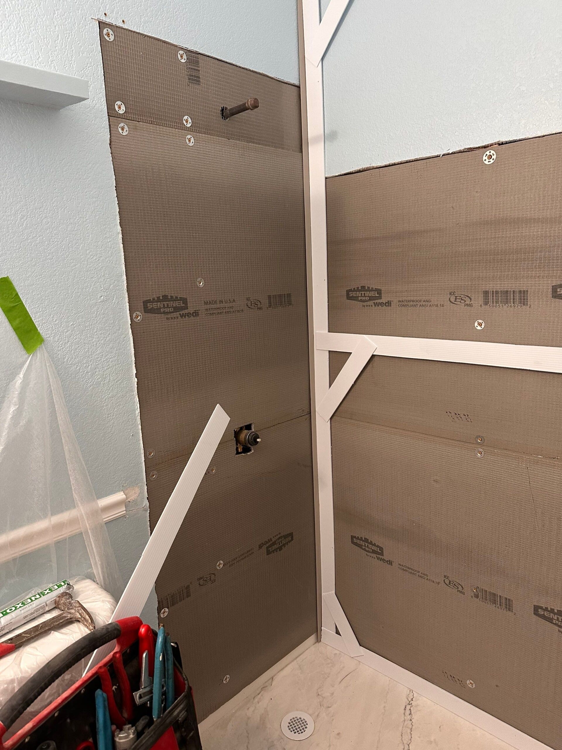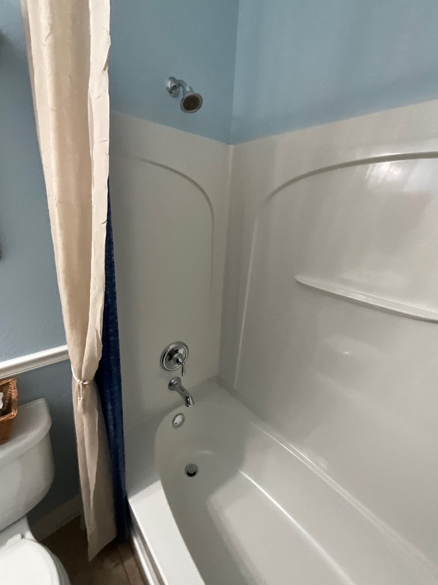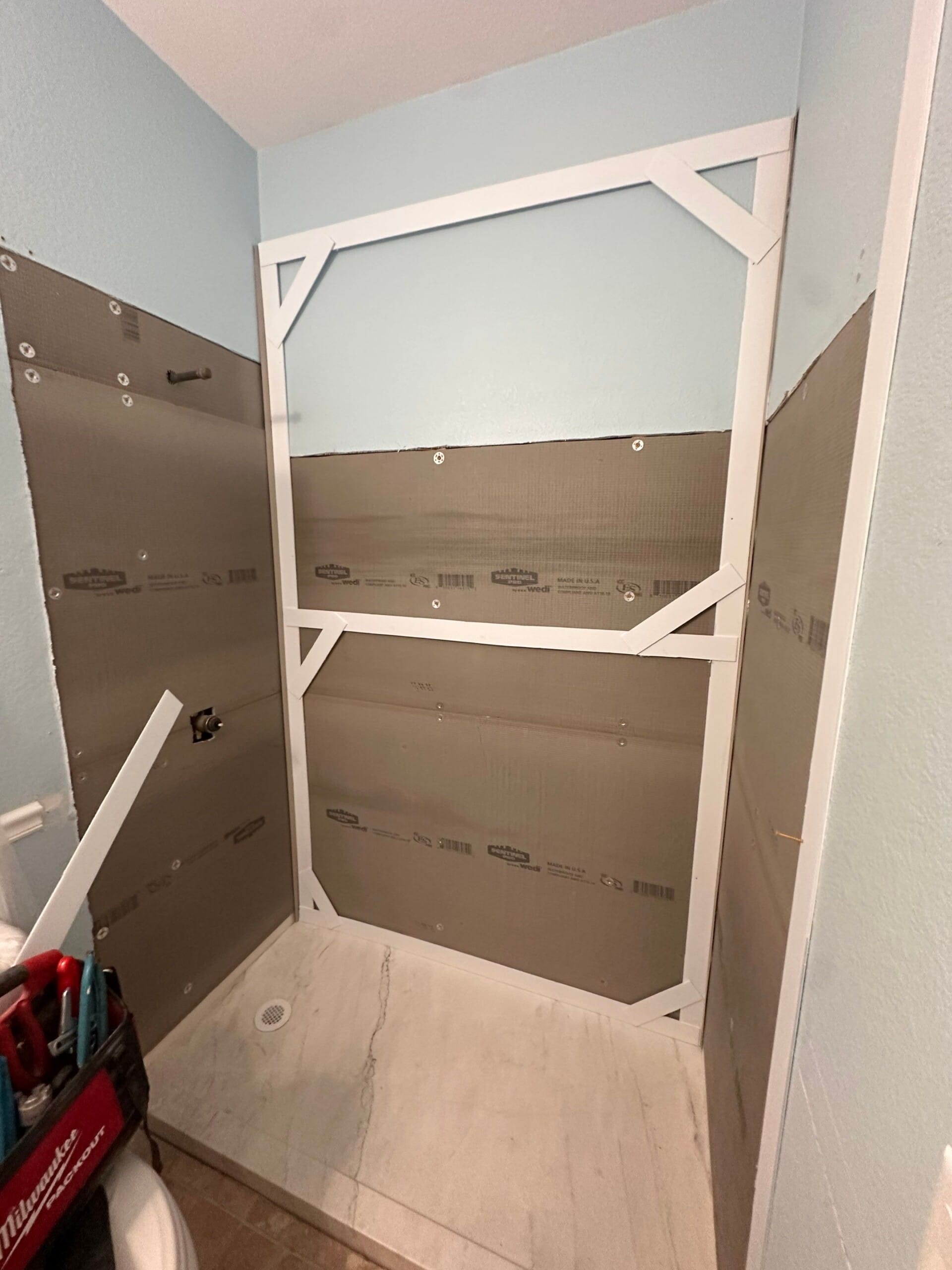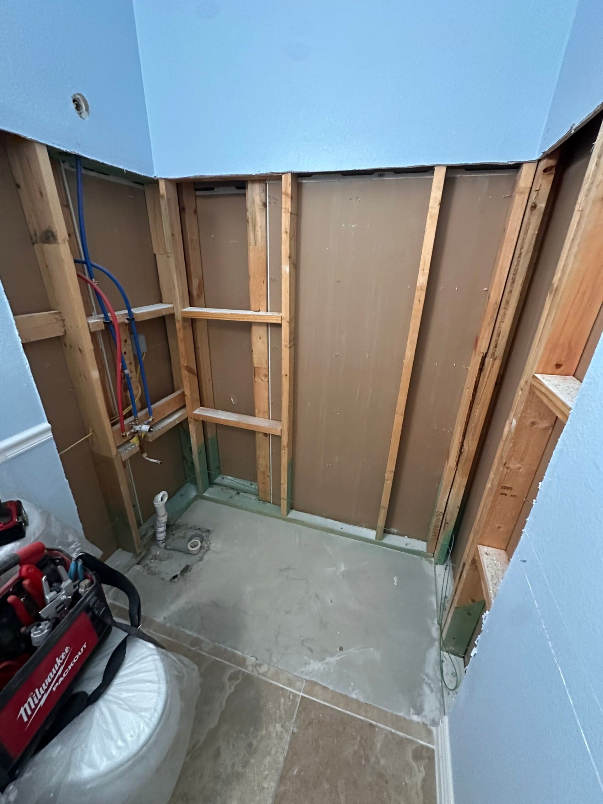 The installation process involved full removal of the existing tub and surround down to the studs to properly address any prior moisture damage. All compromised materials were cleared, and structural components were reinforced as needed. Plumbing lines, valve, and drain were updated, and the shower head height was adjusted for improved comfort. The new system was installed with a low-threshold base, wall panels, sliding glass enclosure, and fixtures. The project was completed efficiently with attention to site protection and cleanup throughout the process.