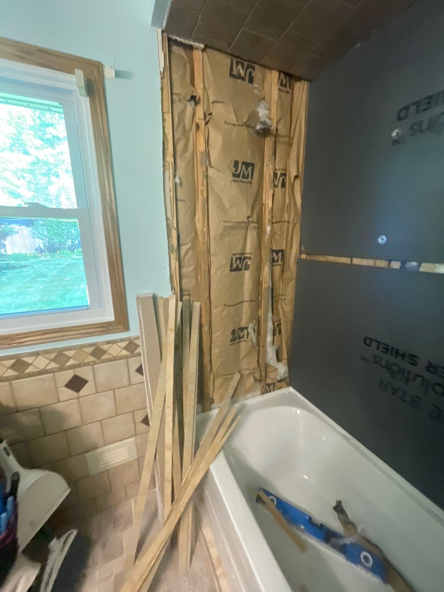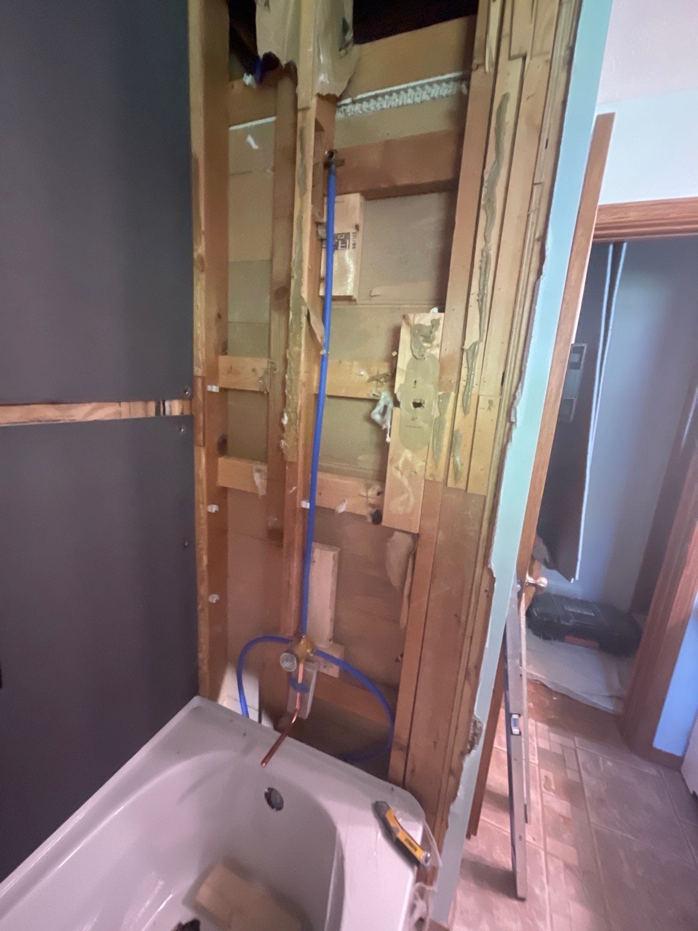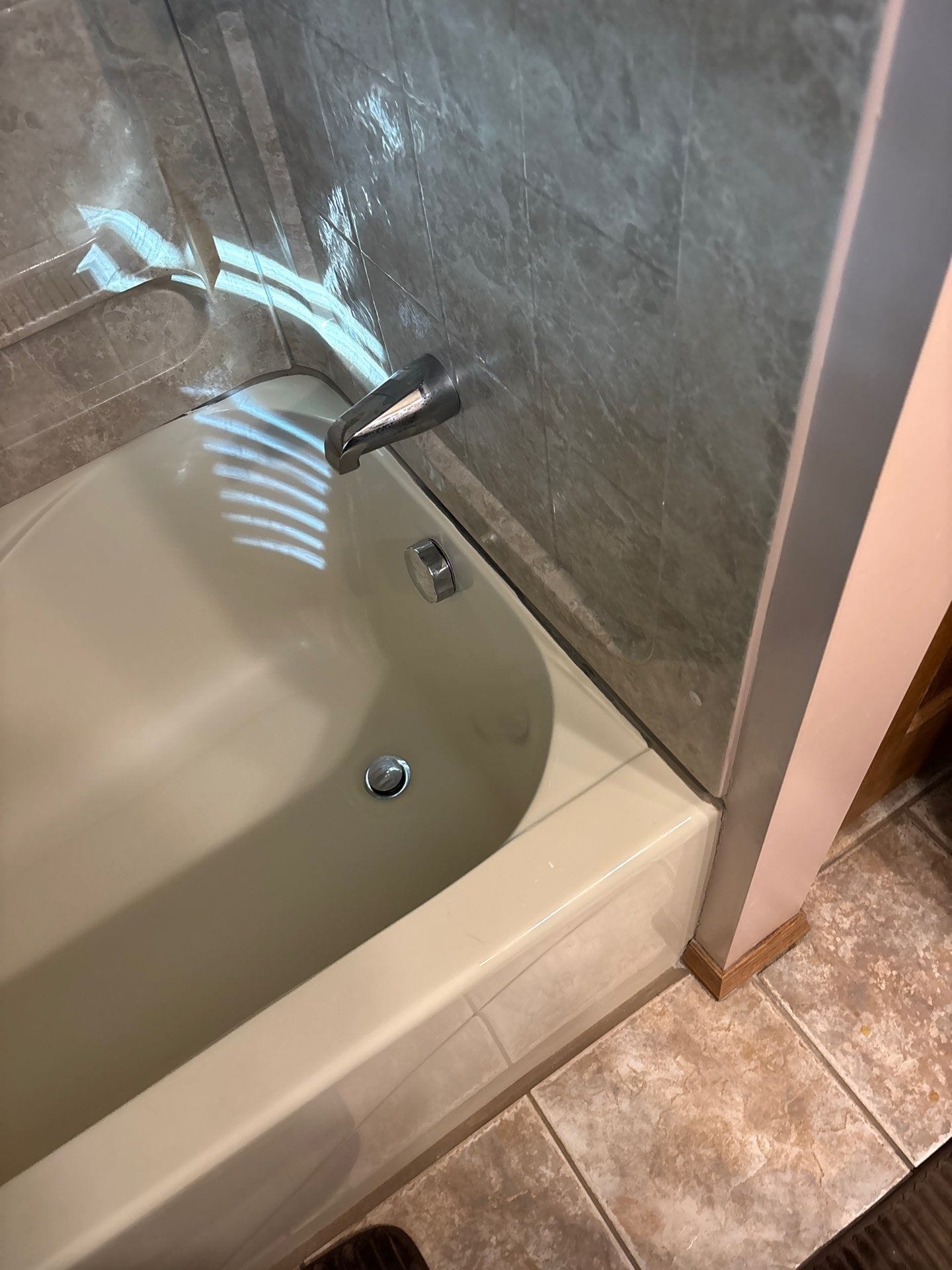 The remodel began with demolition already completed by the homeowner. Five Star handled all plumbing, tub installation, waterproof paneling, and flooring. The curved shower rod and Delta fixture were added for improved usability. The company also reinstalled the toilet with a new wax ring and secured customer-provided vanities. Drywall repair remained the responsibility of a third party, consistent with the company’s wet-space-only service model. Installation was estimated at up to four days, and measurements were confirmed by project coordinator Michelle prior to scheduling.