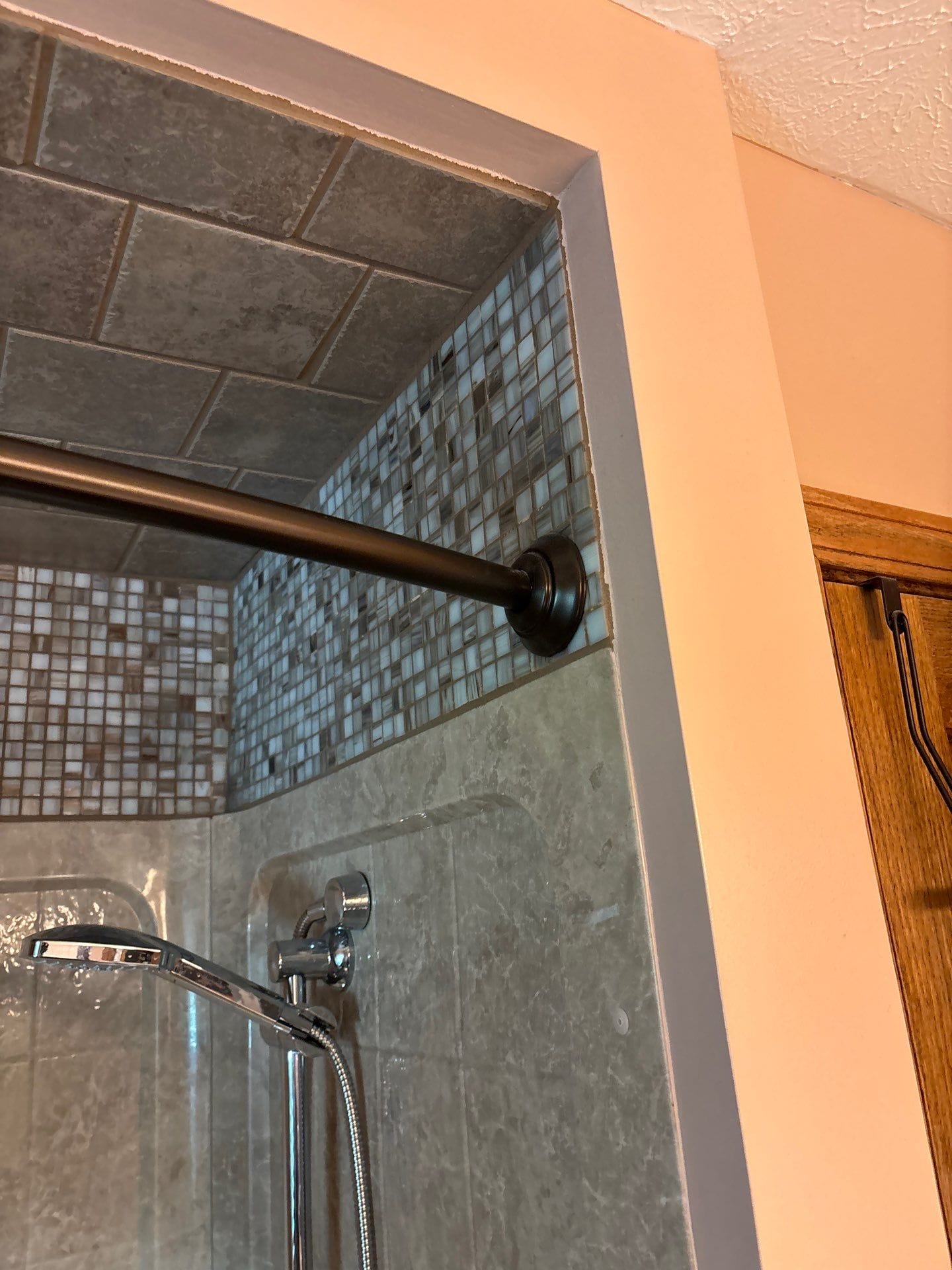 Jagger Willard from Five Star Bath Solutions recommended the Smart Choice composite system as the ideal mid-range solution. The package included antimicrobial, six-layer composite wall panels with a matte stone look, sealed with marine-grade silicone. ShowerShield cement-coated foam backer ensured full waterproofing behind the walls. Jagger also highlighted the long-term advantages of composite over fiberglass or acrylic, including scratch resistance, easy maintenance, and a grout-free finish. Fixtures were upgraded to brushed nickel Delta Intuition handheld components with a flexible hose. Materials were chosen for non-porous, mold-resistant performance and easy cleaning without harsh chemicals.