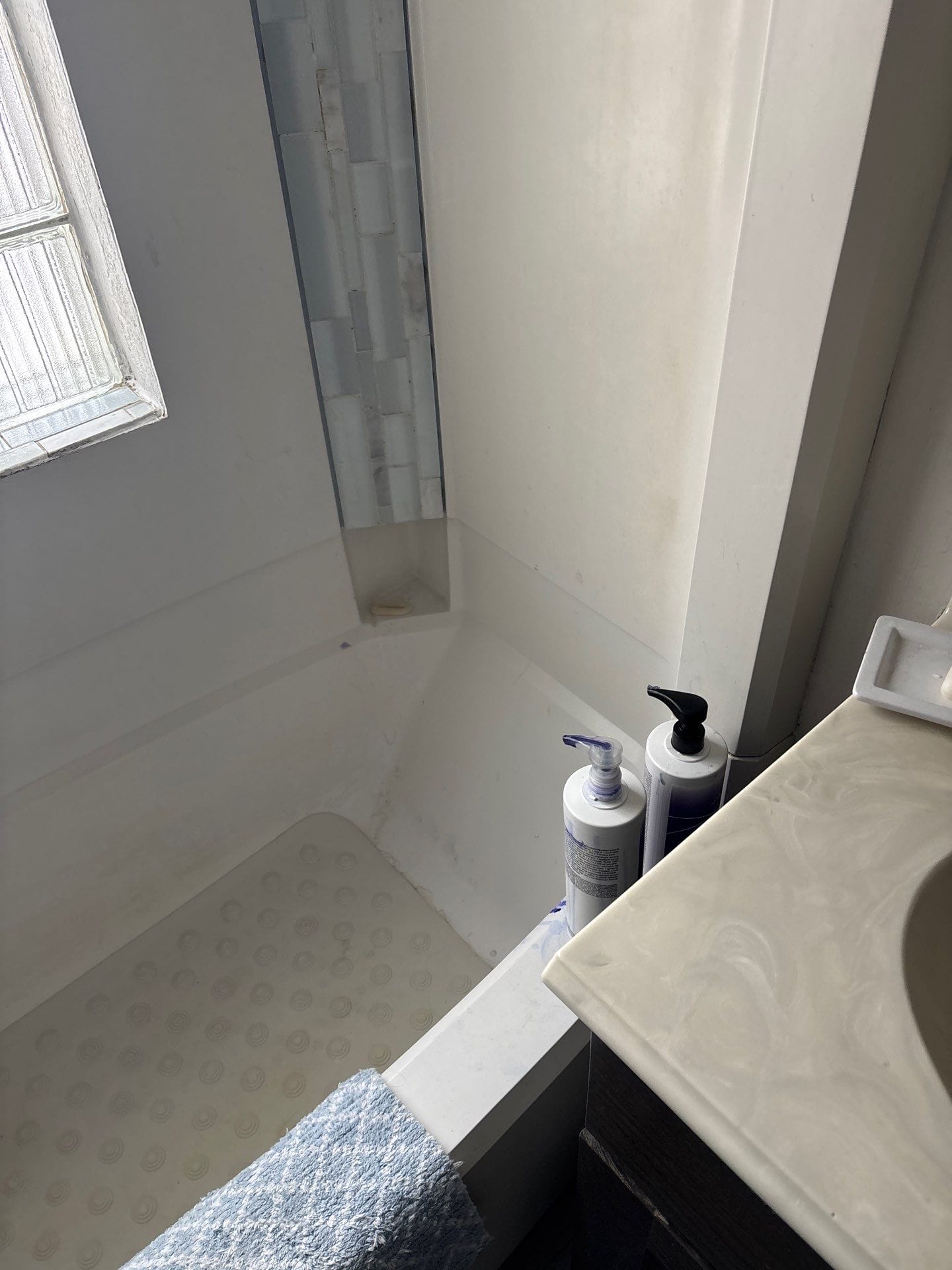 Installation began with removal of the original bathtub and surrounding wall materials to prepare the space for the walk-in shower conversion. The crew completed a full demolition to expose the framing and installed a reinforced, slip-resistant shower base designed for durability and reliable drainage. Waterproof backing panels were installed before mounting the marble-pattern composite wall panels. Plumbing fixtures, shelving, and the glass enclosure were then installed to complete the new walk-in shower system while protecting the surrounding bathroom during the work process.