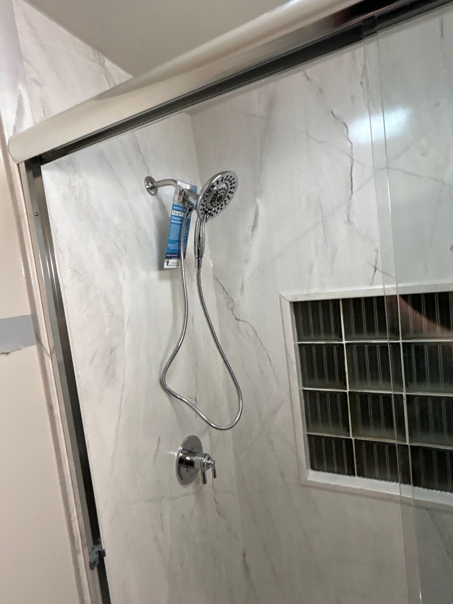 The Five Star Bath Solutions representative presented a grout-free composite wall system designed to replicate the appearance of natural marble while eliminating grout maintenance. The selected design features large-format marble-pattern wall panels that brighten the shower space and provide a smooth, seamless finish. The walk-in shower includes integrated corner shelving for storage and a handheld shower system with polished chrome fixtures for flexibility and ease of use. A clear sliding glass enclosure with chrome framing was installed to create a modern look while maintaining water containment within the shower area.