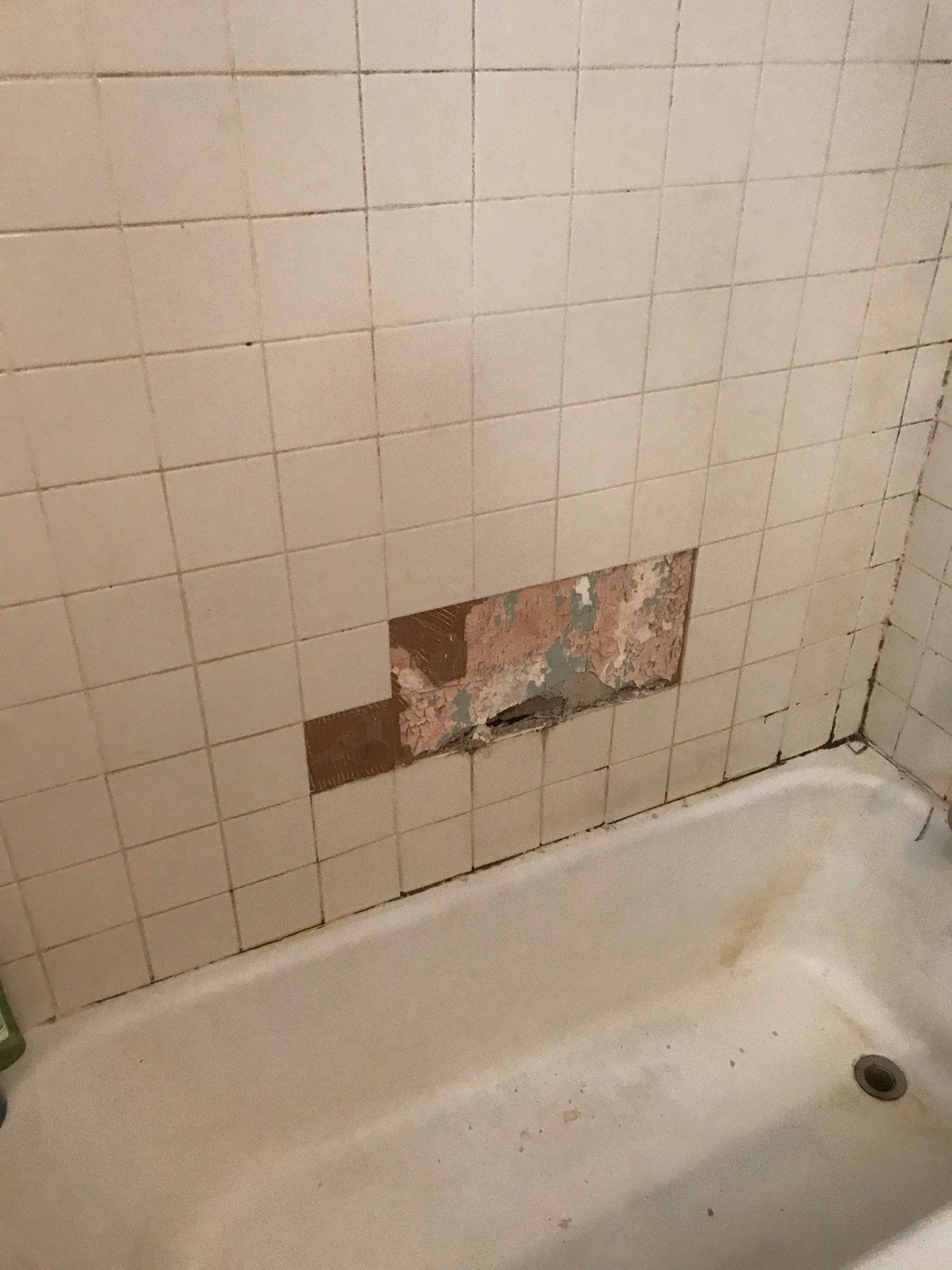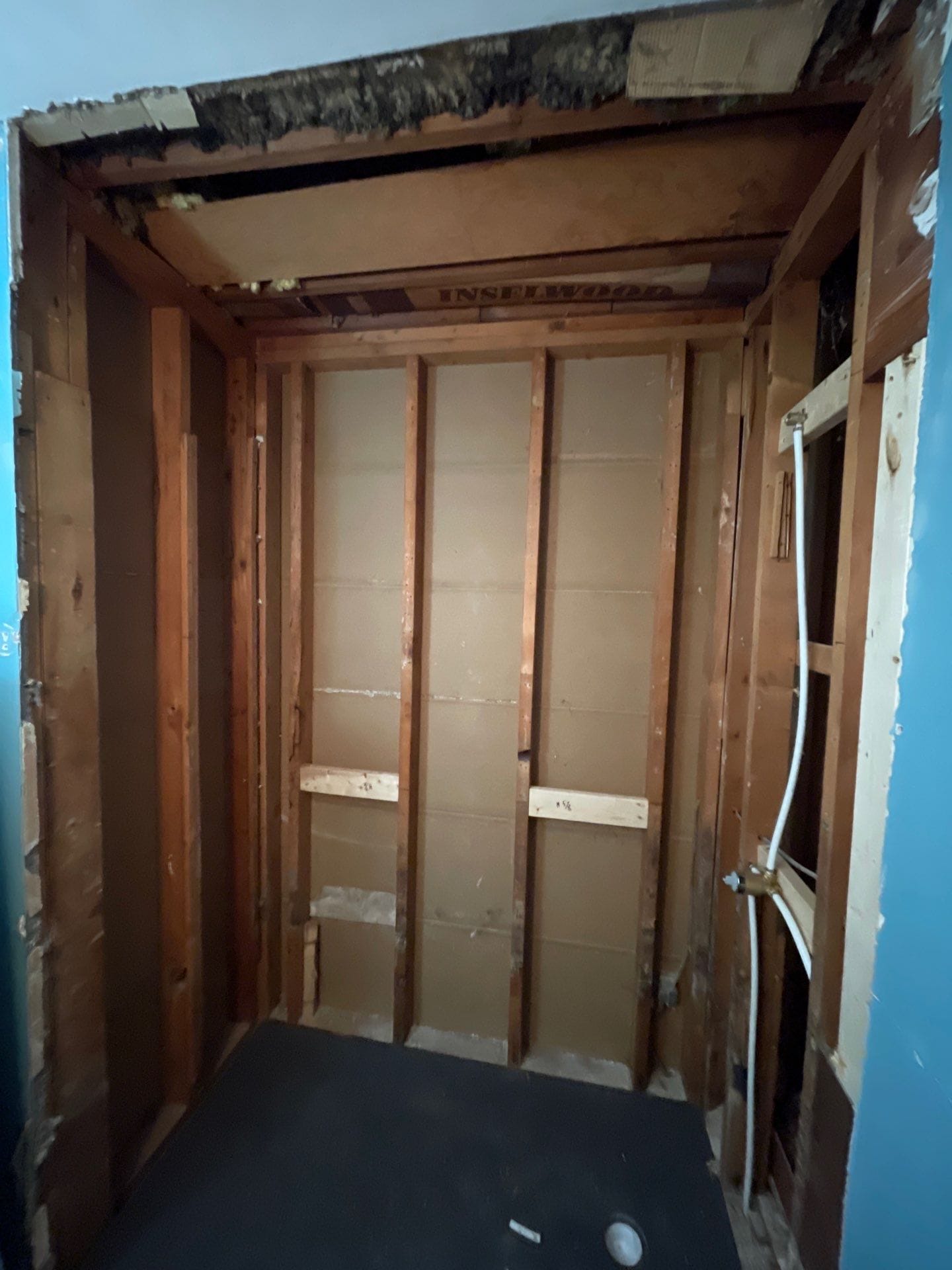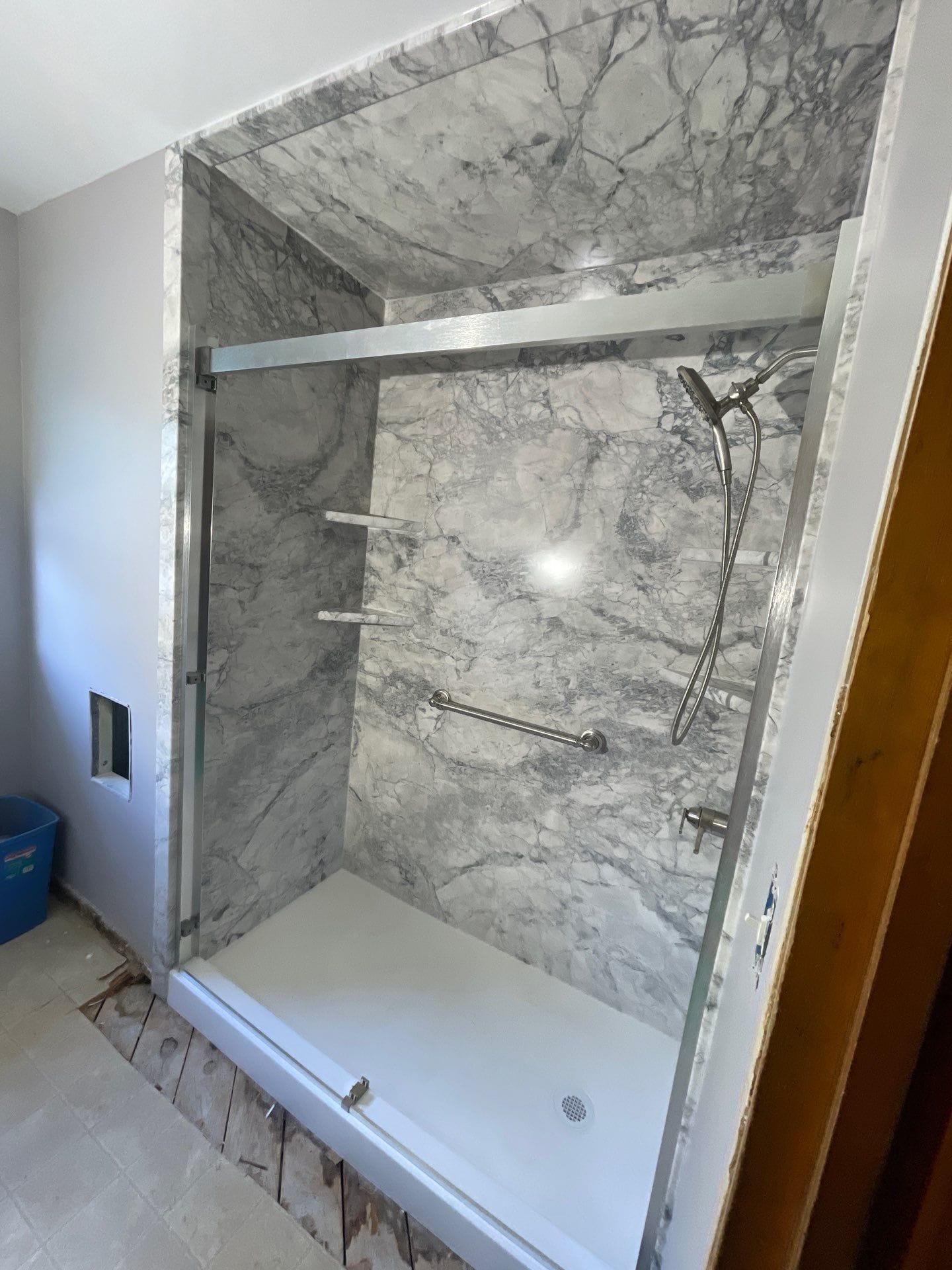 The installation process involved full removal of the existing tub, damaged tile, and compromised wall areas down to the studs to properly address visible deterioration and potential moisture issues. A new low-threshold, slip-resistant shower base was installed along with waterproof backing materials and full-height wall panels extending to the ceiling. The completed shower included built-in corner shelving, a handheld shower system, a fold-down seat for seated use, and strategically placed grab bars for stability. A sliding glass door enclosure was installed to provide a secure and enclosed shower space. The installation was completed efficiently with protection of the surrounding area and thorough cleanup.