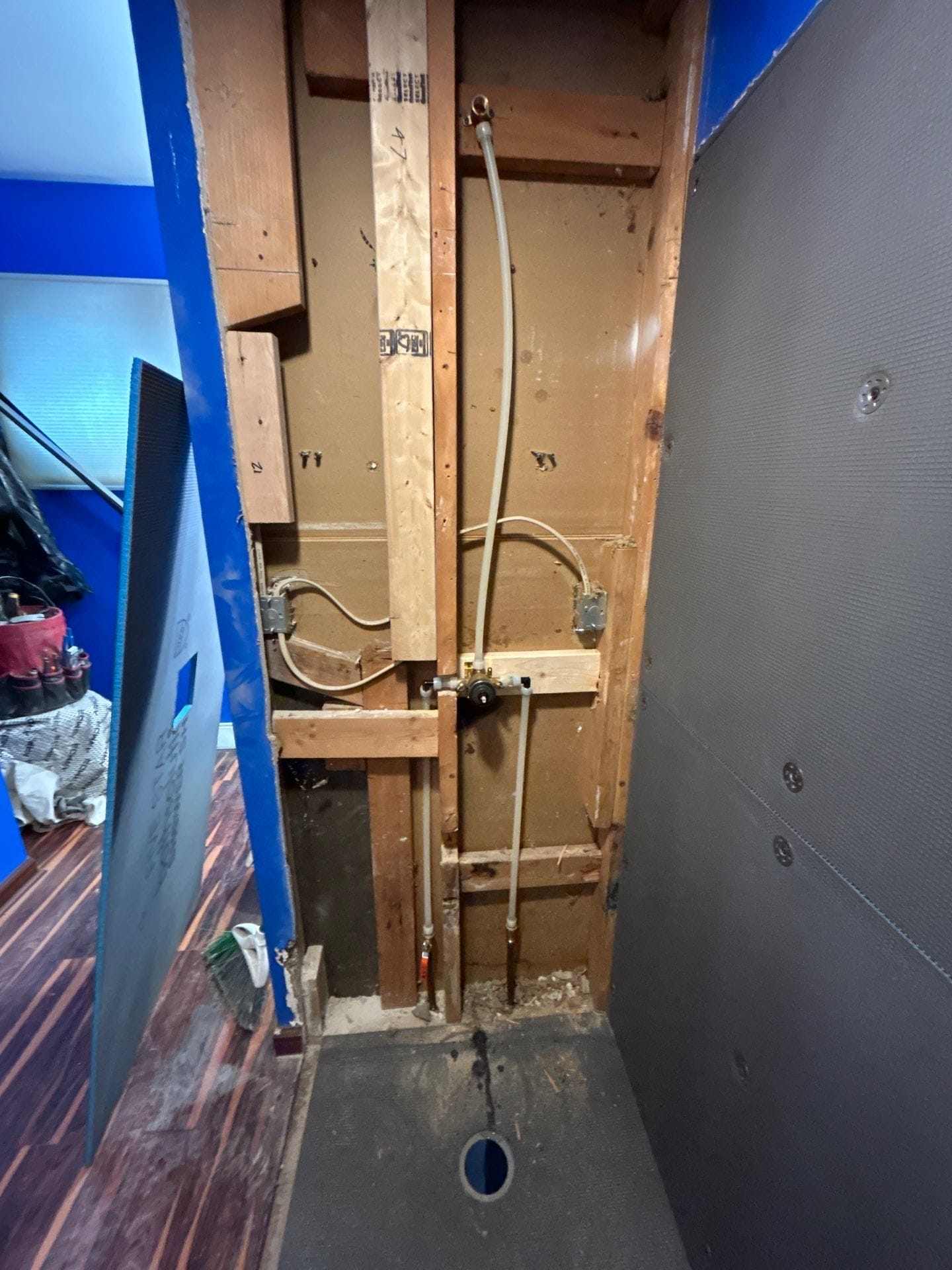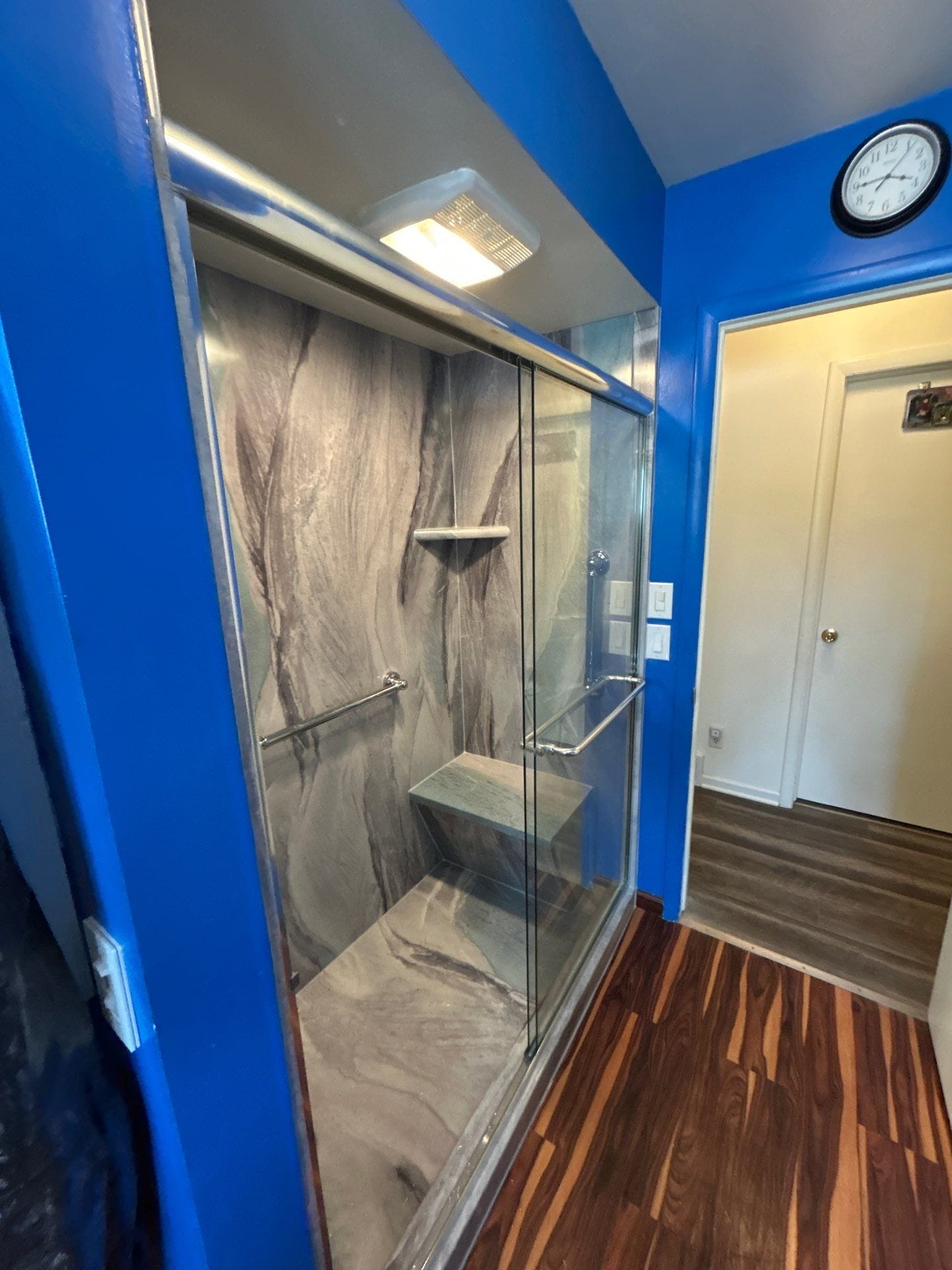 The installation process involved full removal of the existing tub and tile down to the studs, allowing for proper inspection and correction of any underlying issues. A new low-threshold shower base was installed along with waterproof backing materials and custom-fit wall panels. The final design included integrated corner shelving, a mounted handheld shower system, and multiple grab bars for added stability. A sliding glass door system was installed to complete the enclosure. The entire installation was completed efficiently within a short timeframe, with care taken to protect the surrounding space throughout the project.