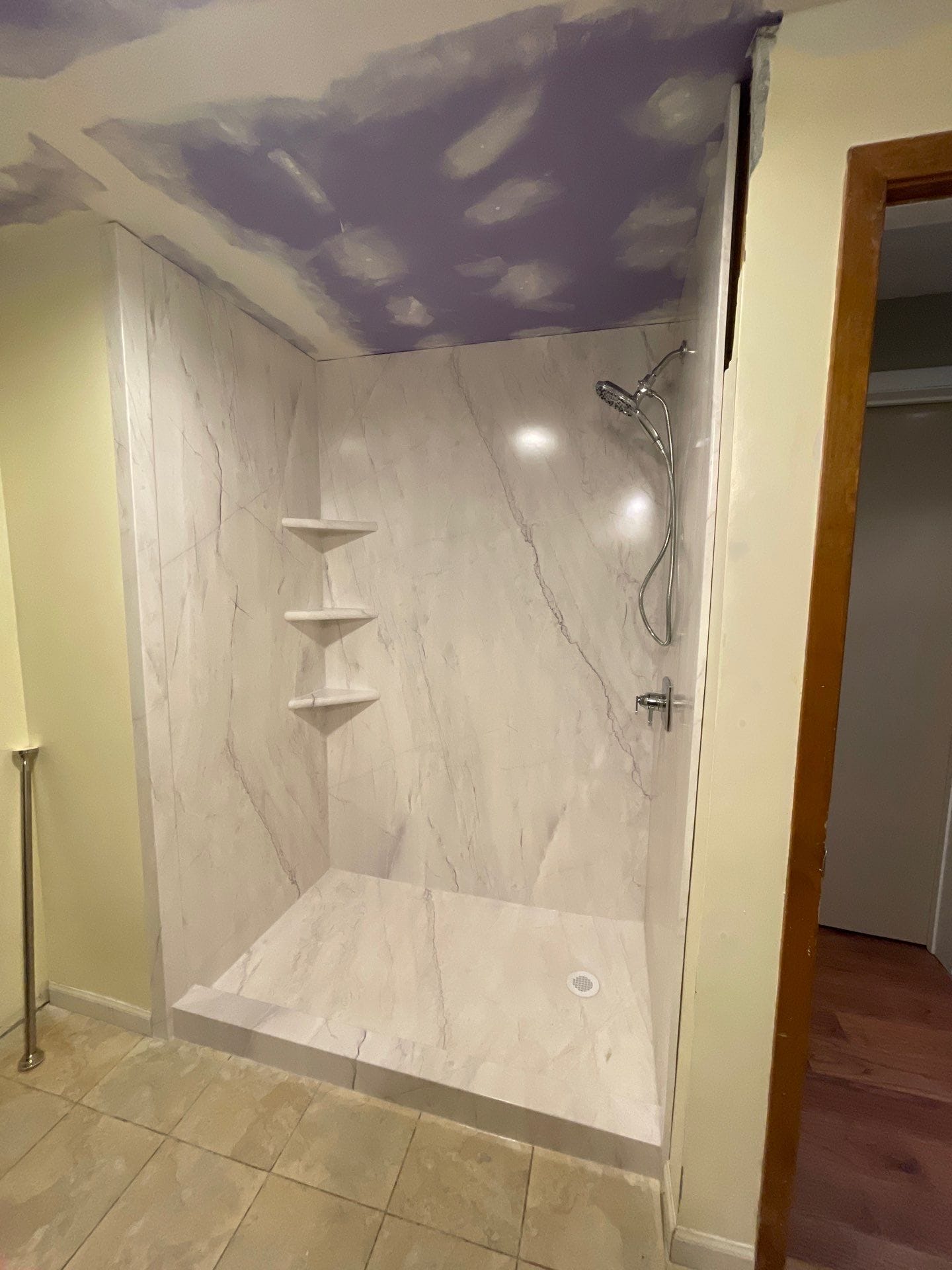 The Five Star Bath Solutions representative introduced a USA-made composite wall system with a matte stone-look finish that resists mold and eliminates the need for grout. The walls and base were selected in a soft marble-gray pattern, aligned with the customer’s desire for a light, non-busy color palette. The solid shower base includes a textured non-slip surface with a low 3-inch threshold for easier entry. Safety was addressed with anchored chrome grab bars and Delta’s all-metal handheld shower system, while integrated corner shelving was added for real bottle storage.