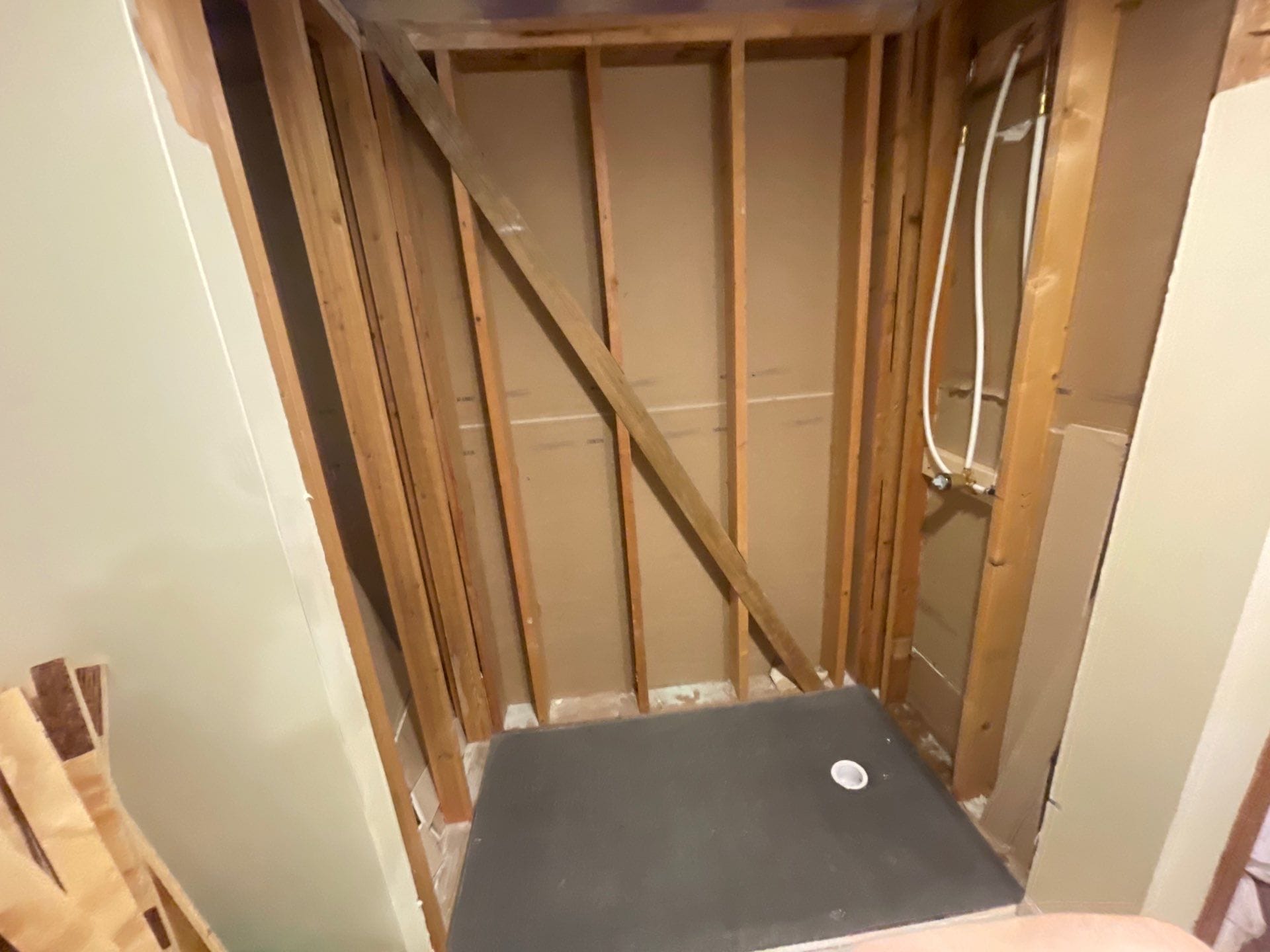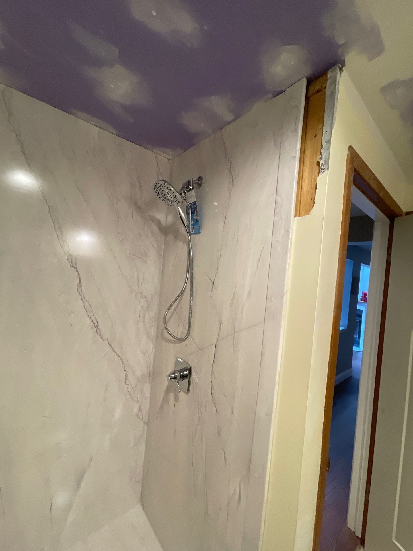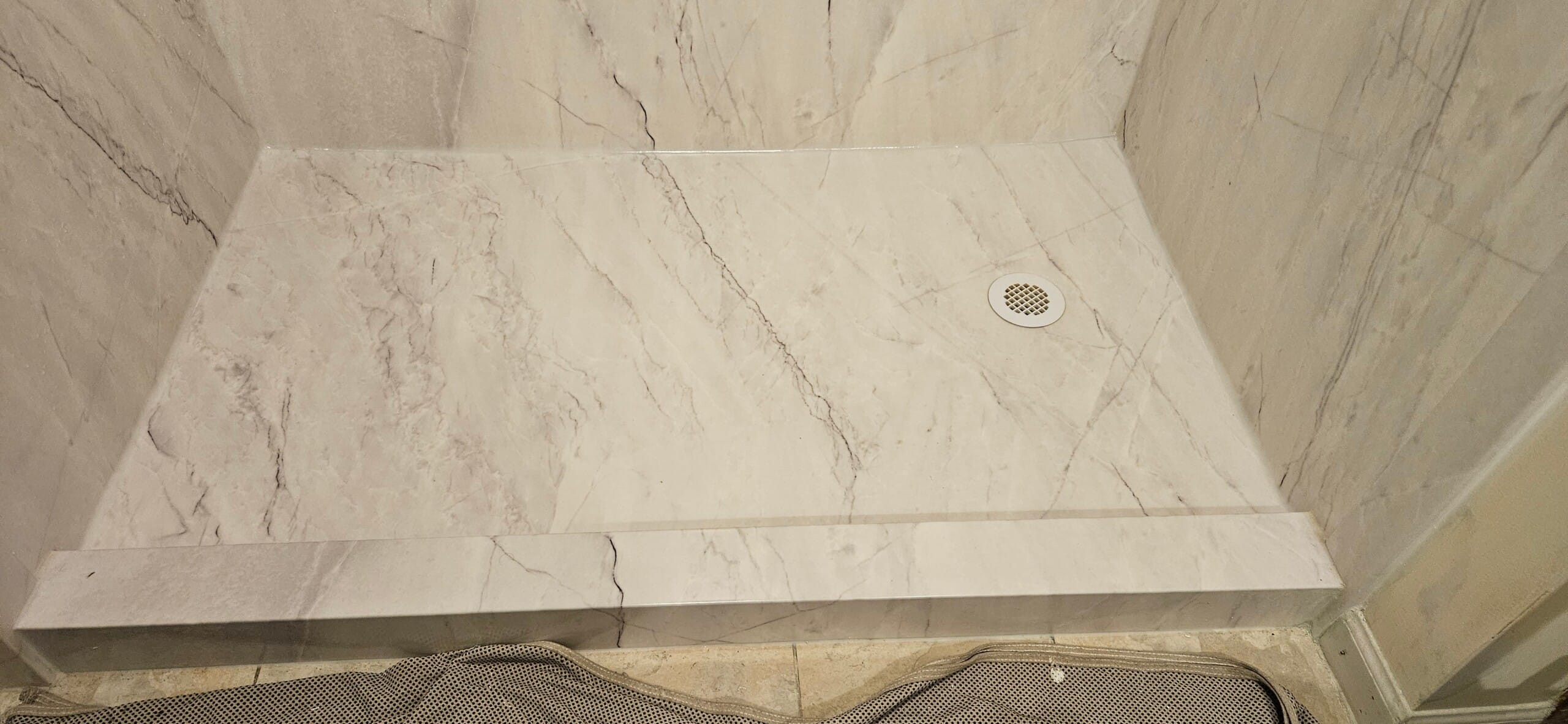 Installation began with full removal of the existing tub and surrounding drywall, followed by inspection and remediation for any hidden damage. Walls were reconstructed using a hydro block backing board that is non-organic and mold-proof. The solid composite shower floor was fabricated to exact site measurements, ensuring no gaps or flex beneath the surface. Panel seams overlapped cleanly with no exposed joints, and wall finish was extended to the outer return, preserving the bathroom’s layout and trim without disruption to flooring or adjacent elements.