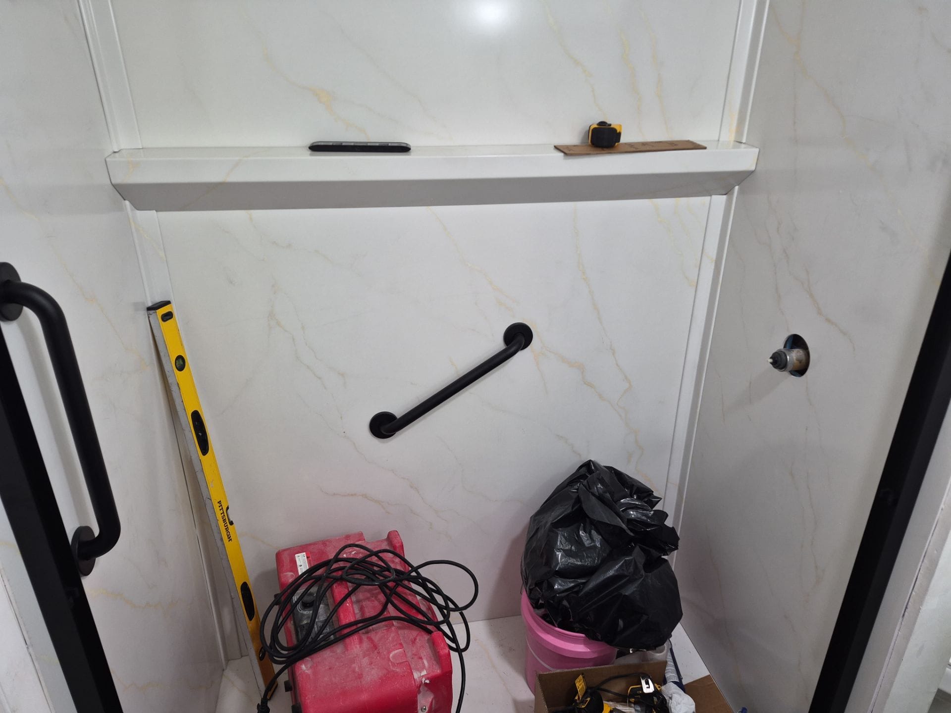 Installation followed a structured process beginning with removal of the existing tub and preparation of the bathing area. Walls were reinforced and fitted with waterproof backing before installation of the new shower base, wall panels, fixtures, and accessories. A low-threshold shower pan replaced the original tub to improve accessibility. The upgraded space includes a built-in bench, integrated shelving, and a glass sliding enclosure with matte black framing. Work was completed efficiently over a short installation window, with attention to cleanliness and minimal disruption.
