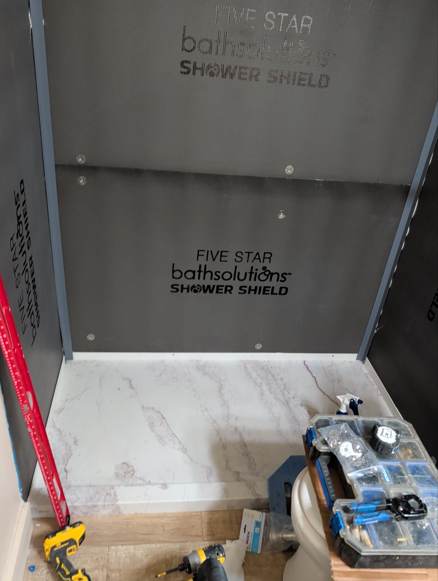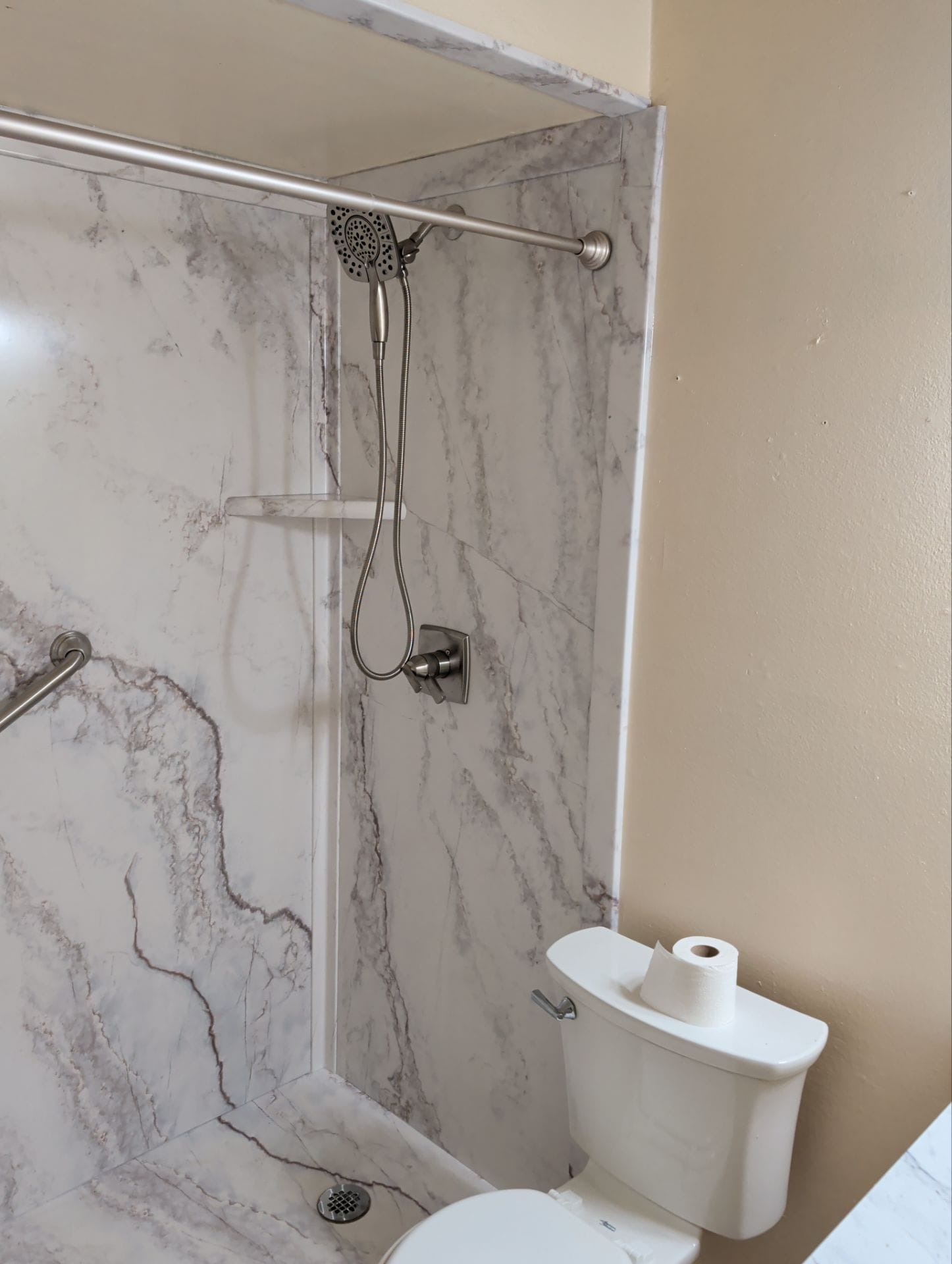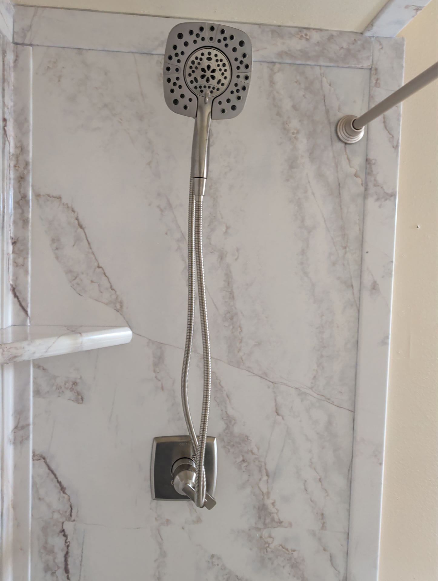 The Five Star Bath Solutions representative explained the benefits of the Smart Choice wall system, a six-layer composite panel designed to replicate natural stone without requiring grout or aggressive cleaning. The walls are protected by a NanoProtect surface infused with antimicrobial silver ions, making them easy to wipe clean and resistant to mold and mildew. The low-profile shower base is constructed from solid PVC and features NanoGrip non-slip texture for stability. Delta ADA-compliant brushed nickel fixtures were included as part of the company’s commitment to safe and long-lasting performance. All products used in the remodel were waterproof and selected for longevity in wet-area conditions.