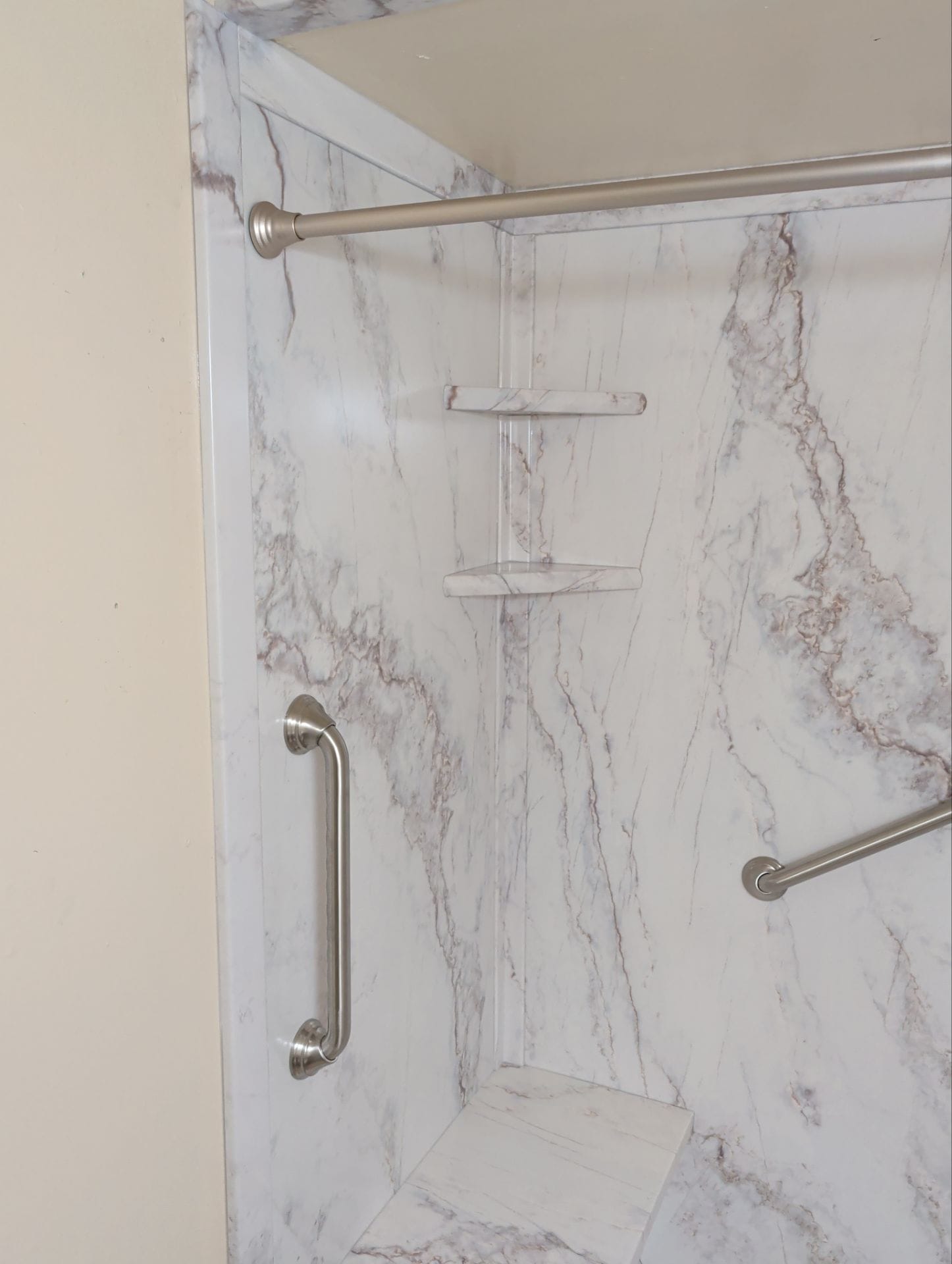 Installation began with full demolition of the existing tub and surround, including wall inspection for moisture damage. The space was rebuilt using mold-resistant backer board prior to panel installation. A corner bench seat was securely integrated, and grab bars were mounted with blocking for added support. Accessories and fixtures were placed according to pre-approved layout, and a shower rod was installed across the unit. The installation took two days and was completed by corporate-trained employees who followed strict protection protocols for the customer’s home. The project was scheduled approximately five to six weeks after the planning visit.