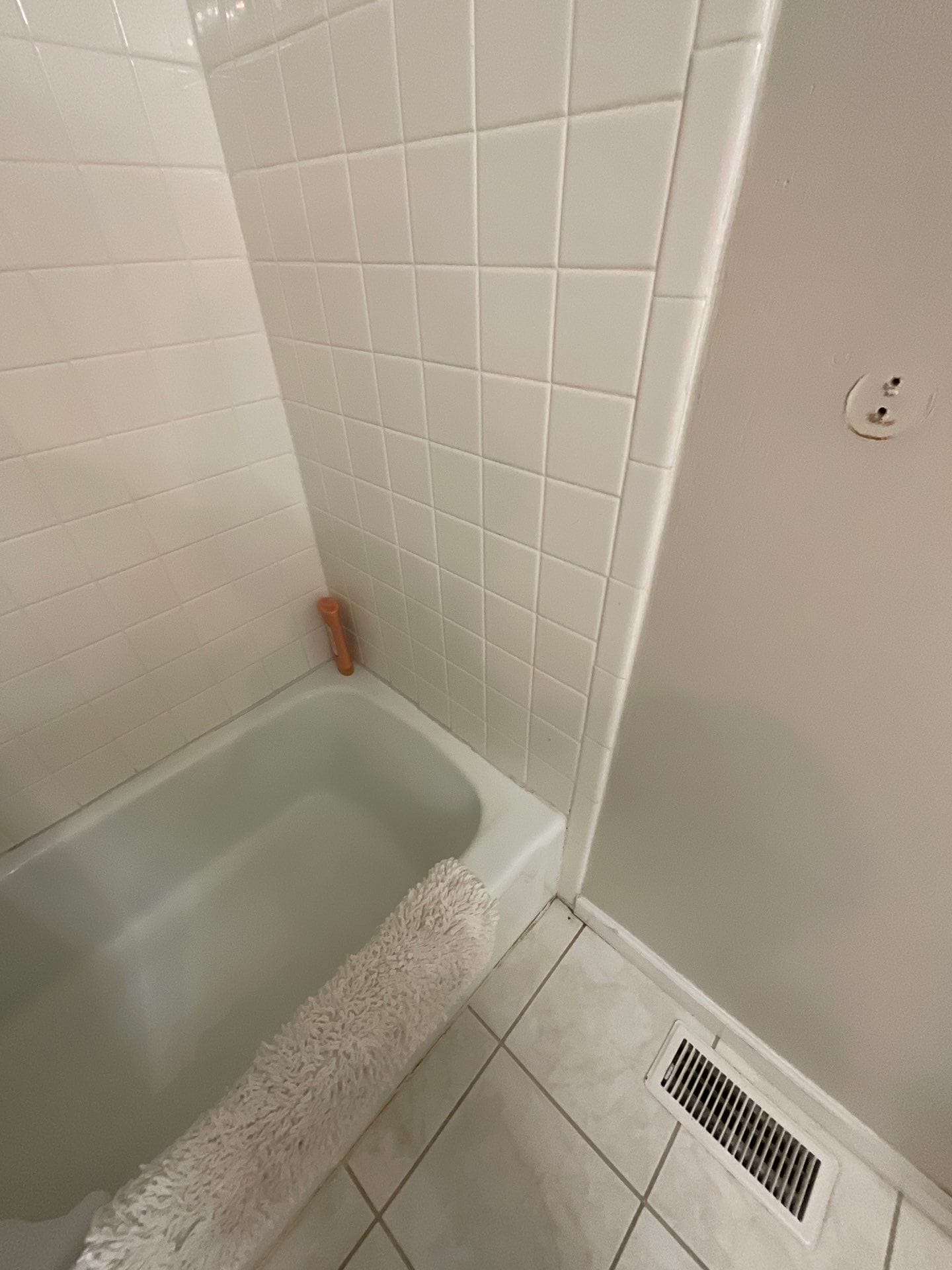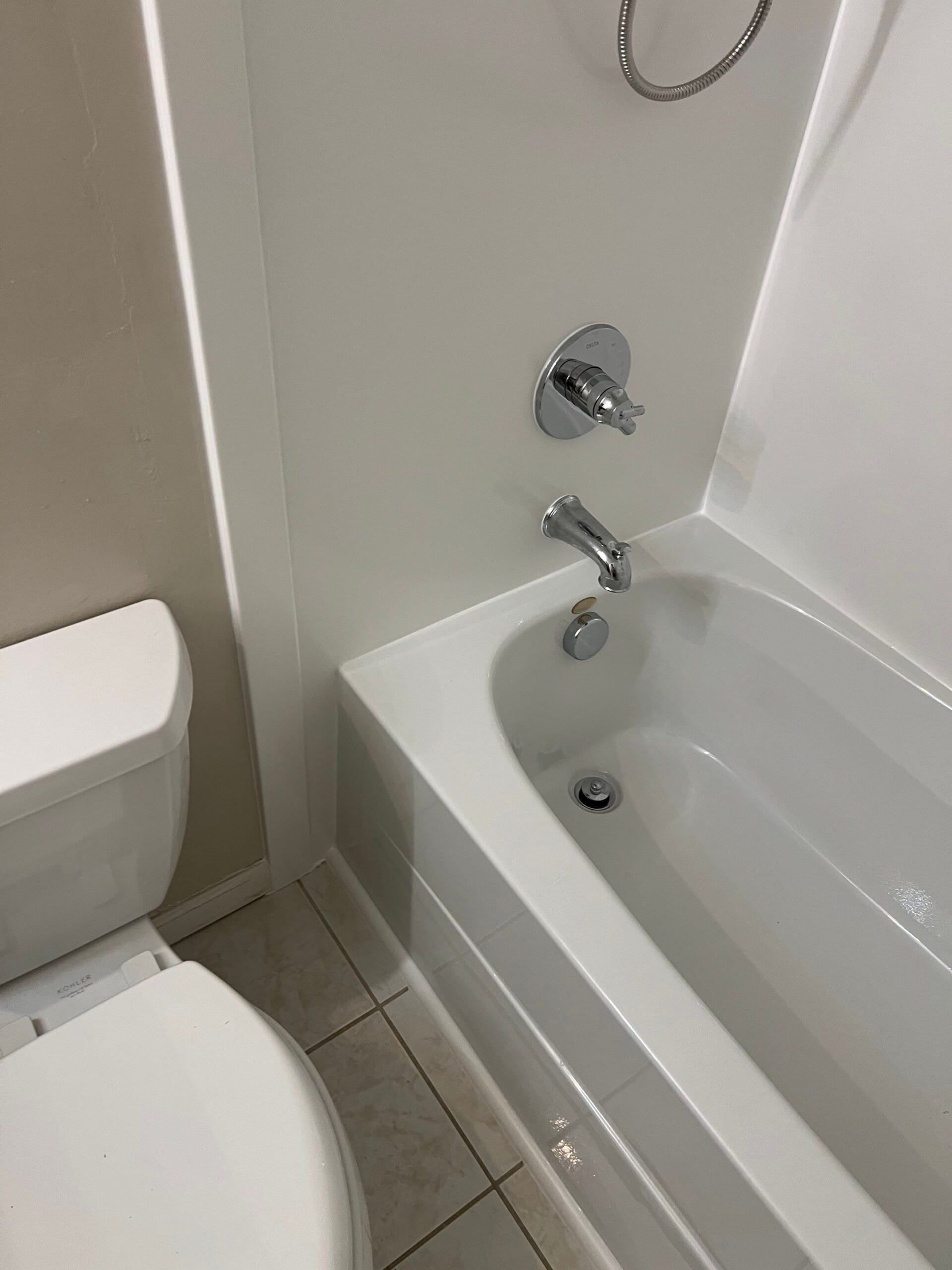 * Bath and shower combo with white acrylic tub and seamless composite surround