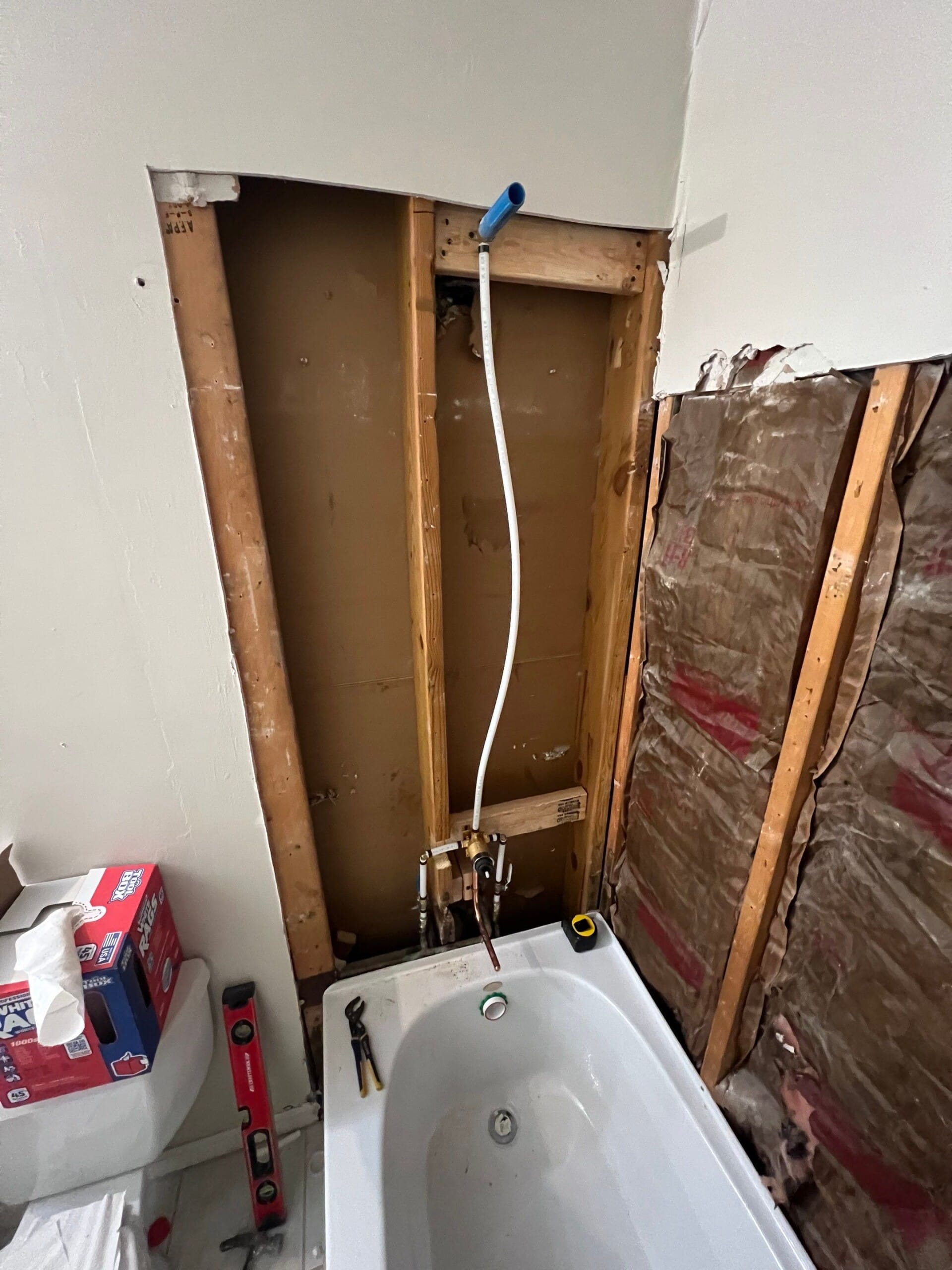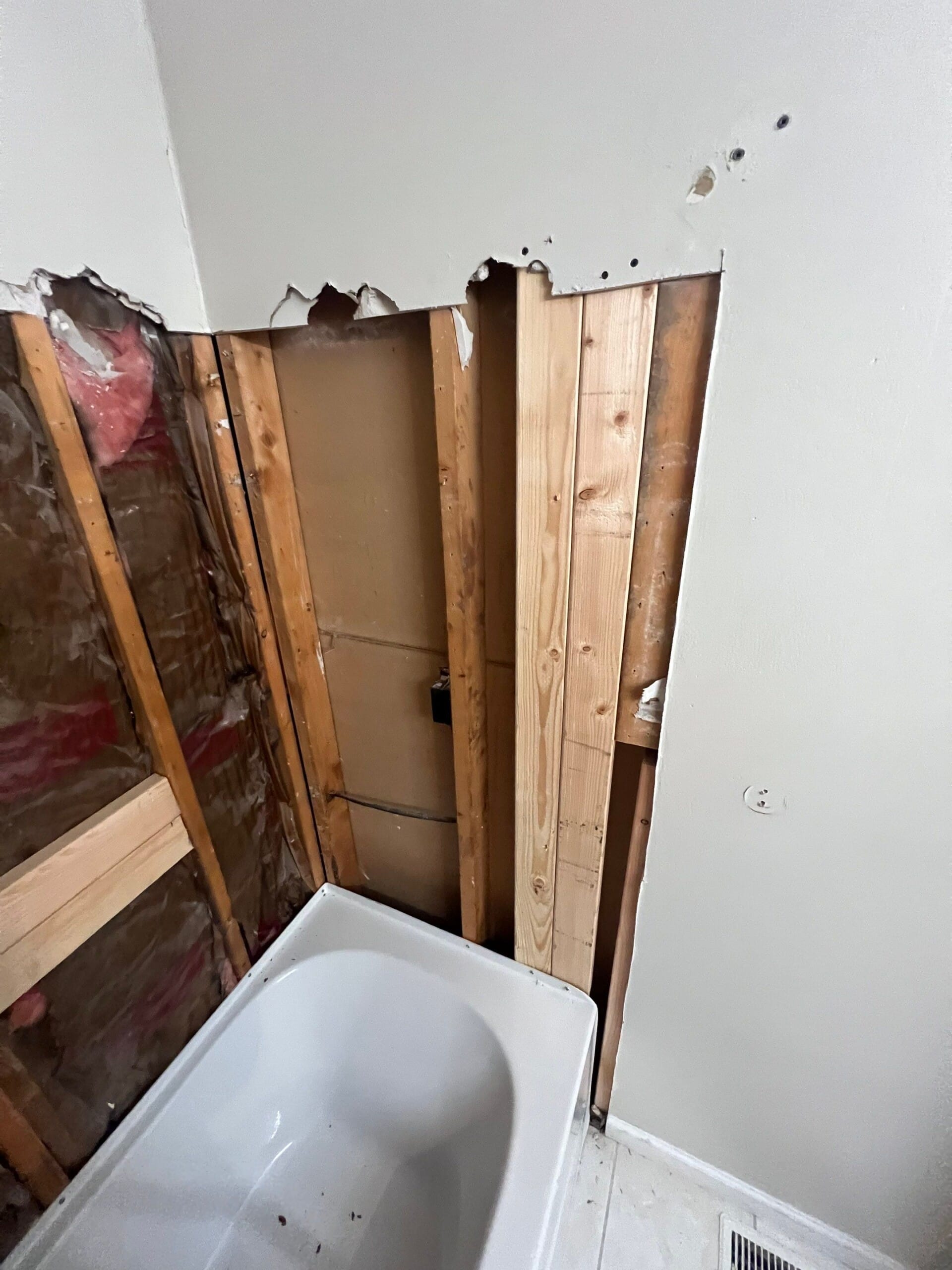 Installation included removal of all original components, plumbing updates, subfloor inspection and reinforcement, composite surround paneling, tub setting, and fixture mounting. The team completed work in approximately three days, coordinating with the customer to install the existing toilet and vanity post-demolition. Tom advised that painting could be completed by the homeowner to reduce costs.