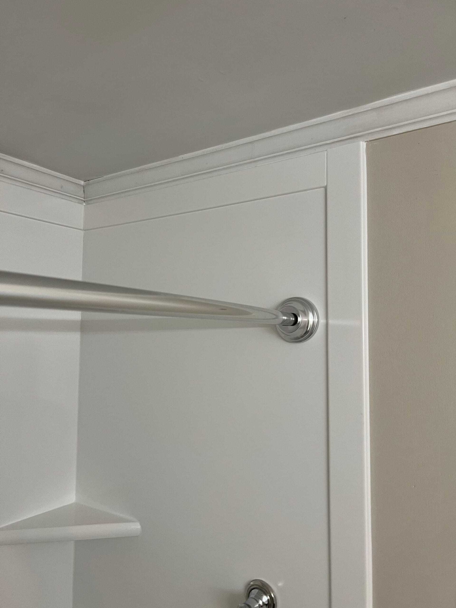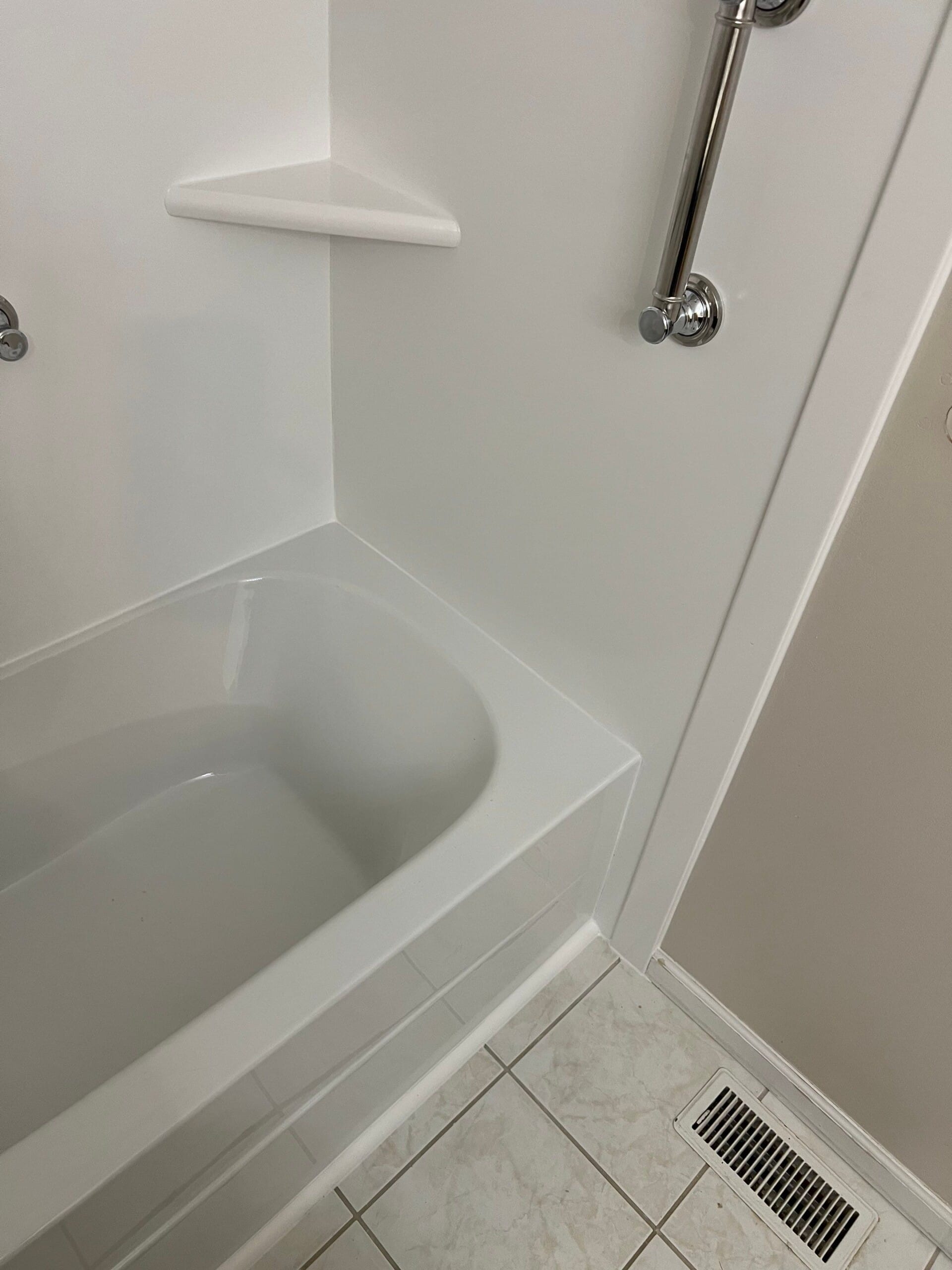 The selected upgrade replaced the existing tile-and-tub configuration with a low-maintenance white acrylic system. A two-head handheld shower unit in brushed nickel finish was installed, paired with a secure curved curtain rod. Safety features included two brushed nickel grab bars, one centered on the rear wall and one mounted vertically near the front entry, and a corner storage shelf was integrated to maximize convenience. The neutral, seamless surround complemented the gray wall tones and updated flooring, producing a clean and modern finish.