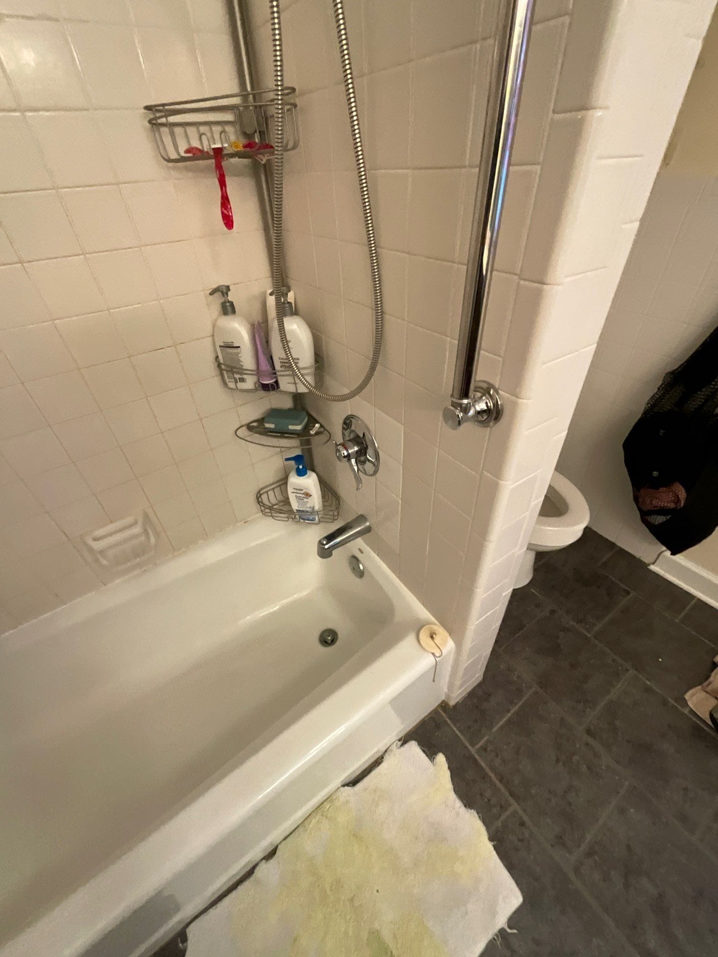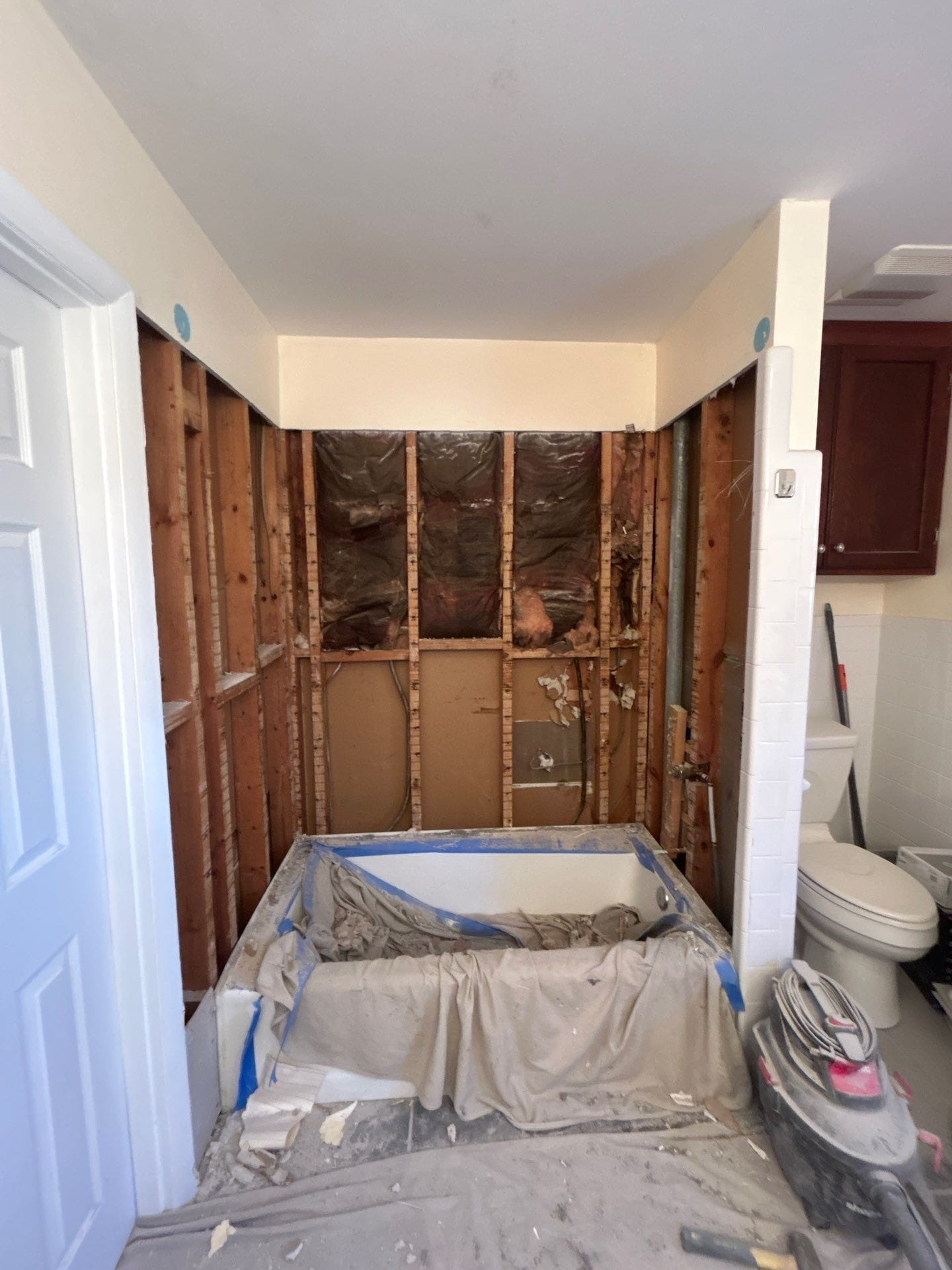 Installation began with full demolition down to the studs and water damage repair around the leaking base. A new standard-depth tub was installed along with Delta chrome fixtures and a handheld shower for flexibility. Wall panels were fitted from base to ceiling and sealed with permanent, mildew-resistant silicone. The new setup also included a three-tiered corner shelving system for daily essentials. The curved chrome curtain rod provided additional space and was retained per the customer’s preference.