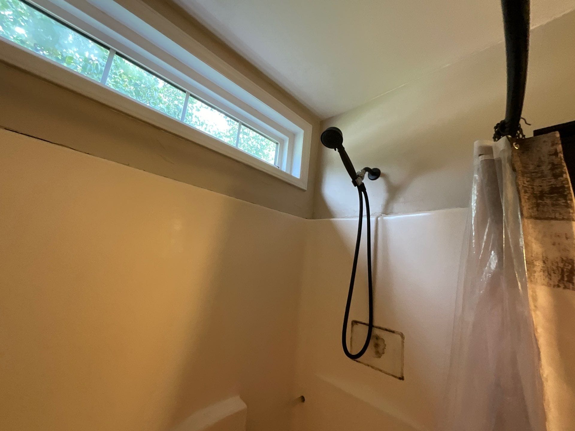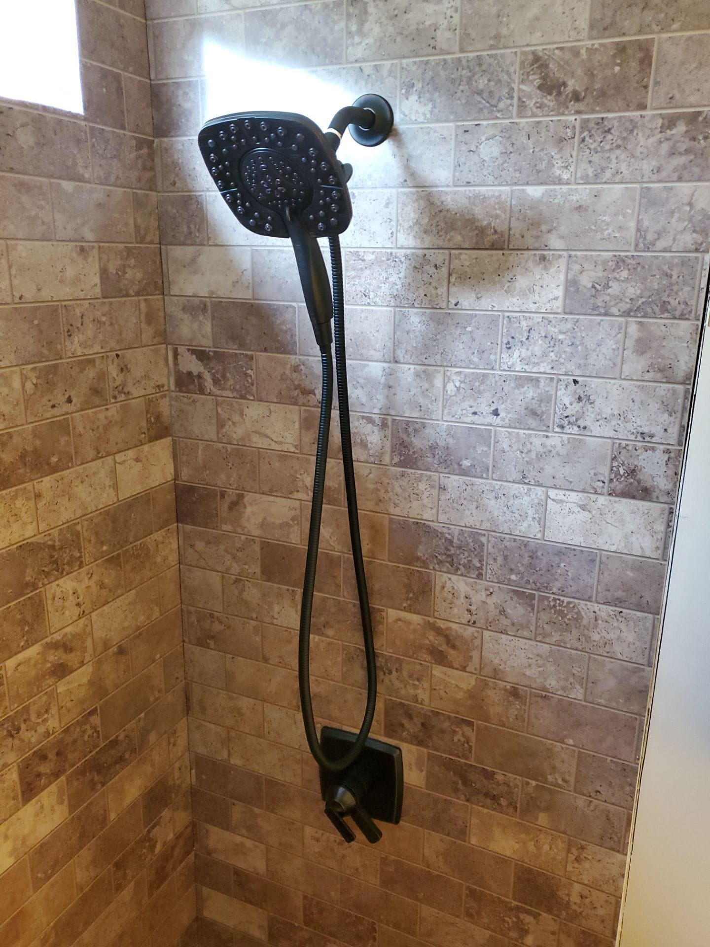 Installation involved a complete removal of the old tub system and surrounding walls, followed by the installation of new waterproof wall panels up to the ceiling. A recessed rectangular niche and integrated footrest were added, and all plumbing fixtures were replaced. Premium barn-style sliding glass doors with matte black framing were installed, and a handheld matte black showerhead was mounted for added functionality. Final cleanup and finishing trim work were completed within a two-day window, with a lead time of six to eight weeks due to scheduling volume.