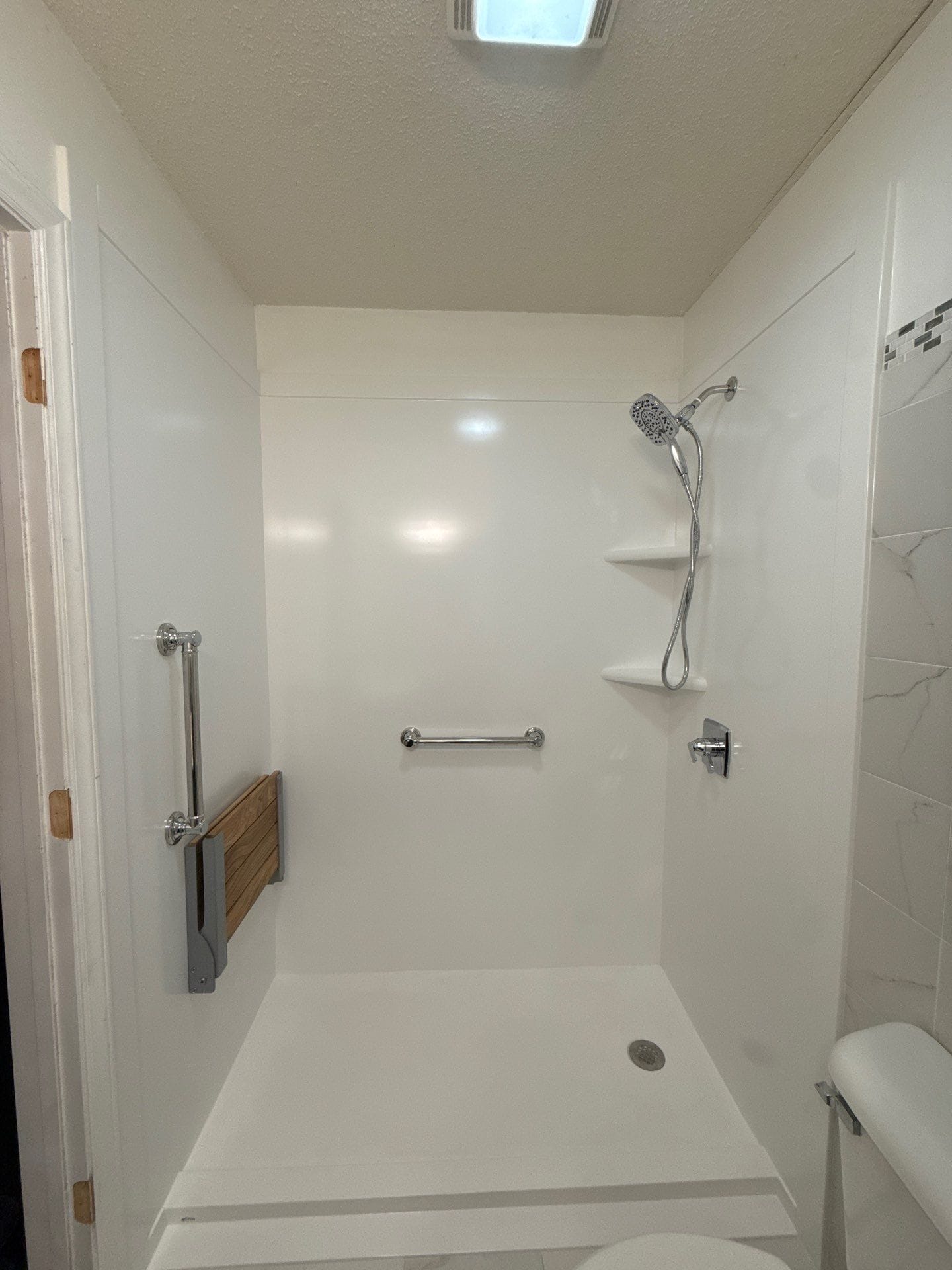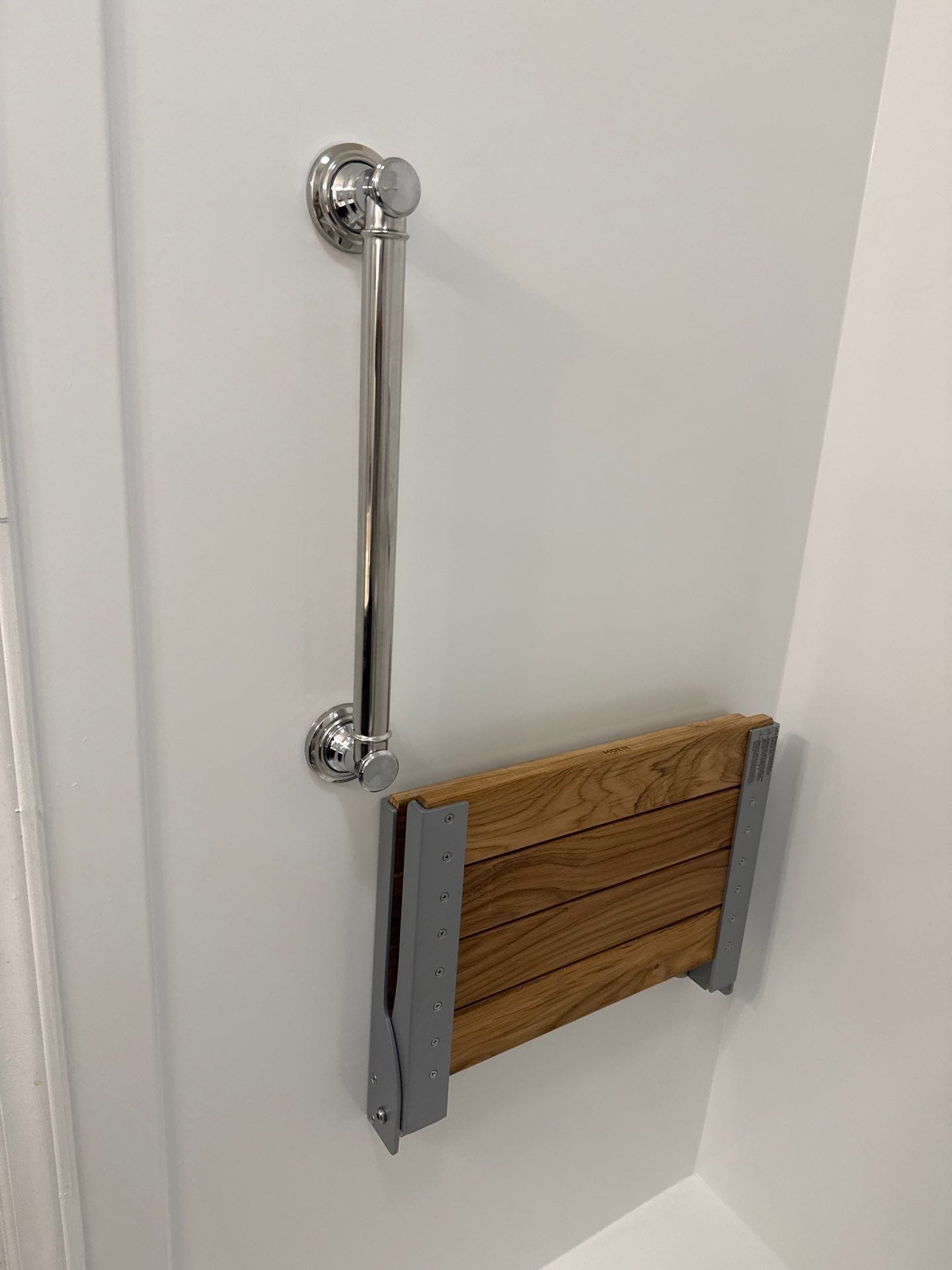 * Fold-down teak bench for seated bathing
