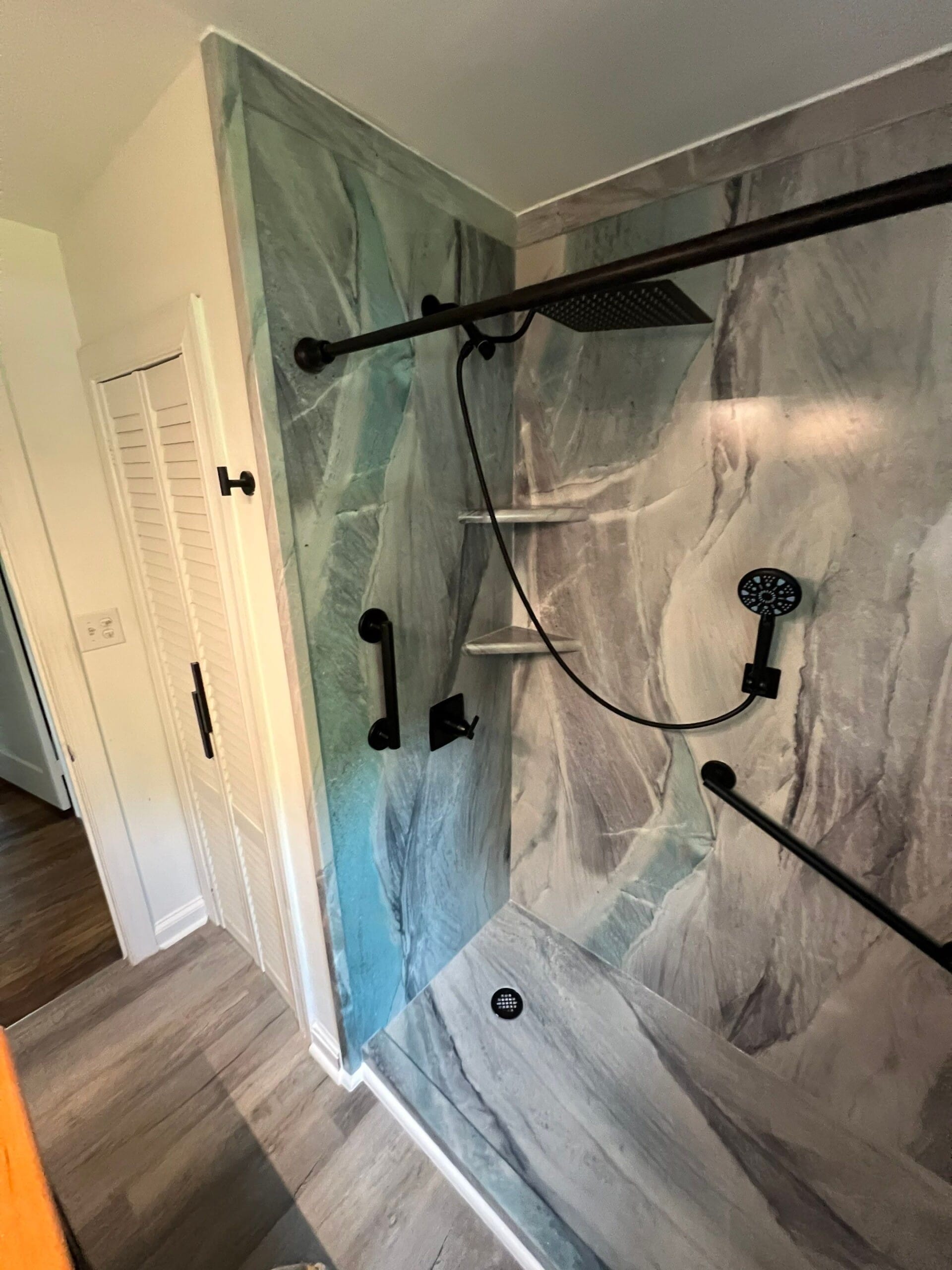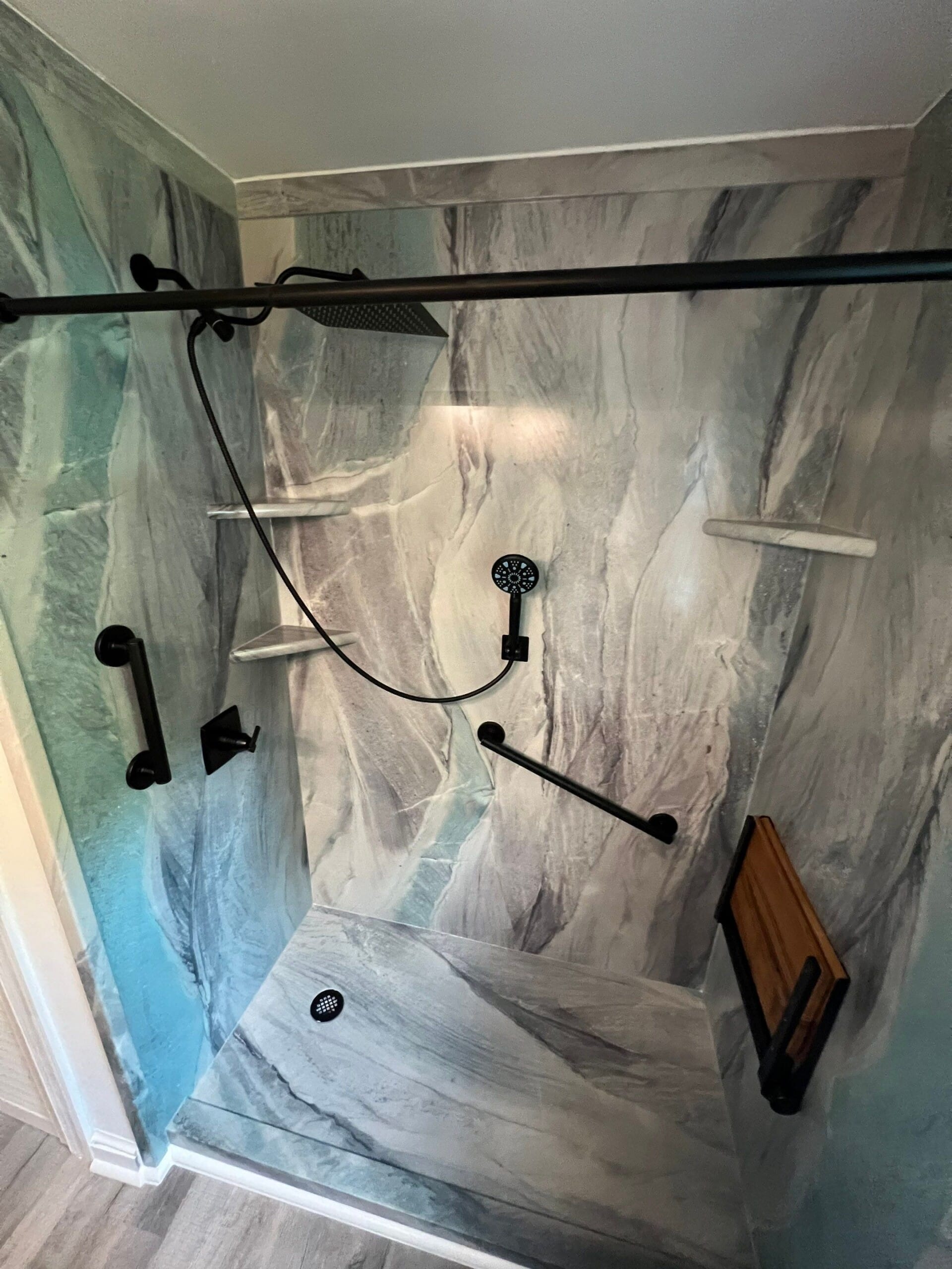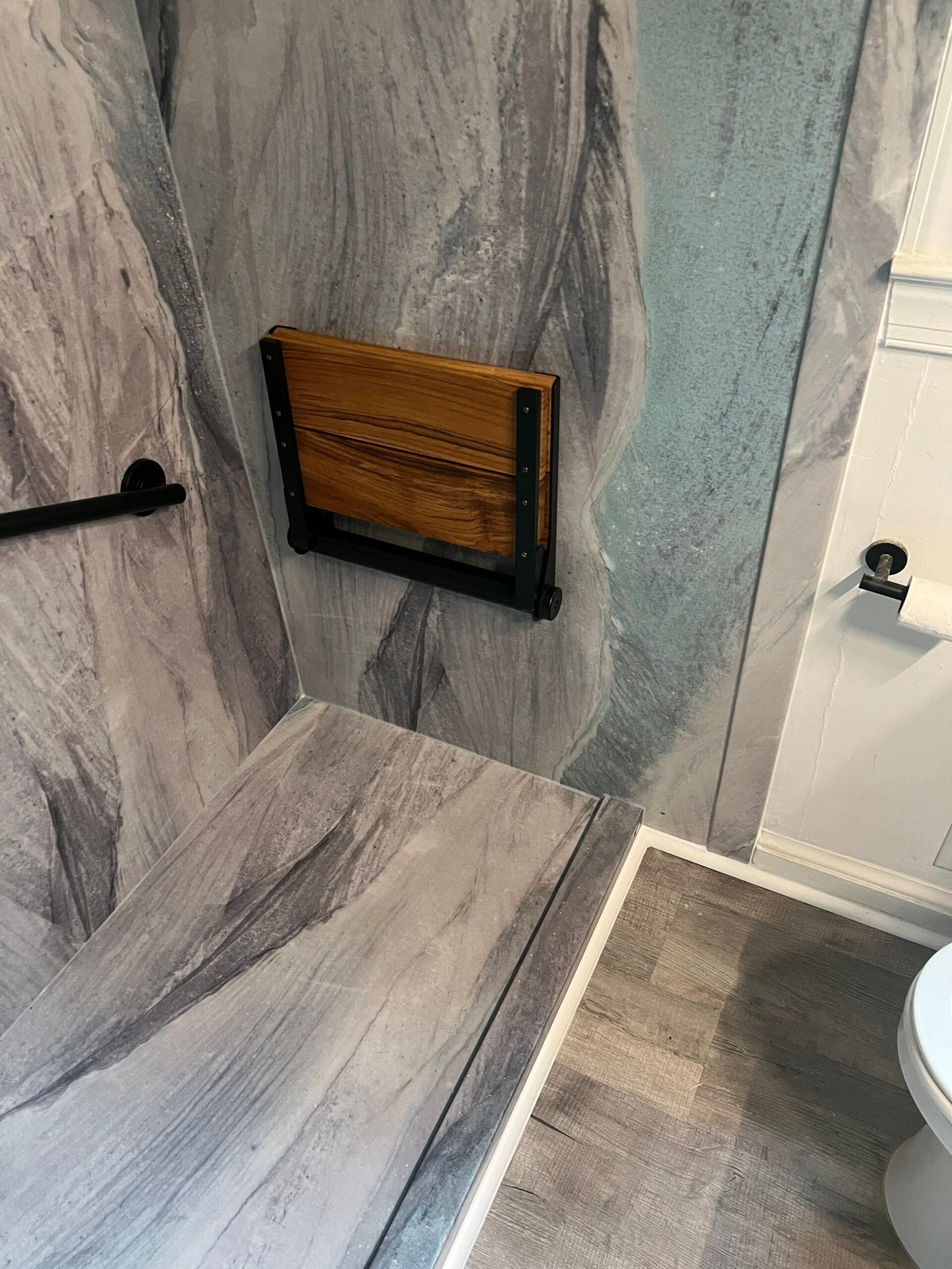 The original tub and tile surround were removed and replaced with a low-threshold walk-in shower featuring a continuous matte wall design in a soft gray and neutral marbled finish. Dark bronze fixtures were selected to contrast the lighter surround and coordinate with the updated aesthetic. The shower was outfitted with a large square rain head, handheld sprayer, three wall-mounted grab bars, and a teak fold-down bench secured to the rear wall. A new floor-to-ceiling panel system was installed and sealed with marine-grade silicone. No door was installed at the time of completion.
