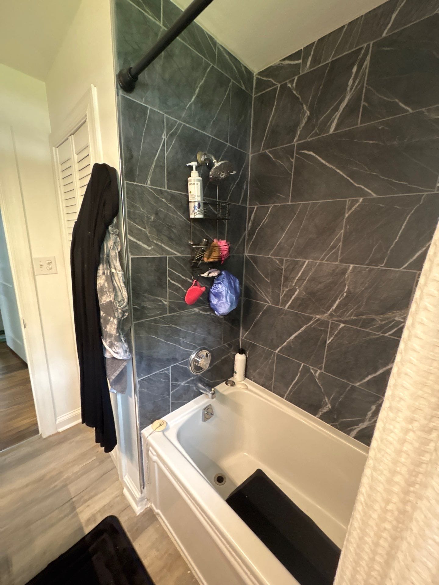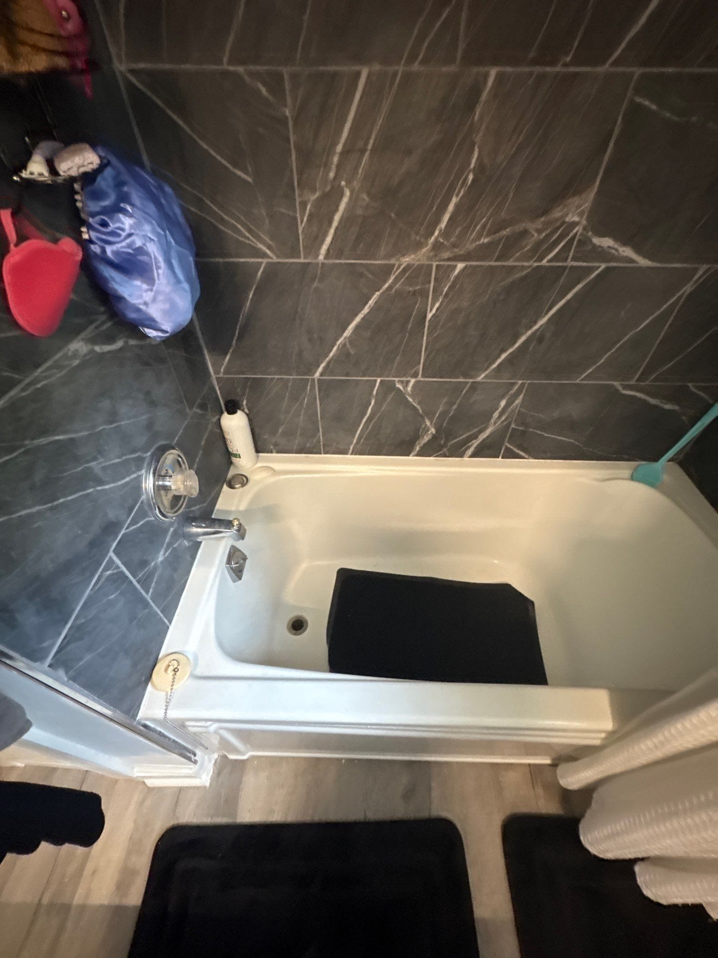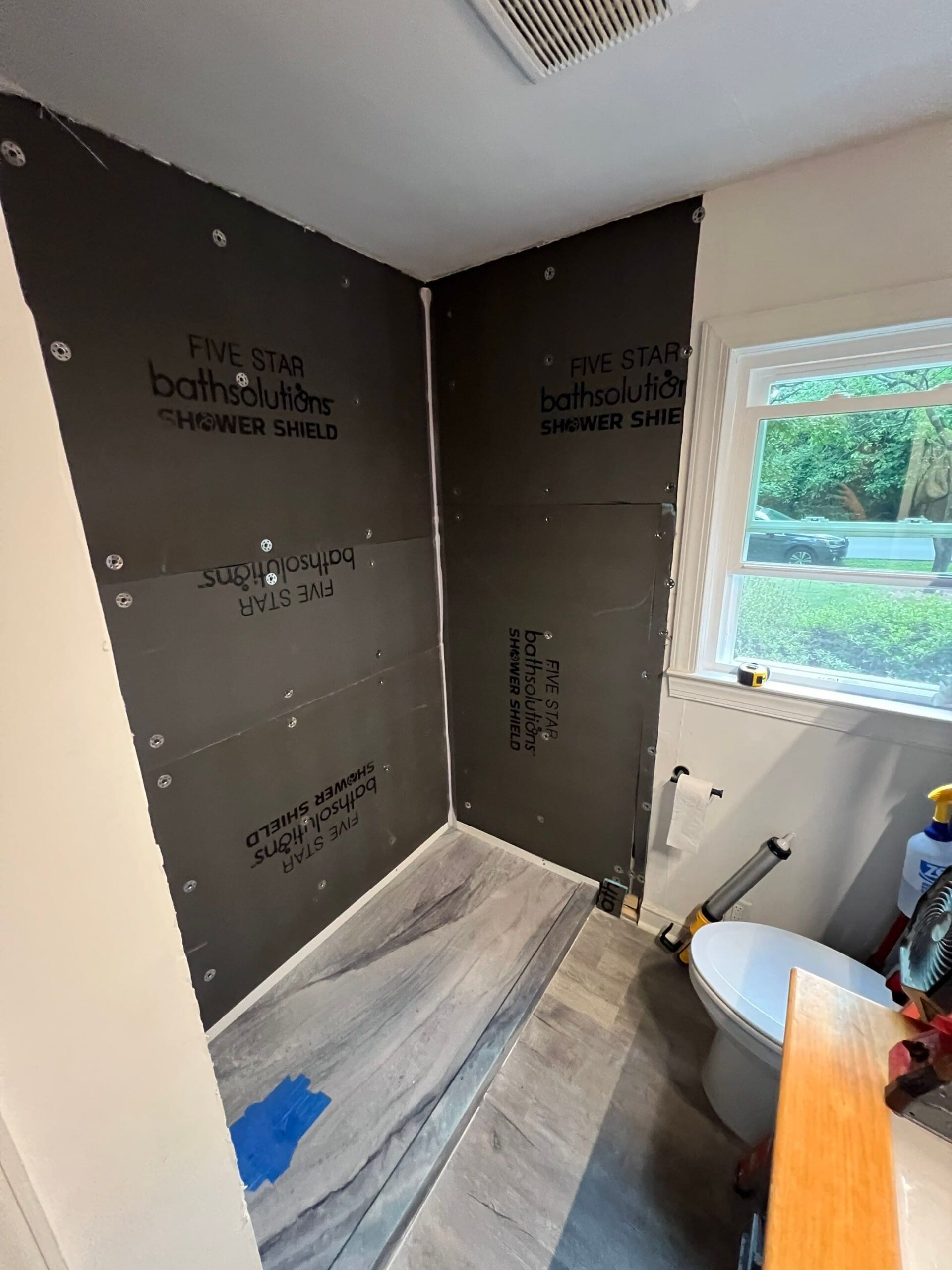 The original tub and tile surround were removed and replaced with a low-threshold walk-in shower featuring a continuous matte wall design in a soft gray and neutral marbled finish. Dark bronze fixtures were selected to contrast the lighter surround and coordinate with the updated aesthetic. The shower was outfitted with a large square rain head, handheld sprayer, three wall-mounted grab bars, and a teak fold-down bench secured to the rear wall. A new floor-to-ceiling panel system was installed and sealed with marine-grade silicone. No door was installed at the time of completion.