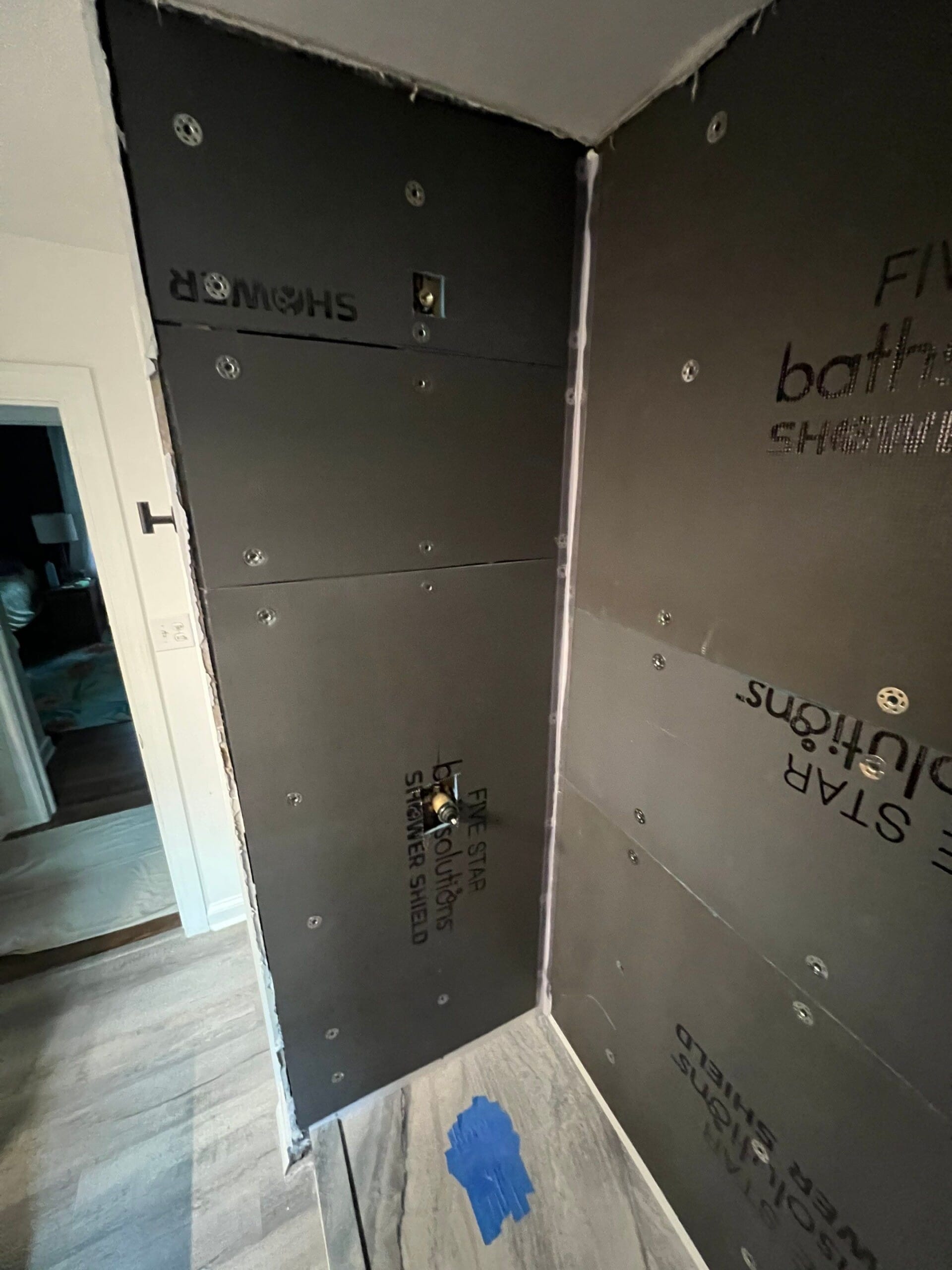 Installation involved complete removal of the existing system down to studs, replacement of the backer board, updated water lines, and reinstallation of all fixtures, seating, and wall components. Marine-grade silicone was applied throughout all seams. Installation was scheduled for 2–3 days with a detailed hard measure beforehand to confirm dimensions. The customer was advised that the timeline from purchase to installation would allow sufficient time for planning and custom fabrication.