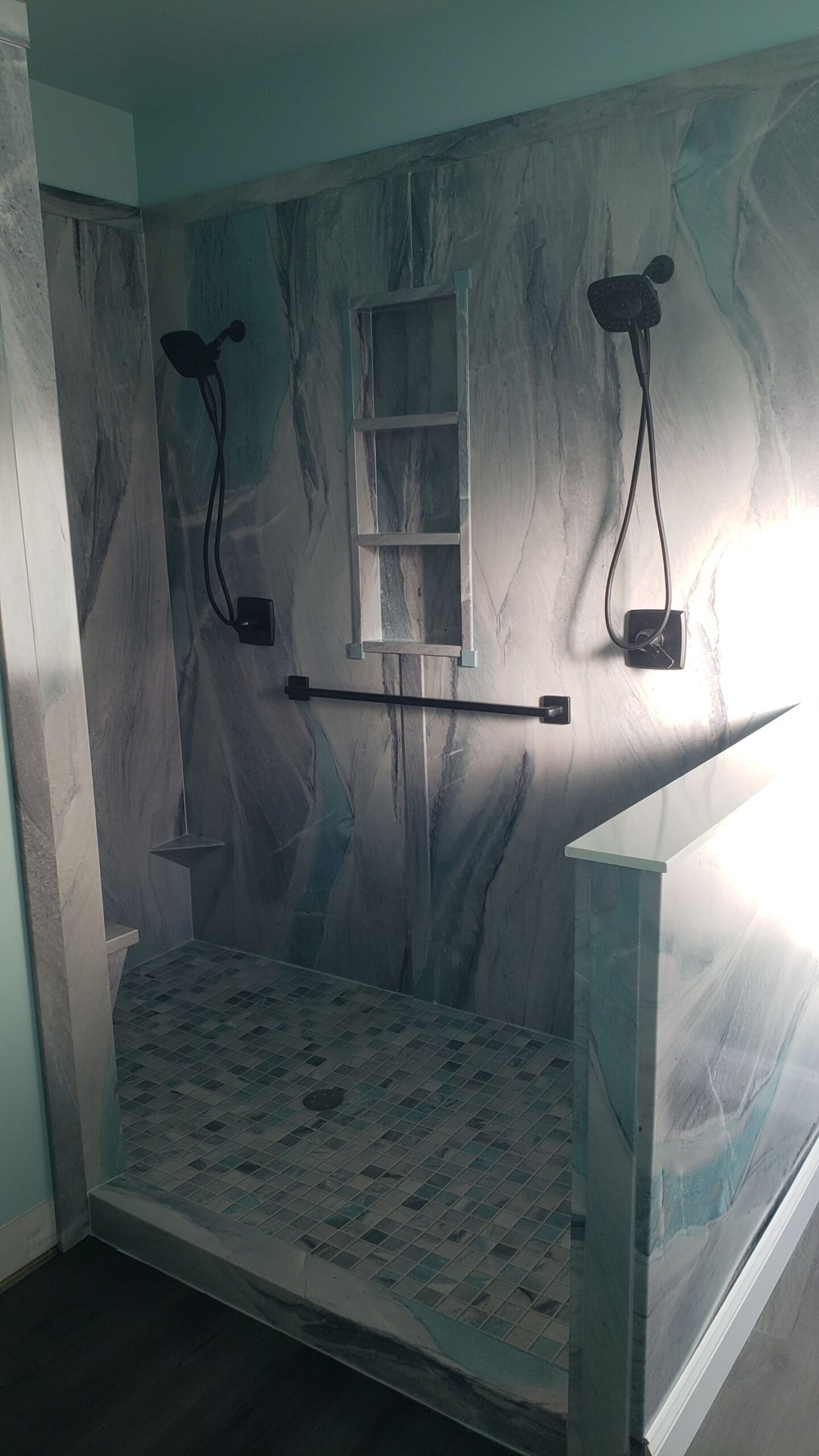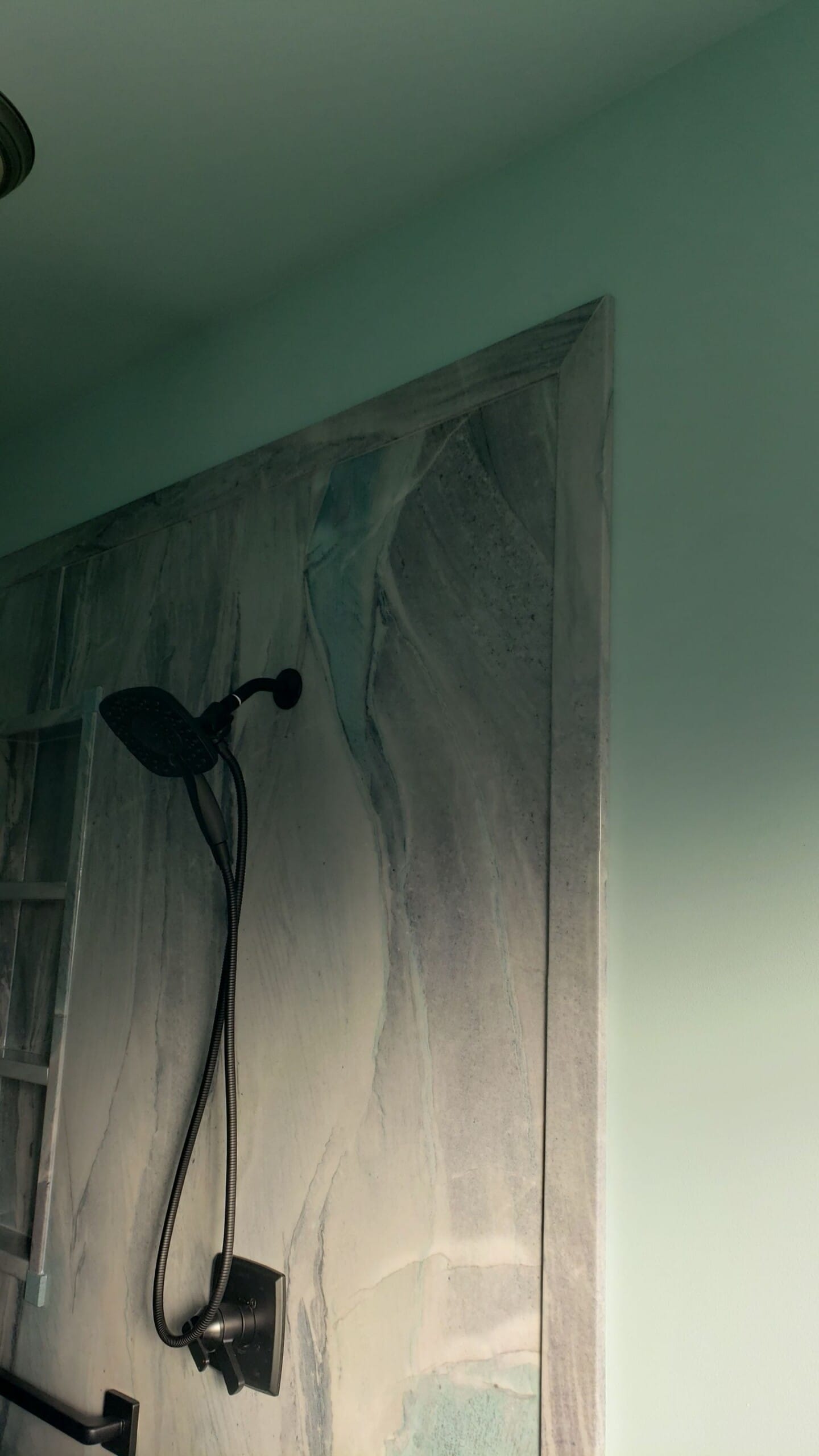 * White Pearl marble-look composite wall panels, trimmed at 85"