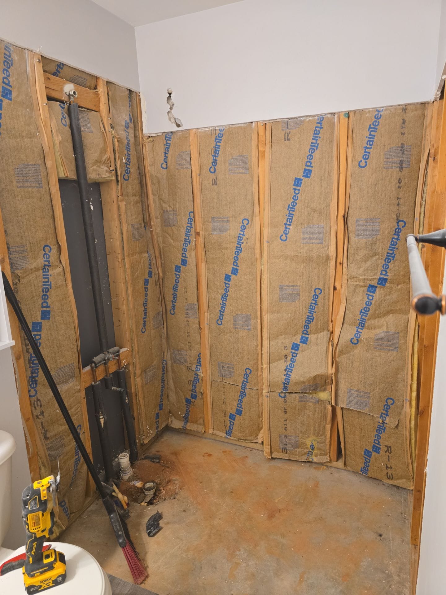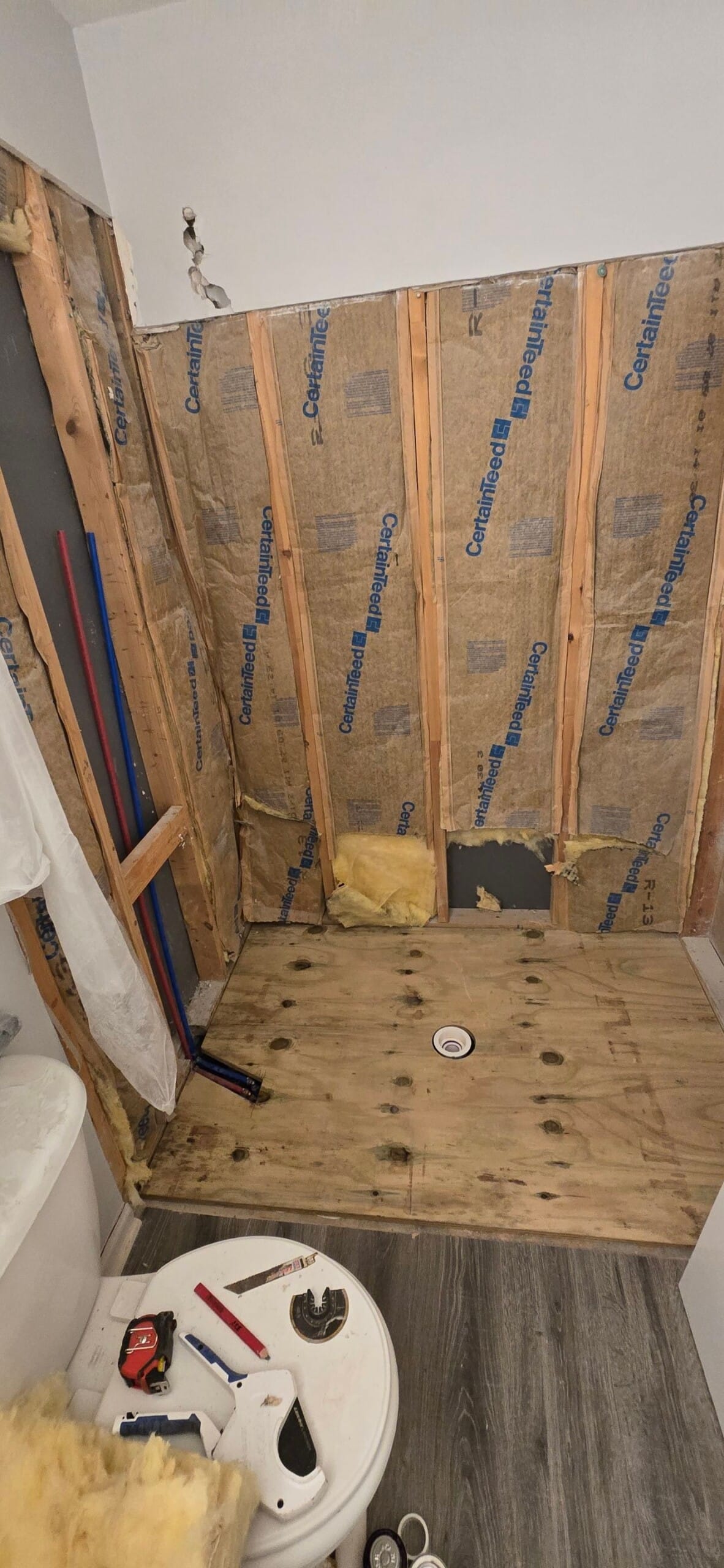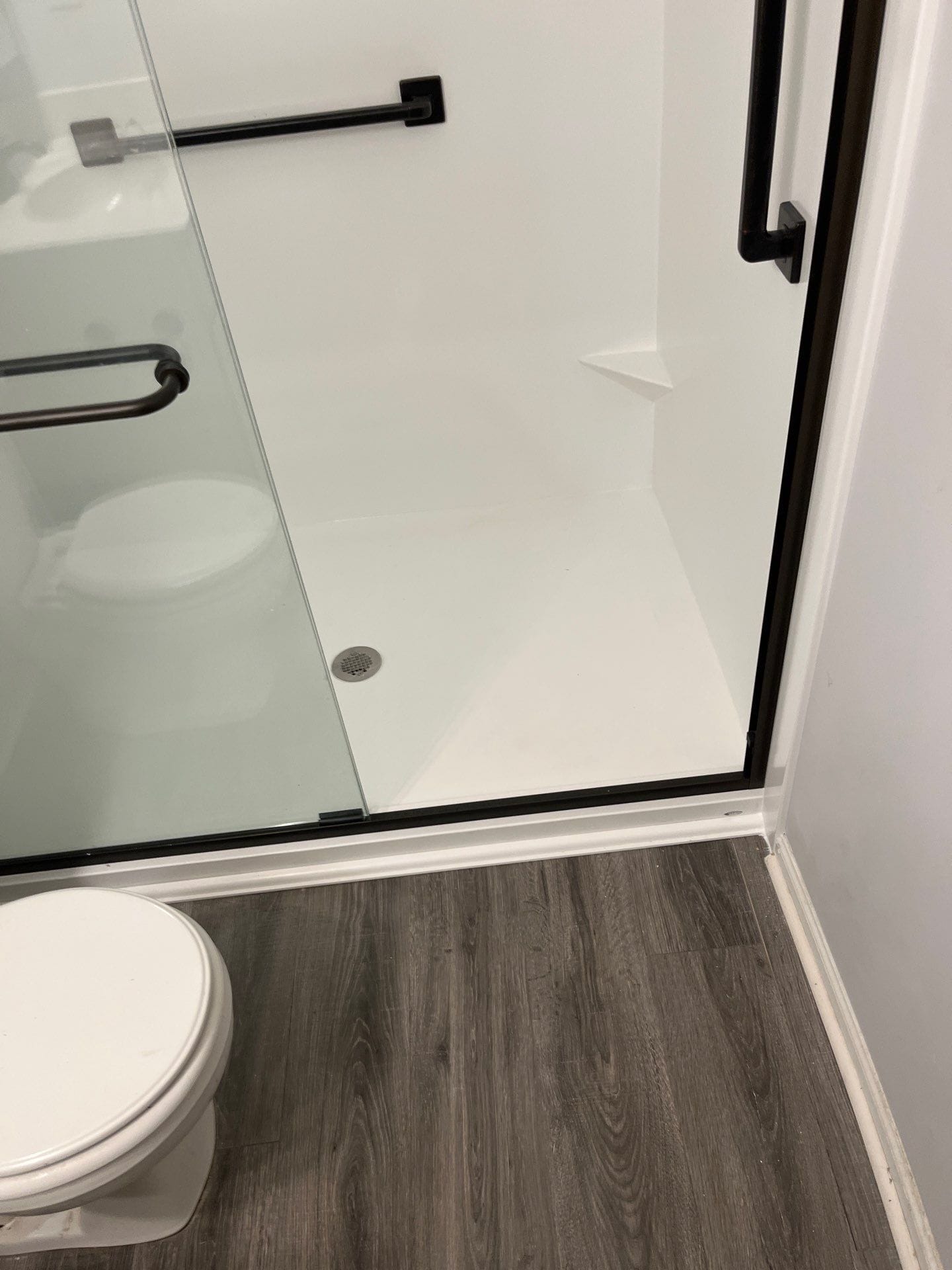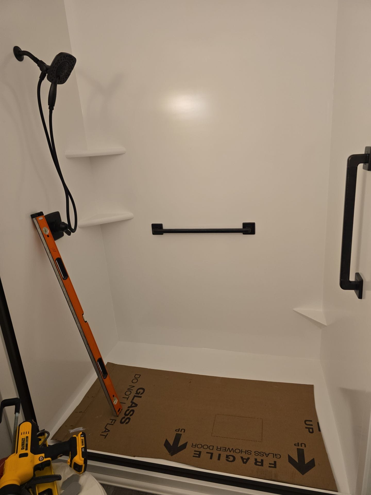 During installation, the existing bathtub and surrounding wall system were removed so the new shower could be constructed on a properly prepared structure. The installation team opened the wall area to access plumbing, allowing water lines and valve components to be inspected and replaced where necessary before installing the waterproof backer board system. The completed shower features smooth solid wall panels, a spacious low-threshold shower base, and a clear glass sliding enclosure with dark hardware that provides a modern contrast against the bright wall surfaces. Additional safety and convenience features include a reinforced grab bar and integrated corner shelving for everyday shower products.
