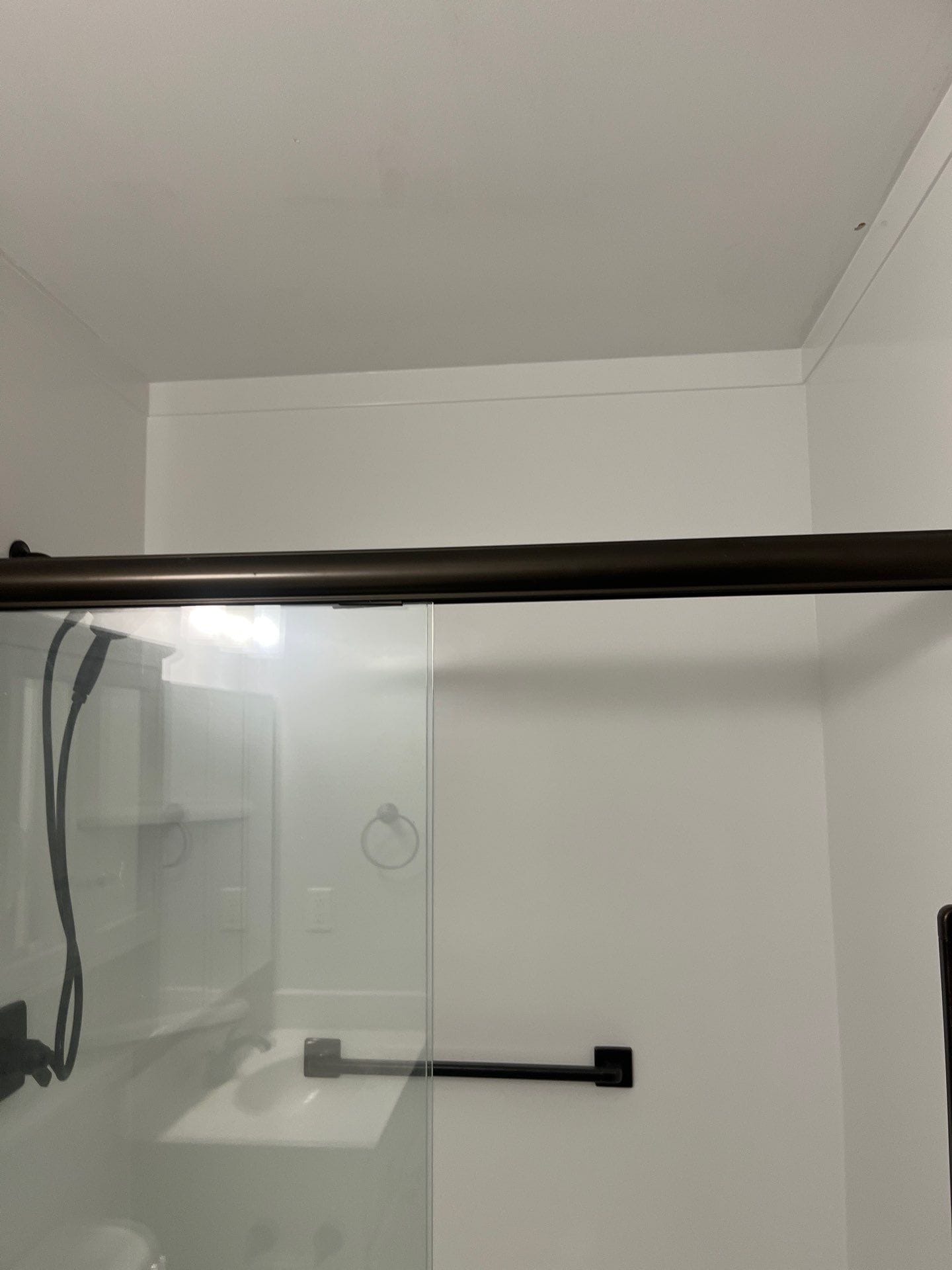 • Clear sliding glass shower enclosure with dark hardware