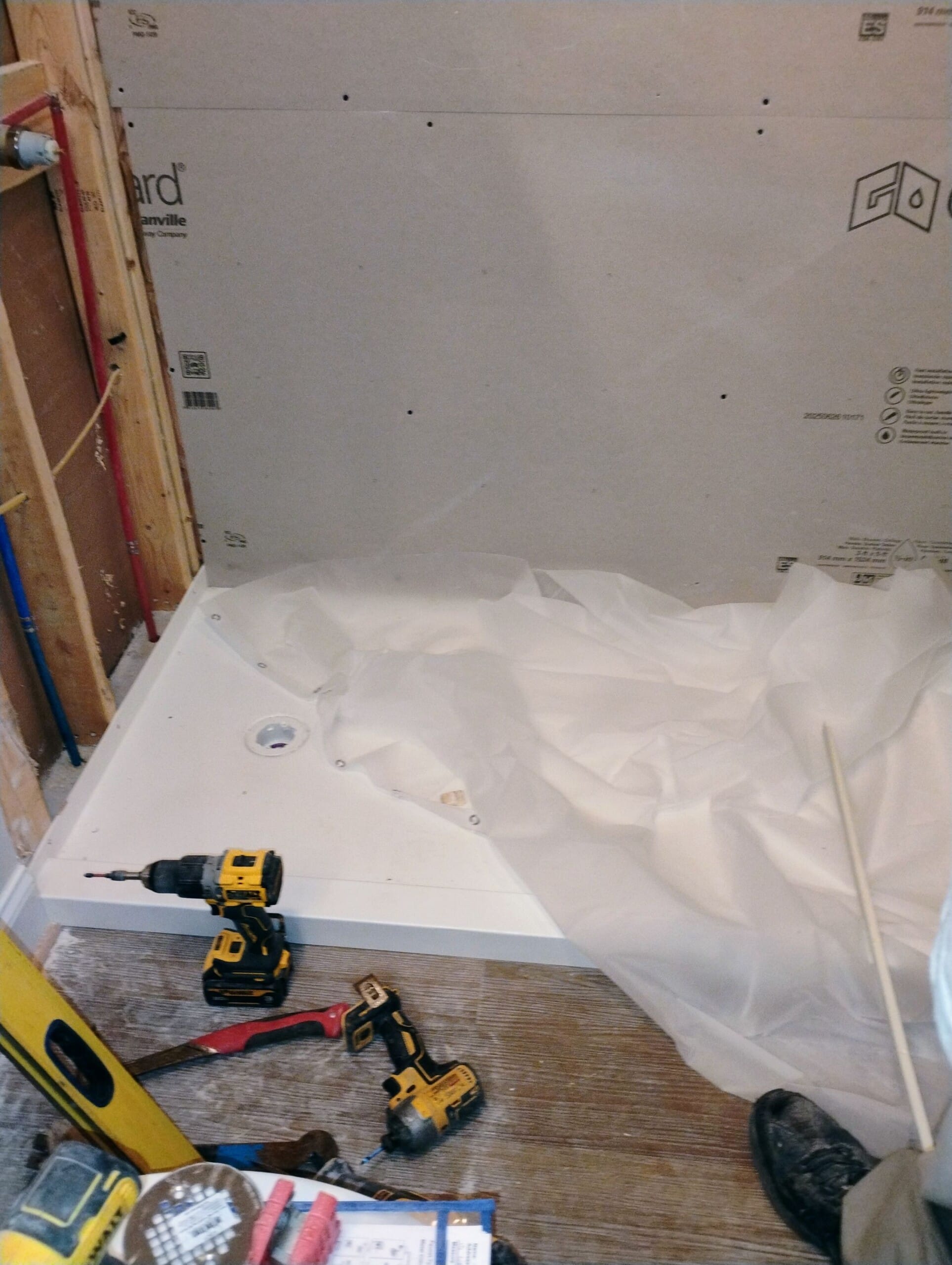 Installation involved complete removal of the original bathtub and wall surround. The new shower base was installed directly into the alcove, with backer board used behind the composite panels to ensure moisture protection. The new wall system extended to the ceiling and was sealed with antimicrobial silicone. Fixtures and accessories were secured to blocking placed during the pre-install walkthrough, and the bypass glass doors were mounted with matte black frame components for added style and function. The remodel was completed in a single day, with full site cleanup performed immediately after.