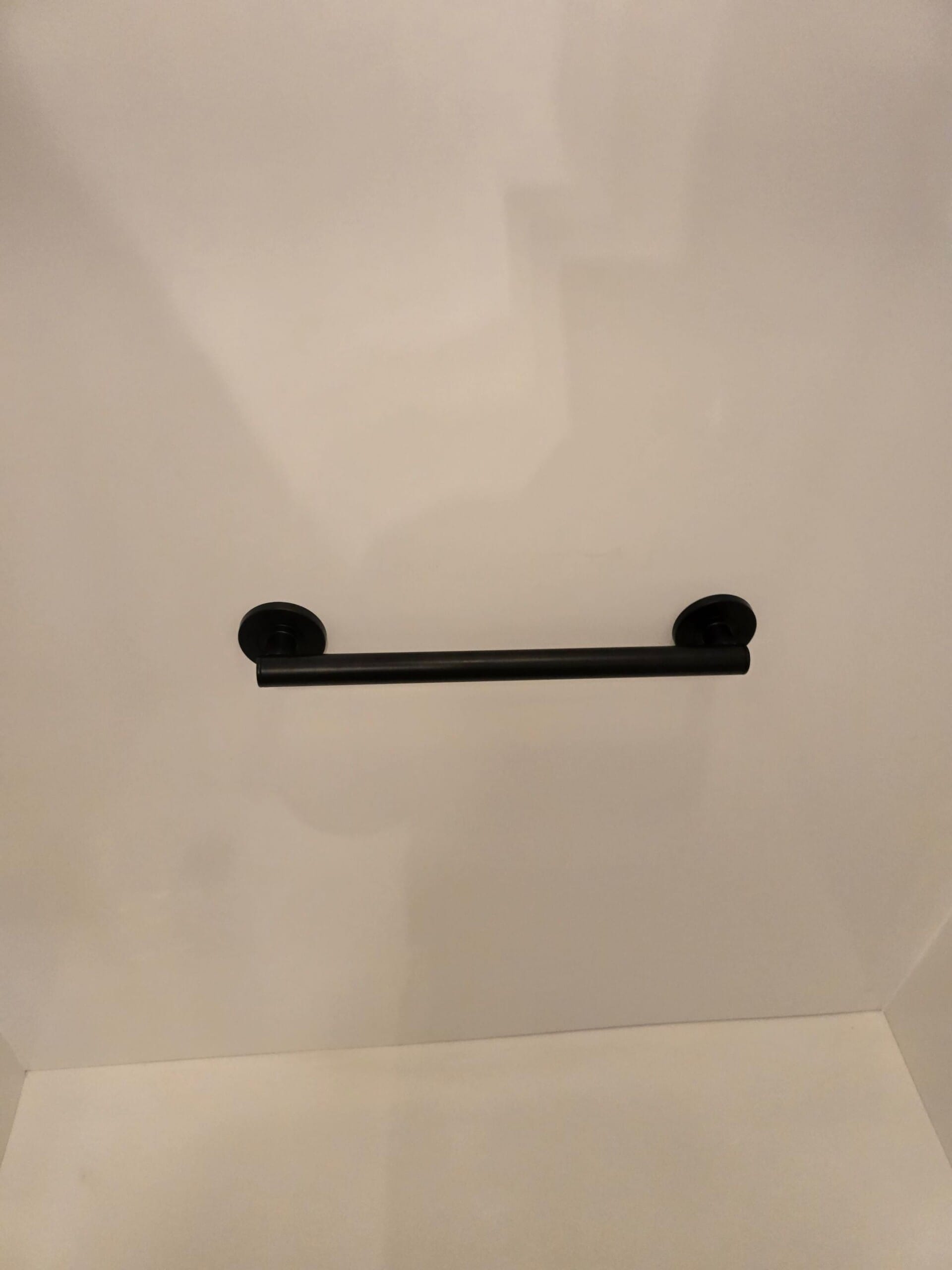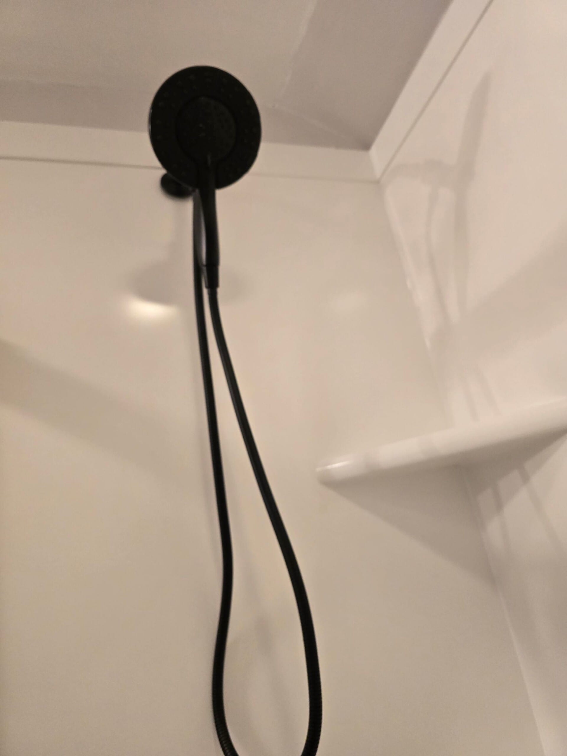 The Five Star Bath Solutions representative proposed a full shower remodel built around a sleek acrylic wall system paired with matte black fixtures for visual contrast. The upgraded enclosure featured a clear-glass sliding door with black framing and dual grab bars for balance and support. A handheld showerhead on a vertical slide rail was included to improve accessibility. Storage solutions included two corner shelves and one recessed shampoo niche, all molded in matching solid-surface material for a unified look. The layout supported modern function while fitting naturally within the room’s existing footprint and color scheme.