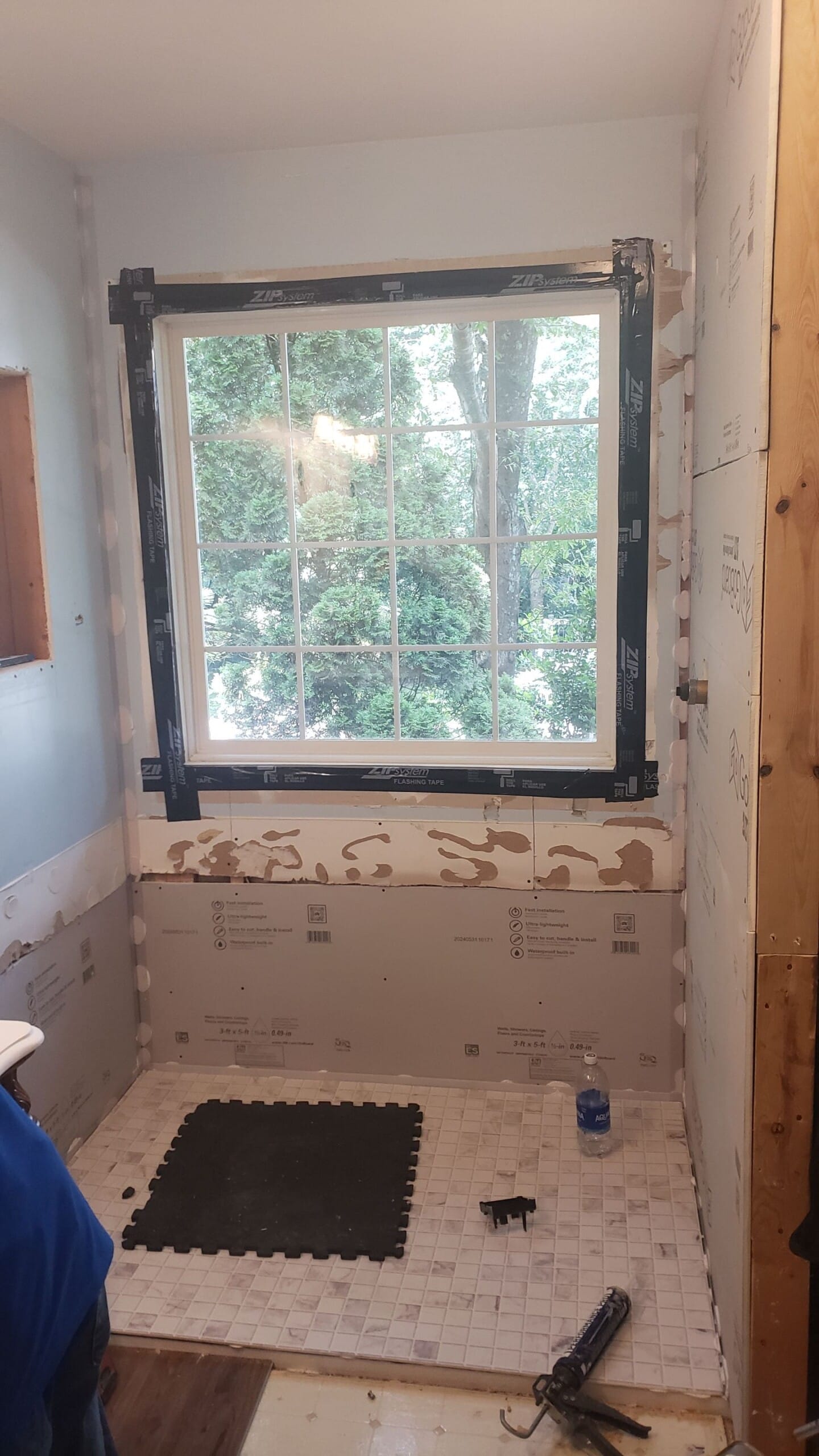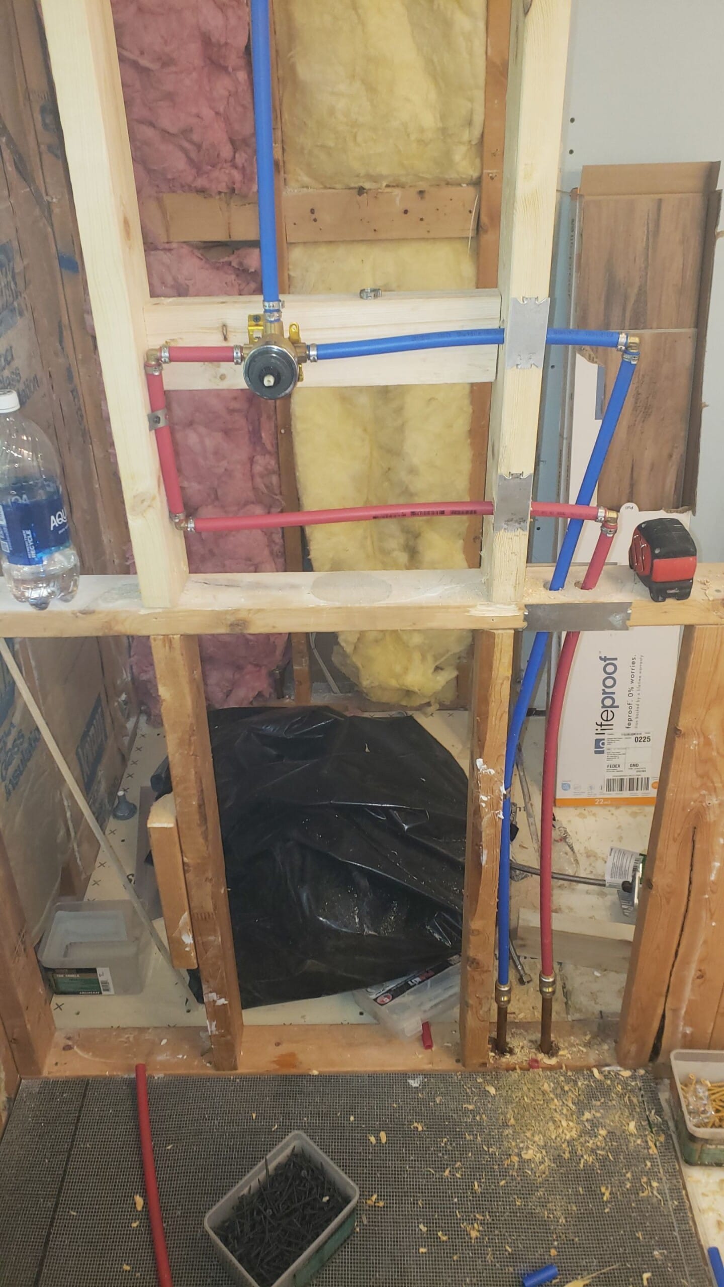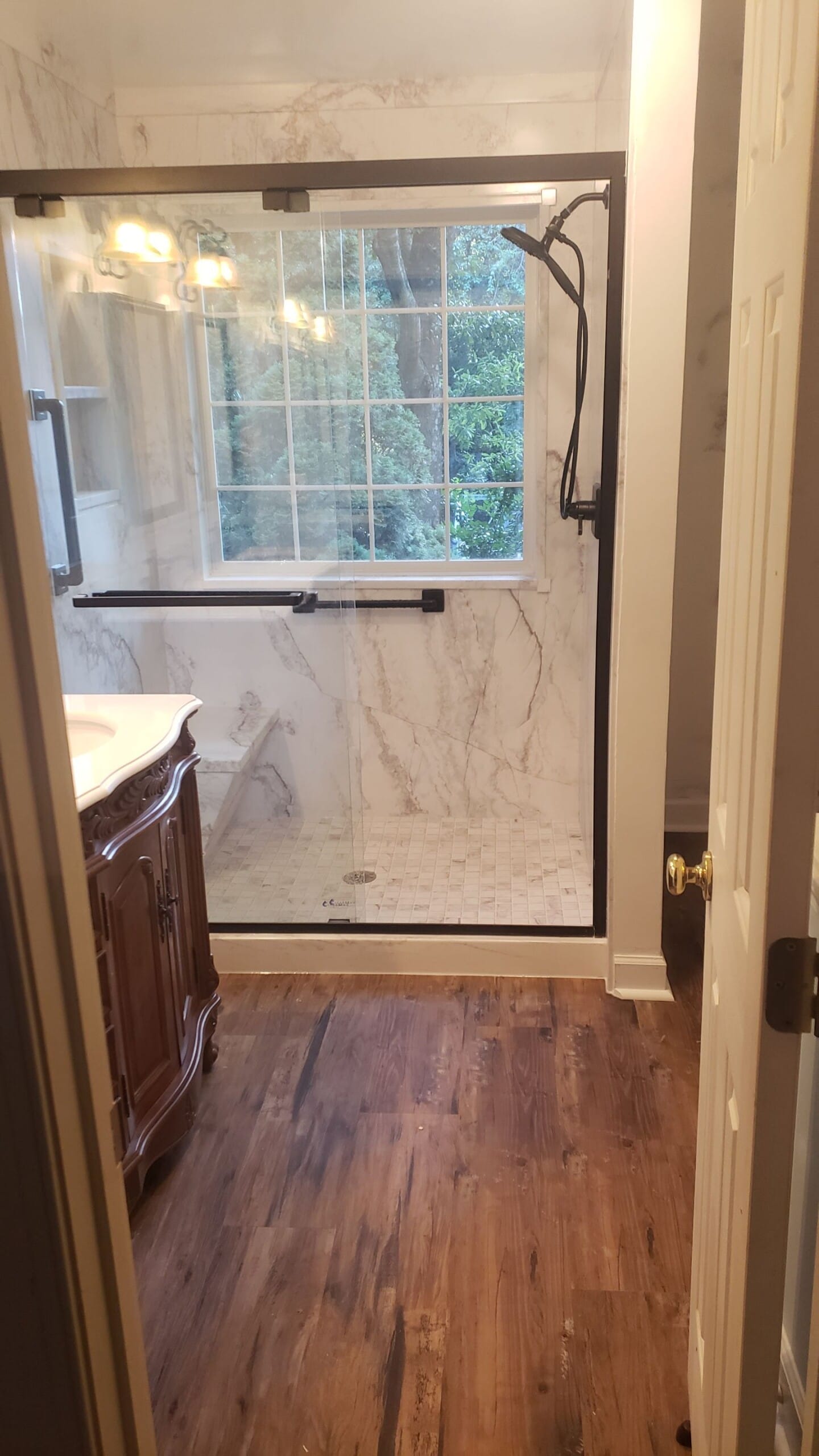 The installation involves full demo down to the studs, addressing mold, mildew, or damaged insulation at no added cost. New plumbing is installed from the trap up, and walls can be extended to the ceiling without additional charges. Most installations are completed in a single day, and the company handles all necessary permits. During the estimate, Tom provided samples and helped the couple select a white base and ceiling with marble-look walls. He also recommended adding an extra holder for the handheld shower at a lower position for convenience.