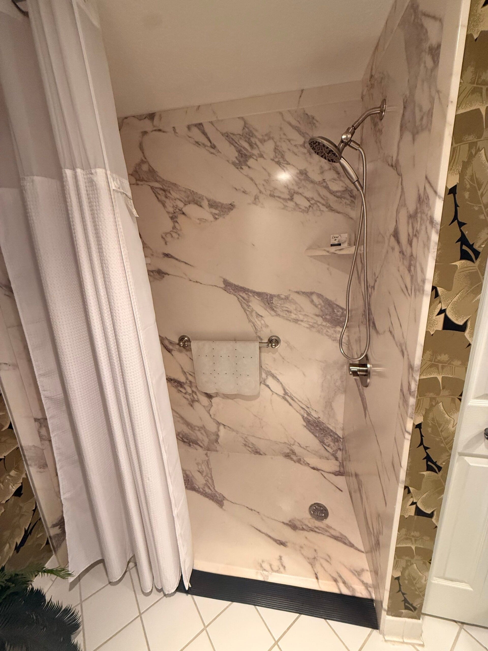 The Representative presented a grout-free antimicrobial composite wall system designed to provide a natural stone appearance without the maintenance of traditional tile. Features include a solid PVC core shower pan with a non-slip finish and high-quality hardware in a brushed finish. The company's commitment to using certified professionals and a direct partnership with the manufacturer ensures a high standard of authority and reliability for the project.