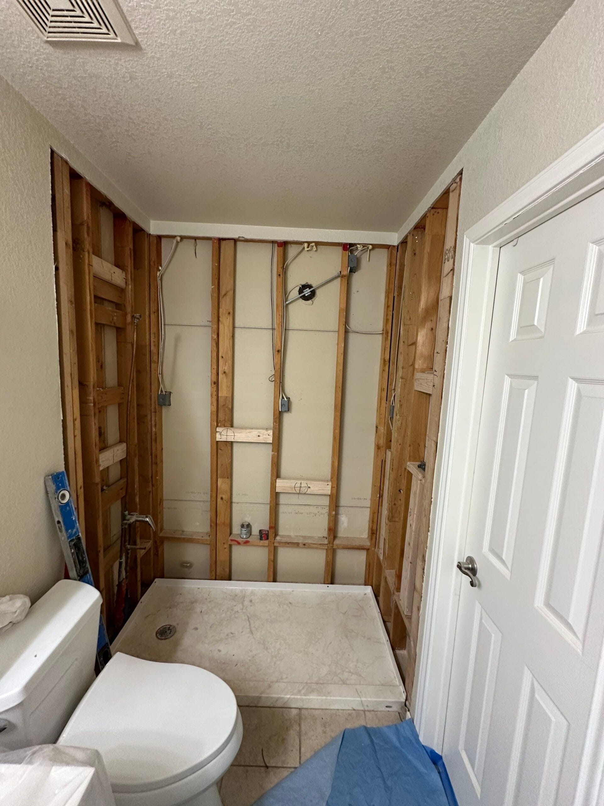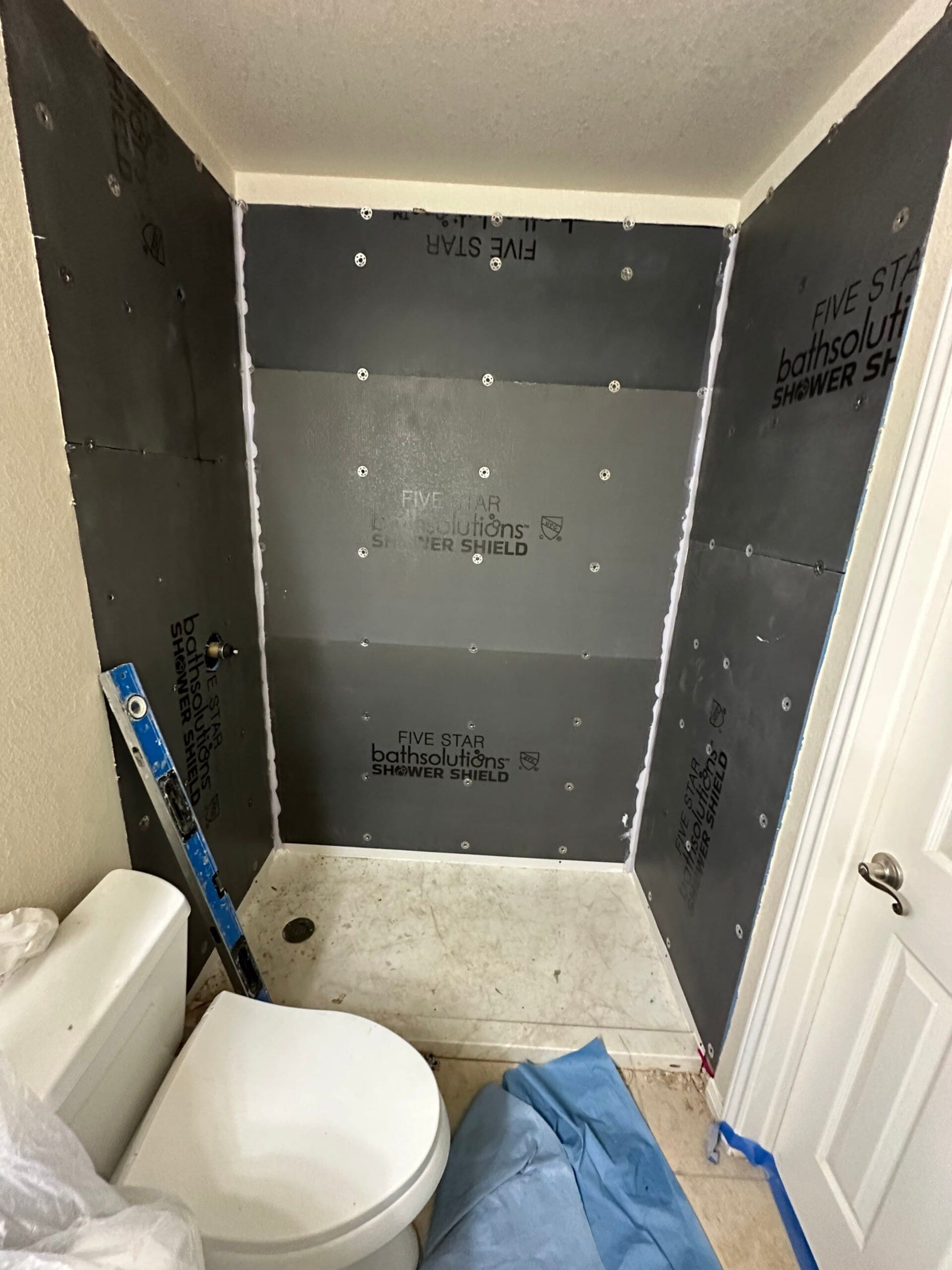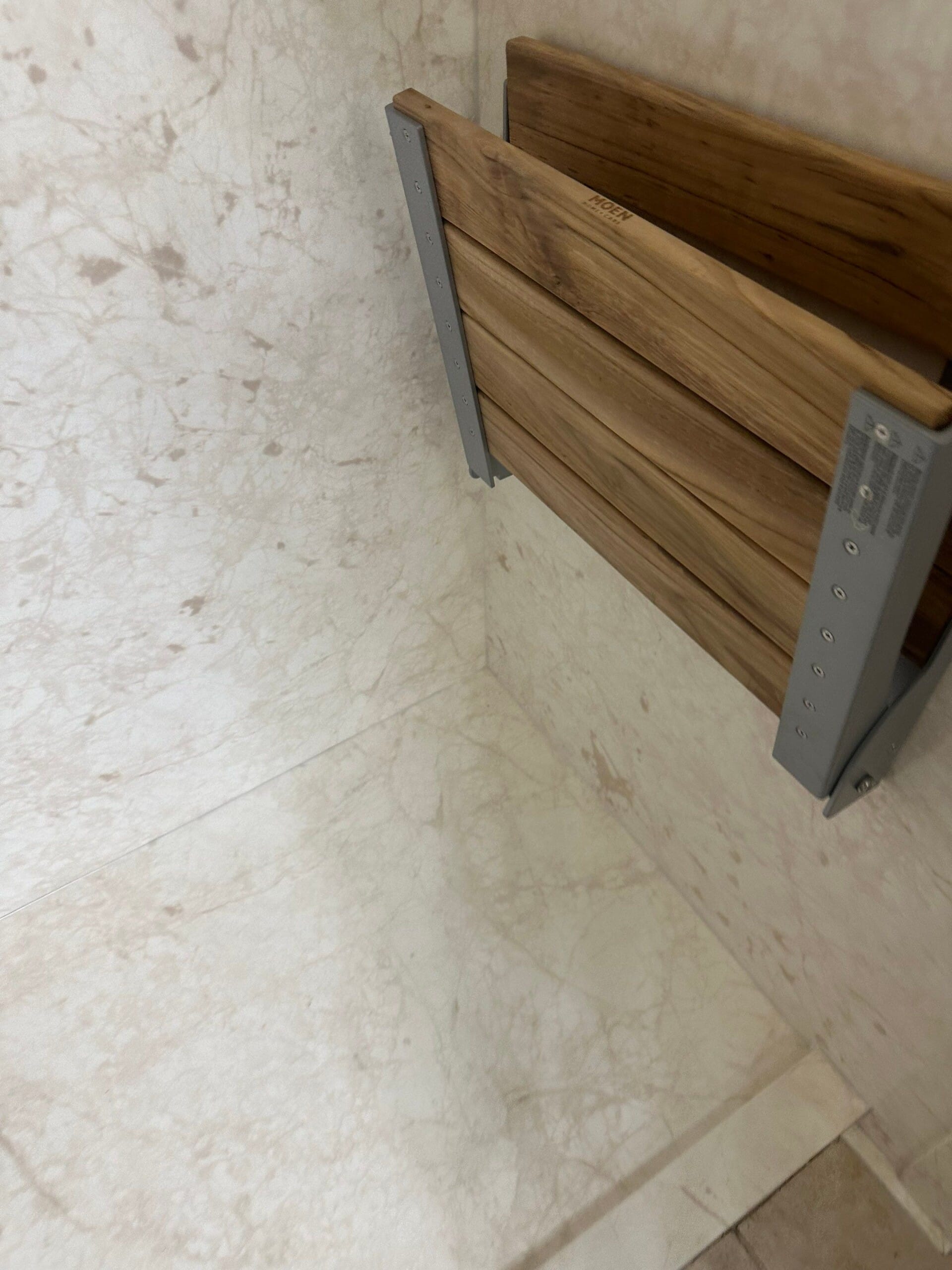 Installation involved a full removal of the existing tub and tile, with demolition down to the studs, moisture check, and plumbing updates included. The crew installed a reinforced, non-slip, thermal-insulated shower base and waterproof Shower Shield wall backer before mounting the composite walls. Features included a fold-down teak bench, two chrome grab bars with reinforced support, a corner shelf, and a handheld showerhead on a vertical slide. All seams were sealed with antimicrobial silicone for durability. The worksite was cleaned and cleared within two days.